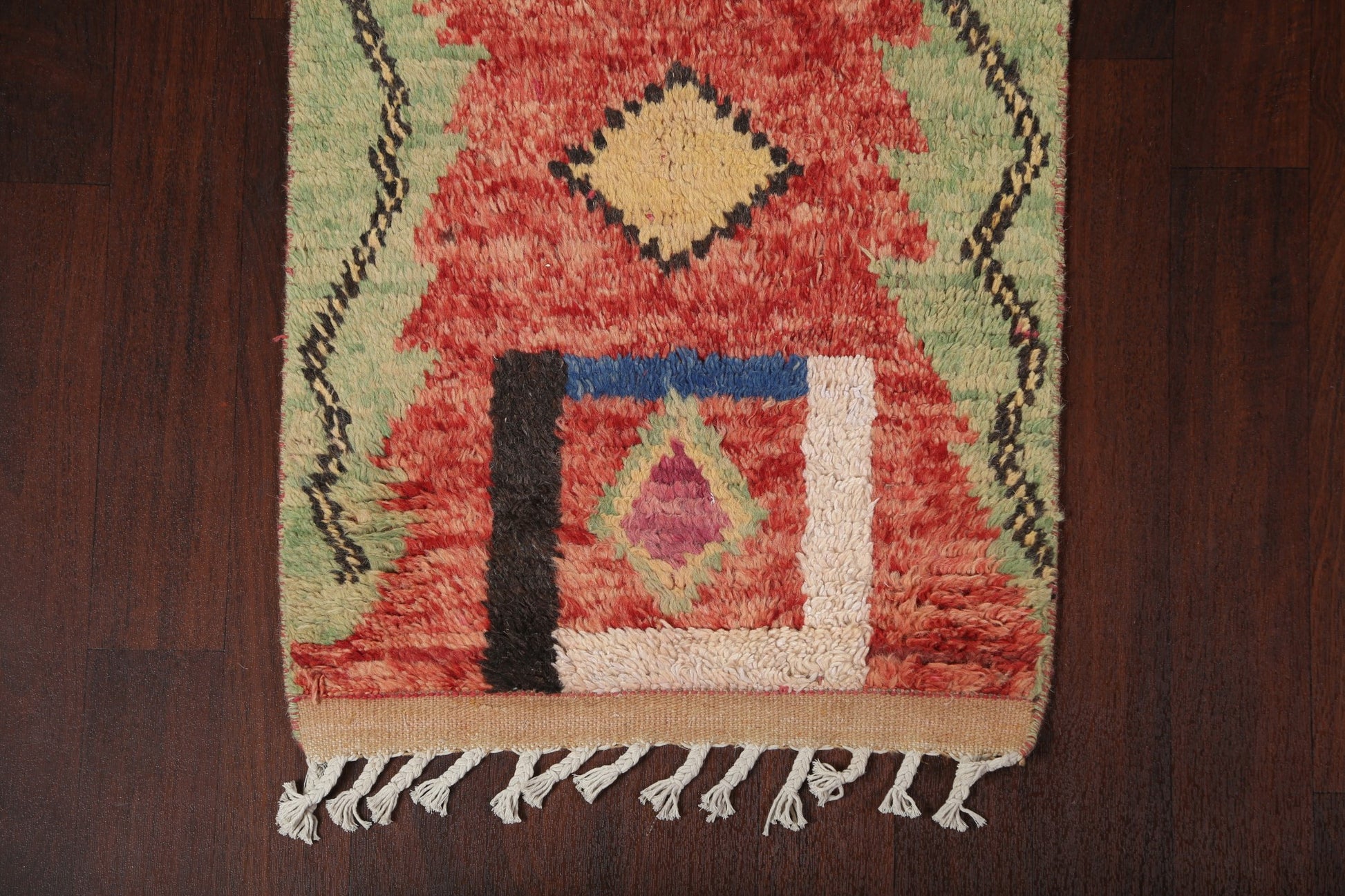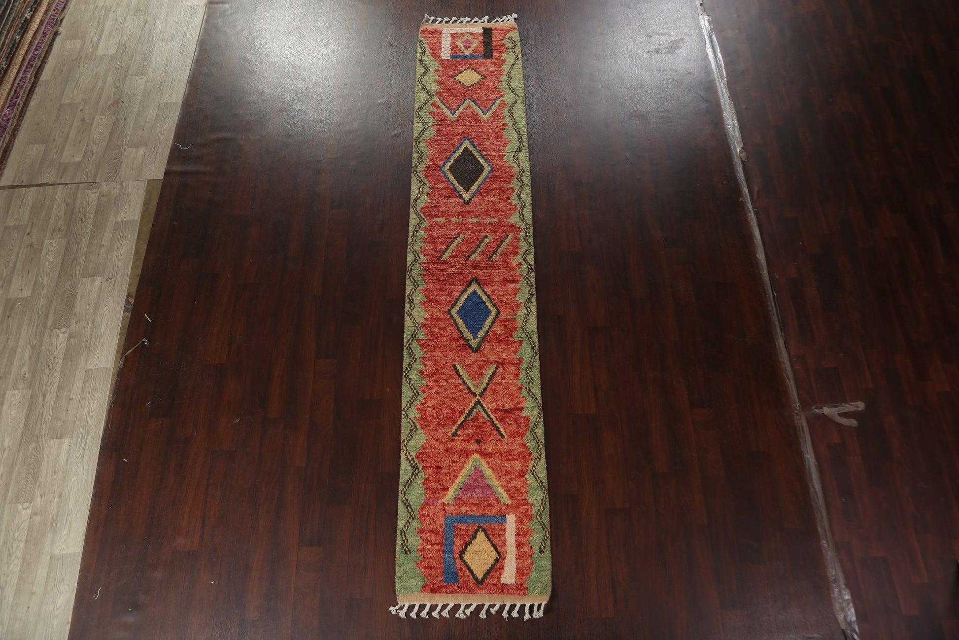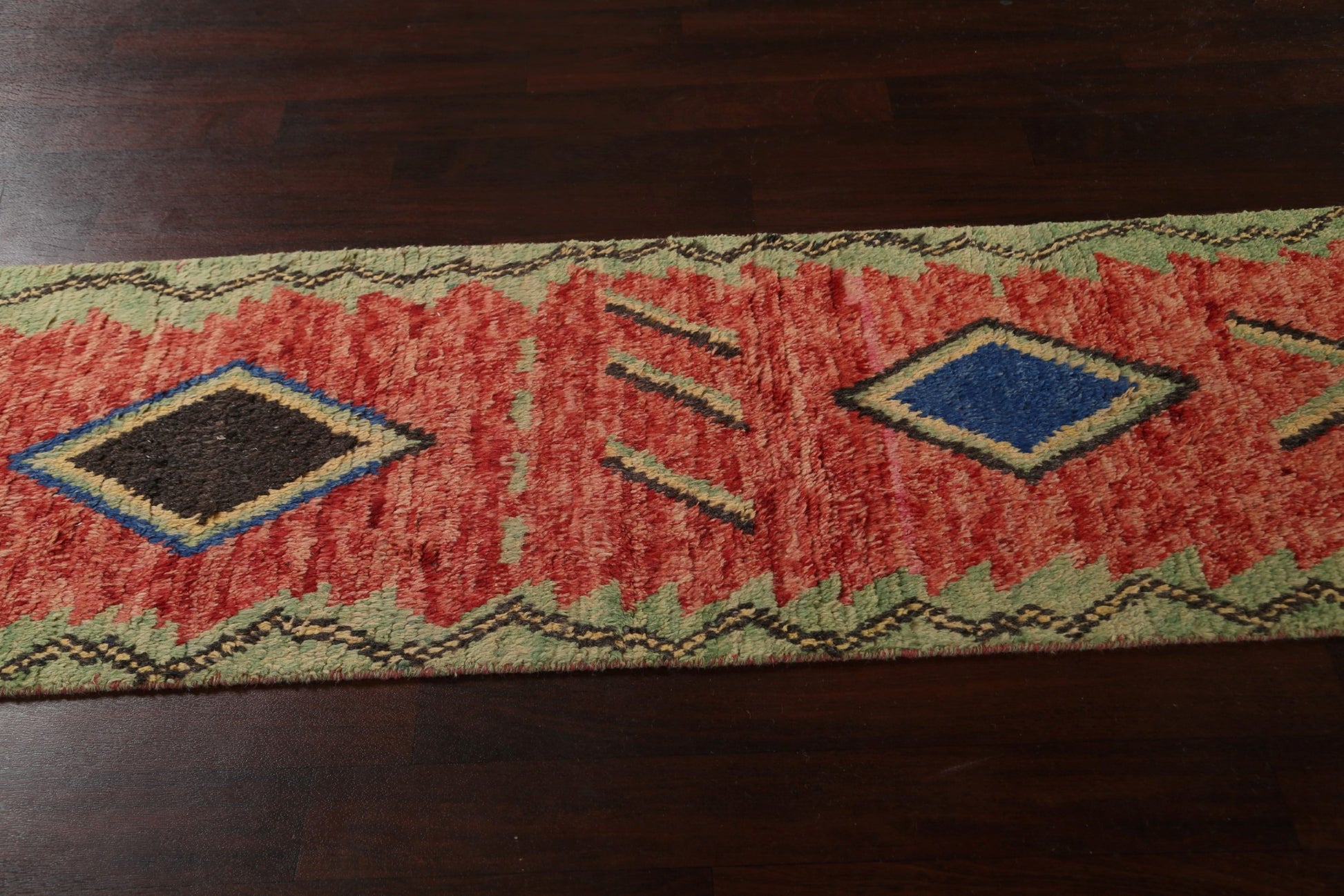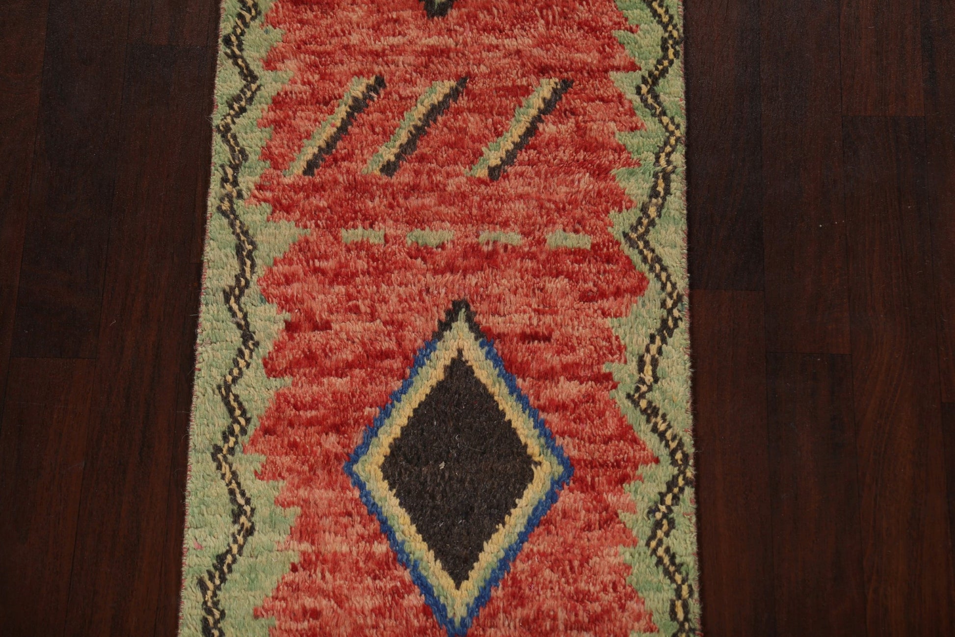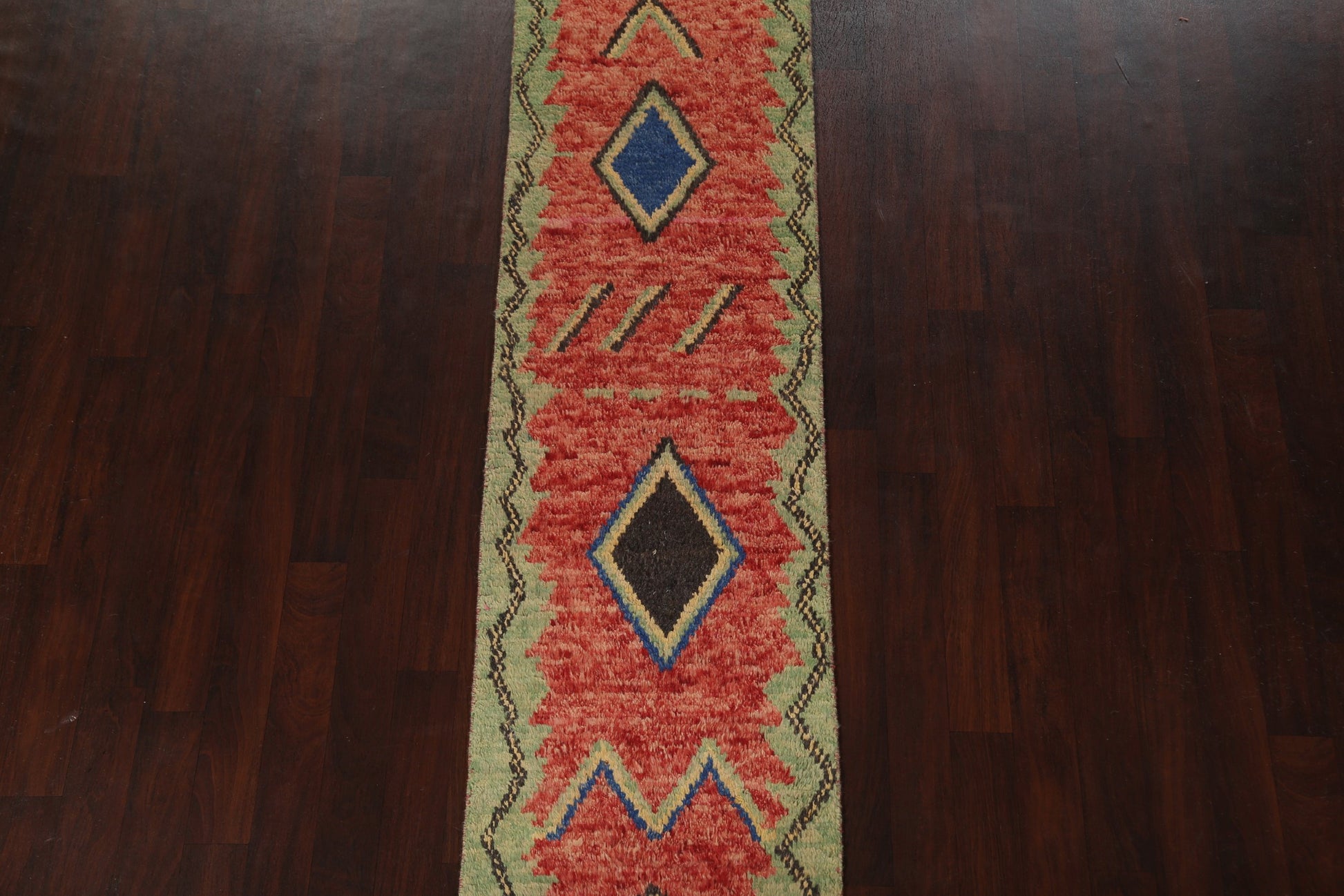 A Beautiful Genuine Morocco Moroccan rug is Hand Knotted by skillful weavers in Morocco with 100% Wool Material. This rug is in New, First Quality condition. dimensions are 12' 9'' X 2' 5'' in foot and 389 X 74 in centimeter. the primary color is Red.