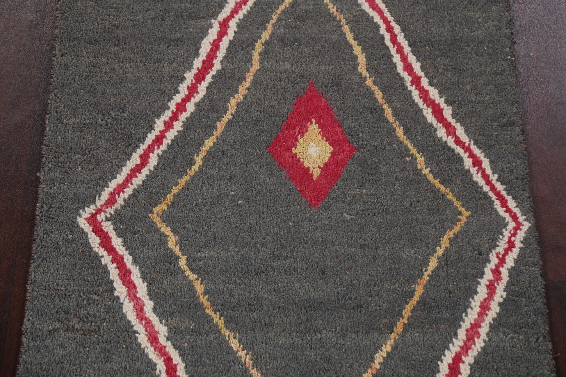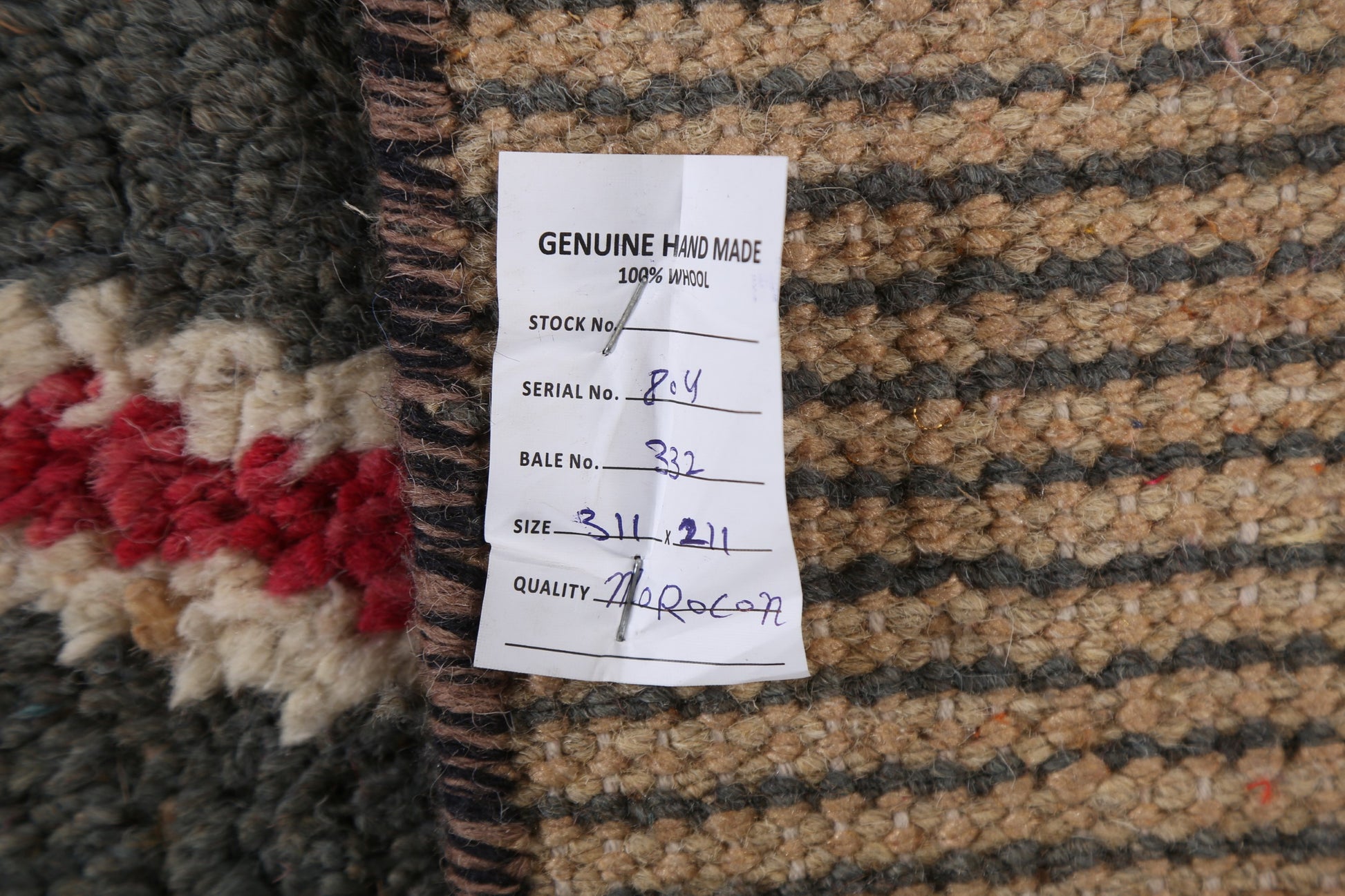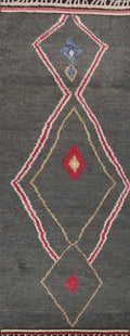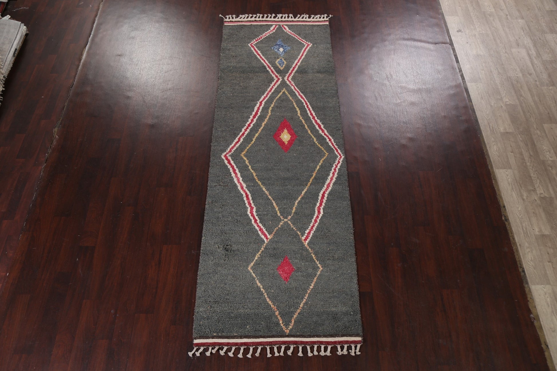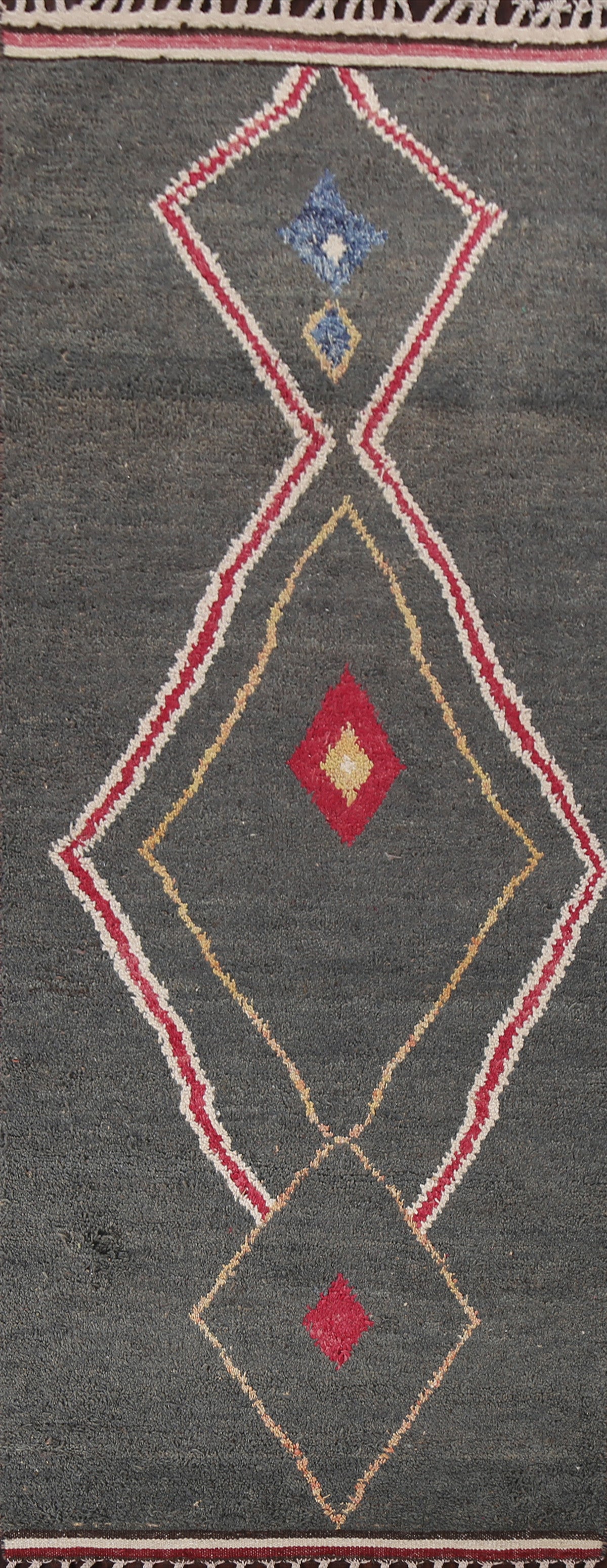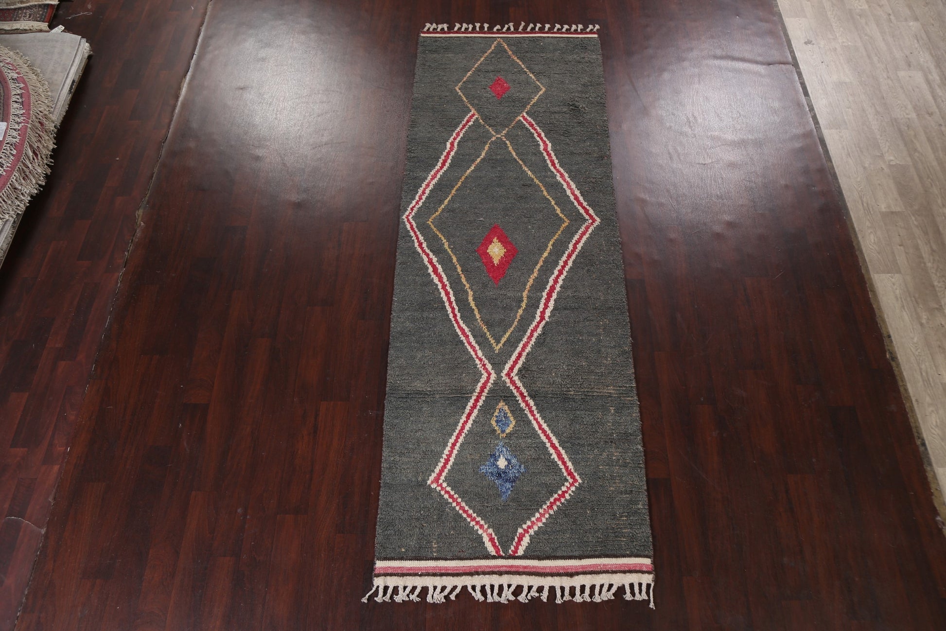 A Beautiful Genuine Morocco Moroccan rug is Hand Knotted by skillful weavers in Morocco with 100% Wool Material. This rug is in New, First Quality condition. dimensions are 10' 10'' X 3' 8'' in foot and 330 X 112 in centimeter. the primary color is Greys & Charcoal.