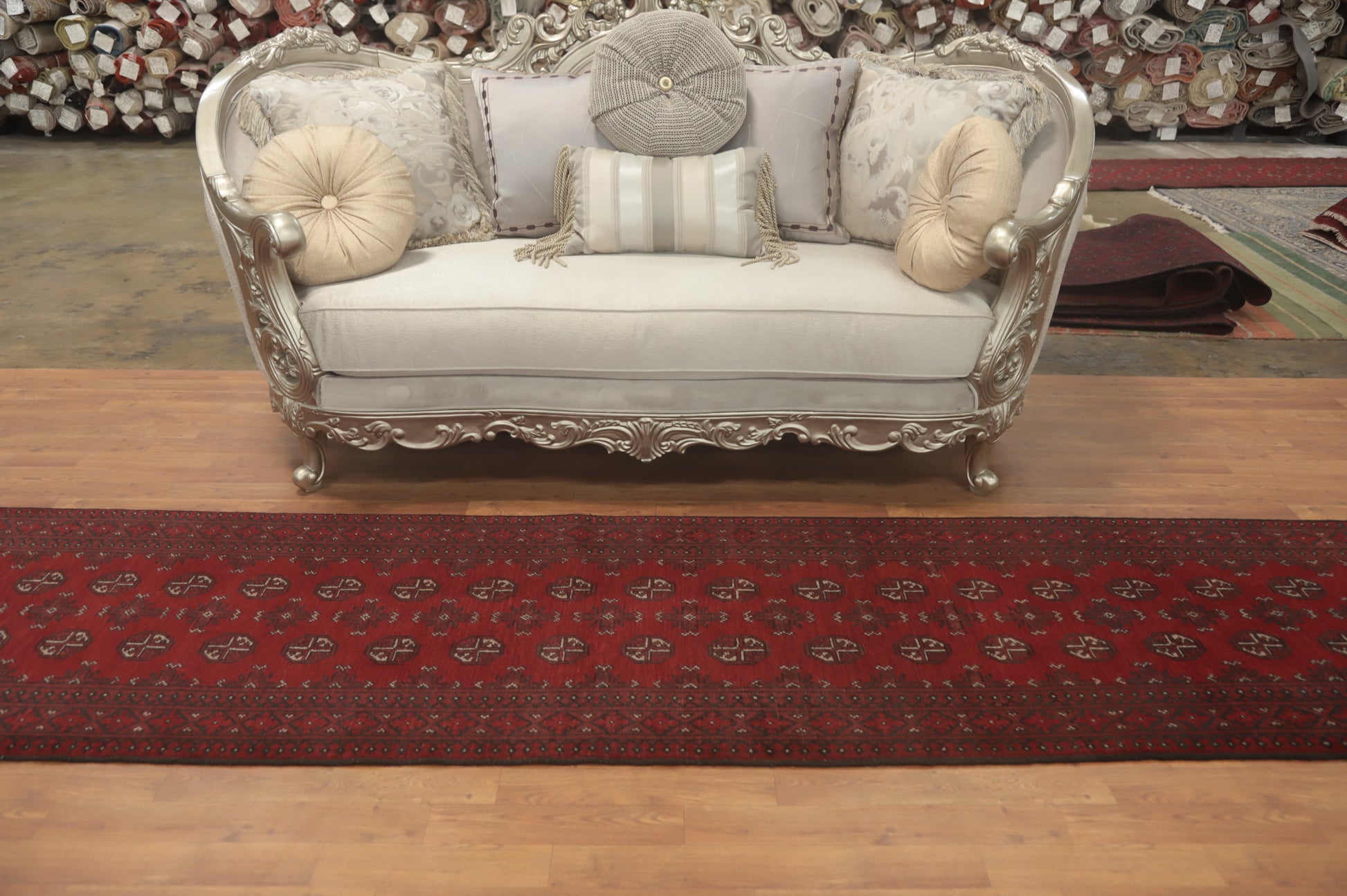 A Beautiful Genuine Afghanistan Balouch rug is Hand Knotted by skillful weavers in Afghanistan with 100% Wool Material. This rug is in New, First Quality condition. dimensions are 13' 0'' X 2' 9'' in foot and 396 X 84 in centimeter. the primary color is Red.