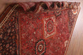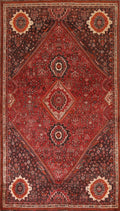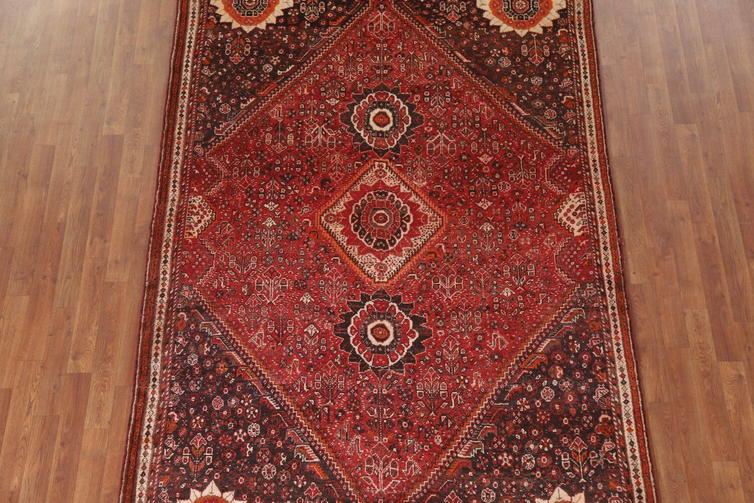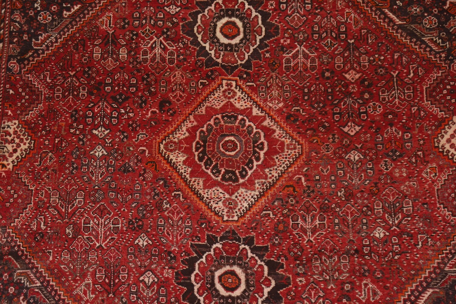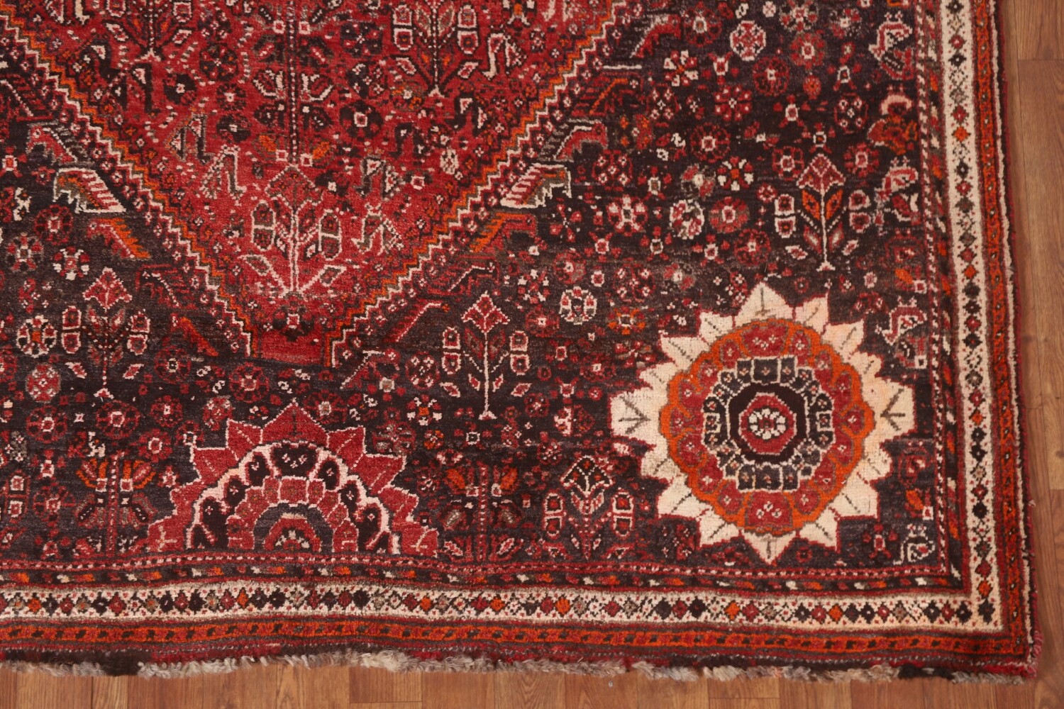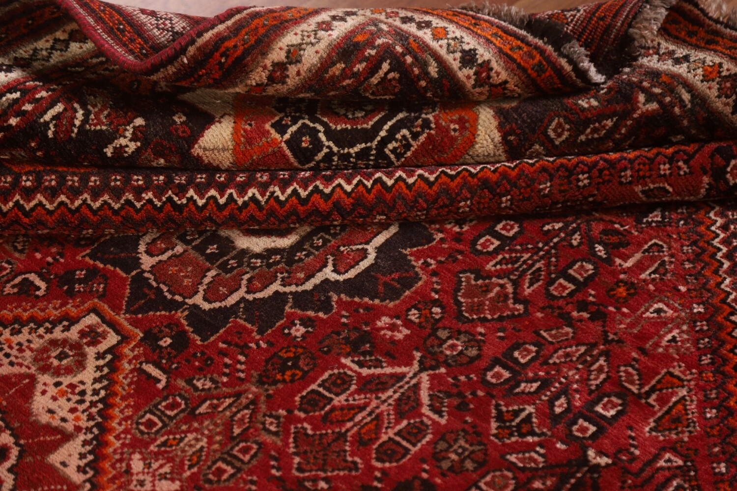 A Beautiful Genuine Persia ( Persia ) Shiraz rug is Hand Knotted by skillful weavers in Persia ( Persia ) with 100% Wool Material. This rug is in Very Good condition. dimensions are 9' 5'' X 5' 7'' in foot and 287 X 170 in centimeter. the primary color is Red.