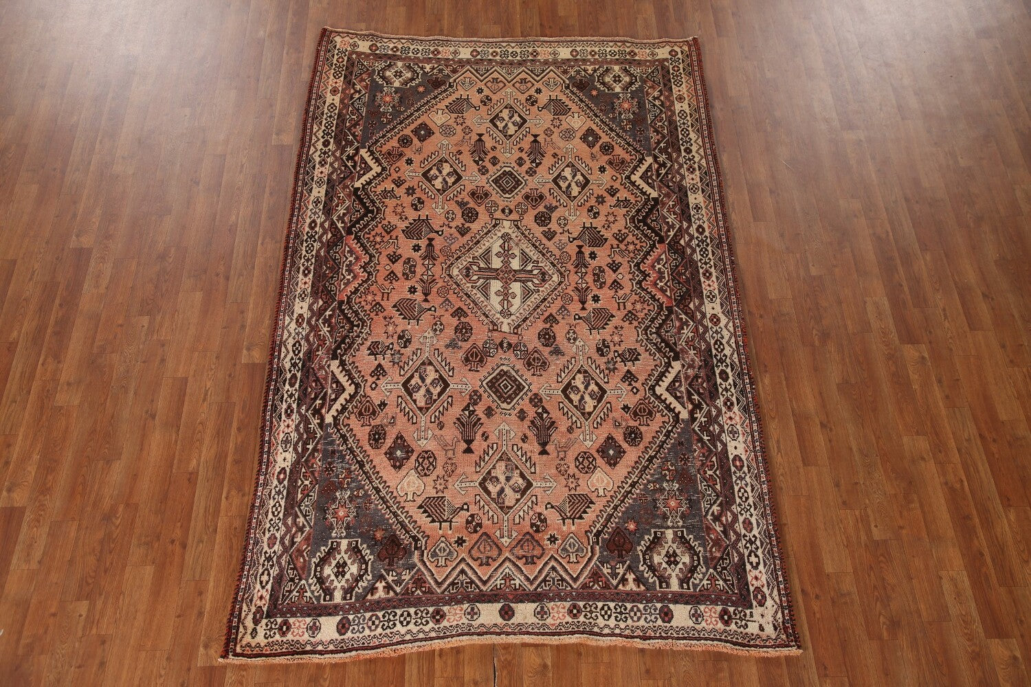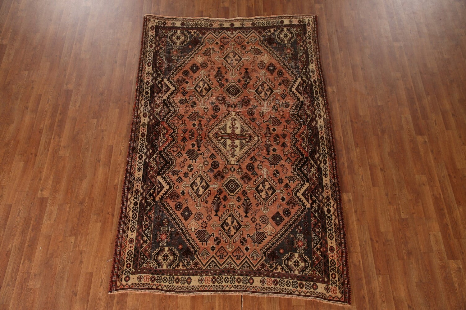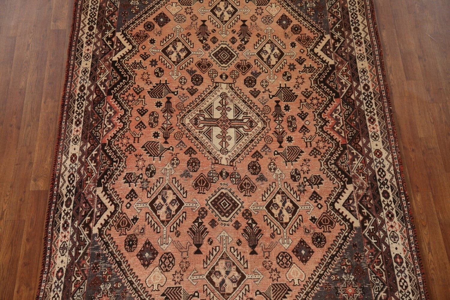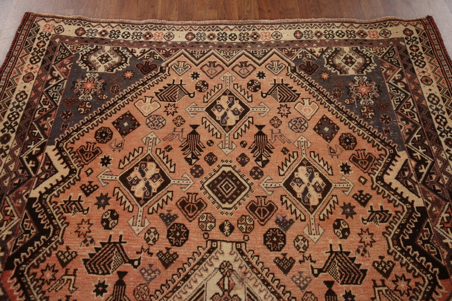 A Beautiful Genuine Persia ( Persia ) Shiraz rug is Hand Knotted by skillful weavers in Persia ( Persia ) with 100% Wool Material. This rug is in Very Good (Evenly Low Pile) condition. dimensions are 8' 4'' X 5' 4'' in foot and 254 X 163 in centimeter. the primary color is Peach.
