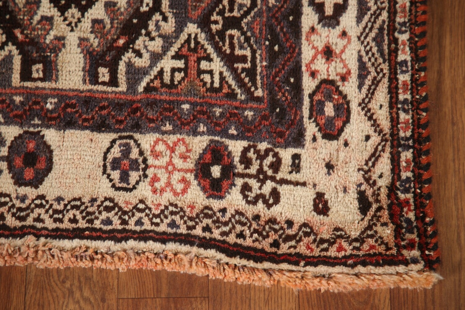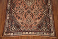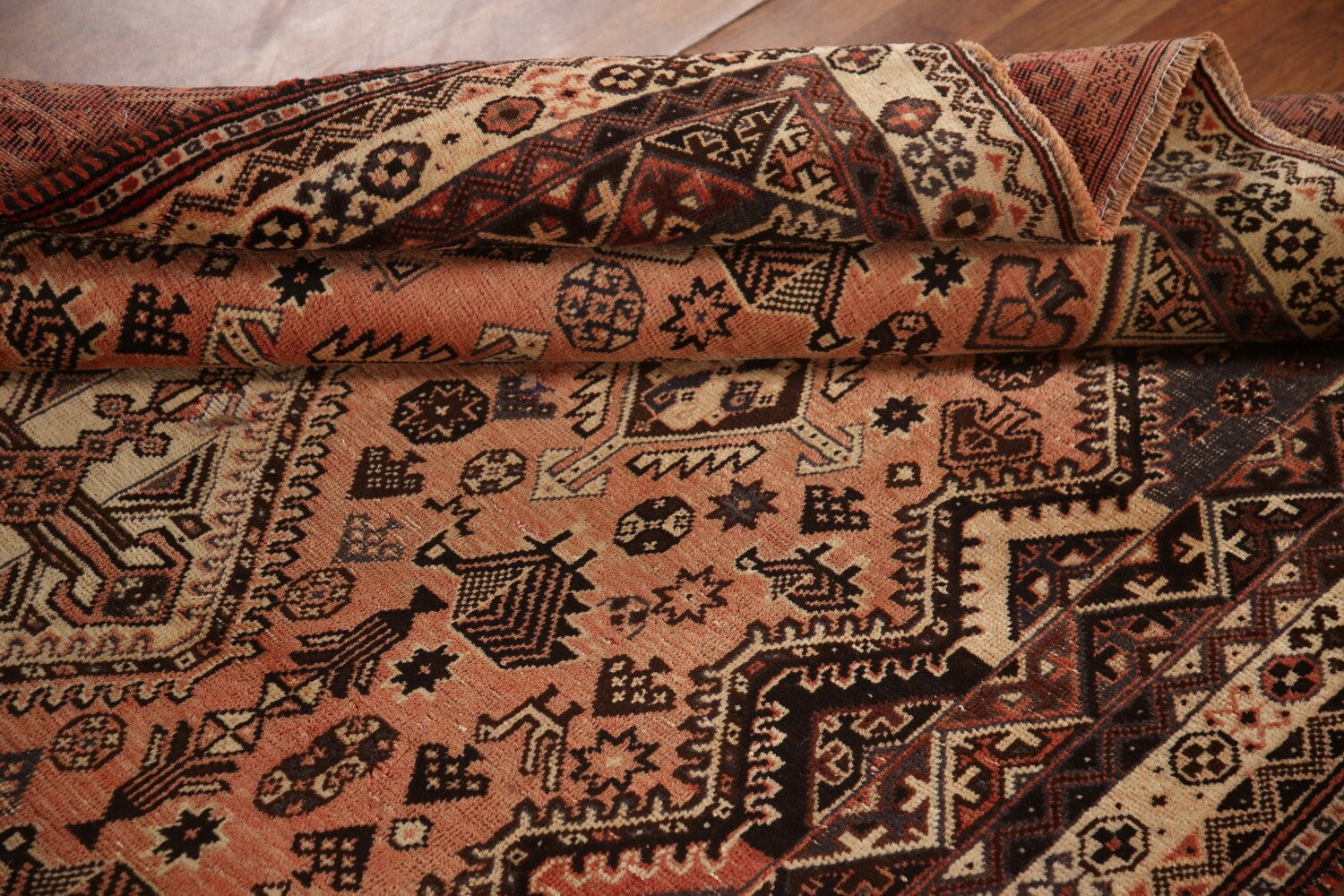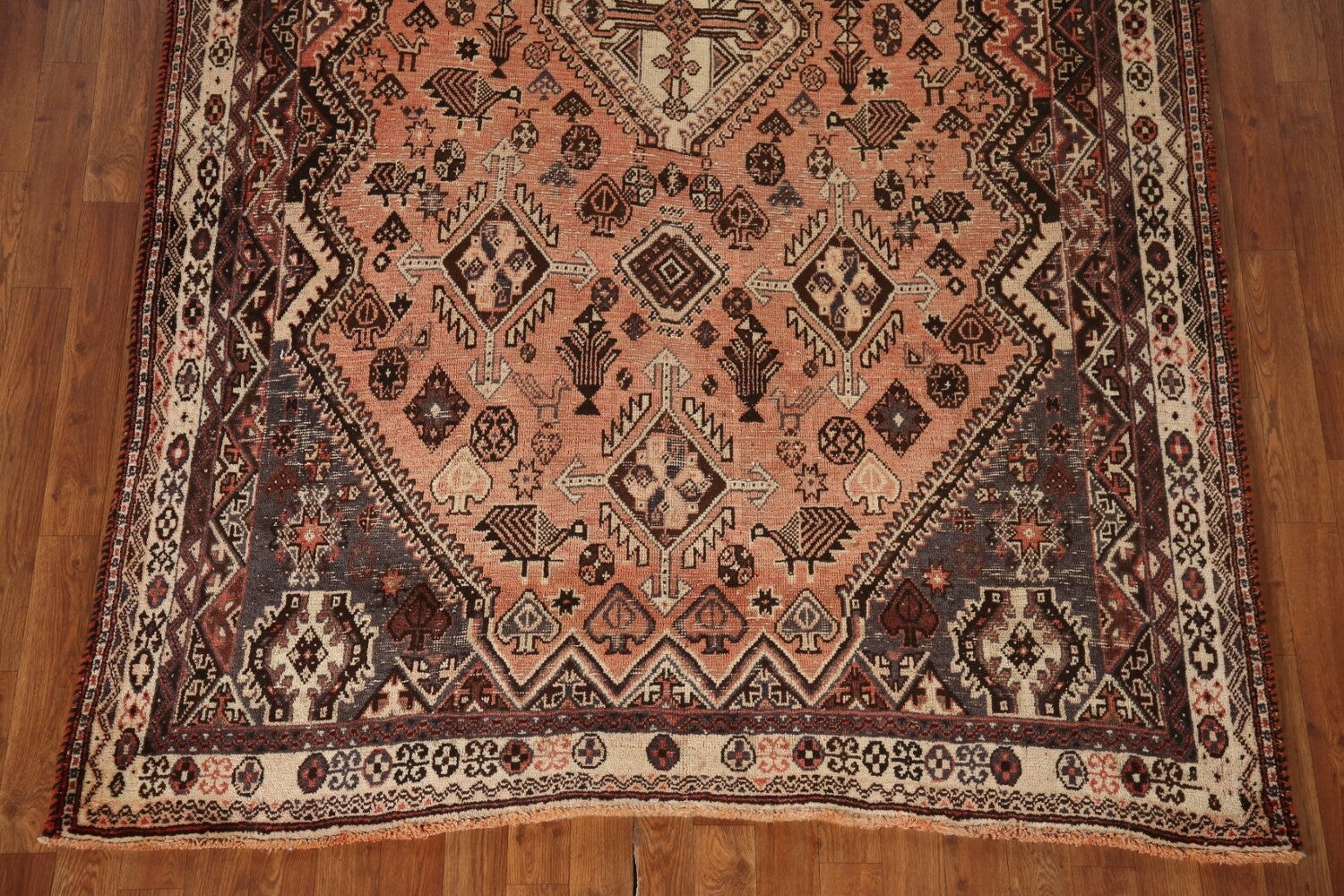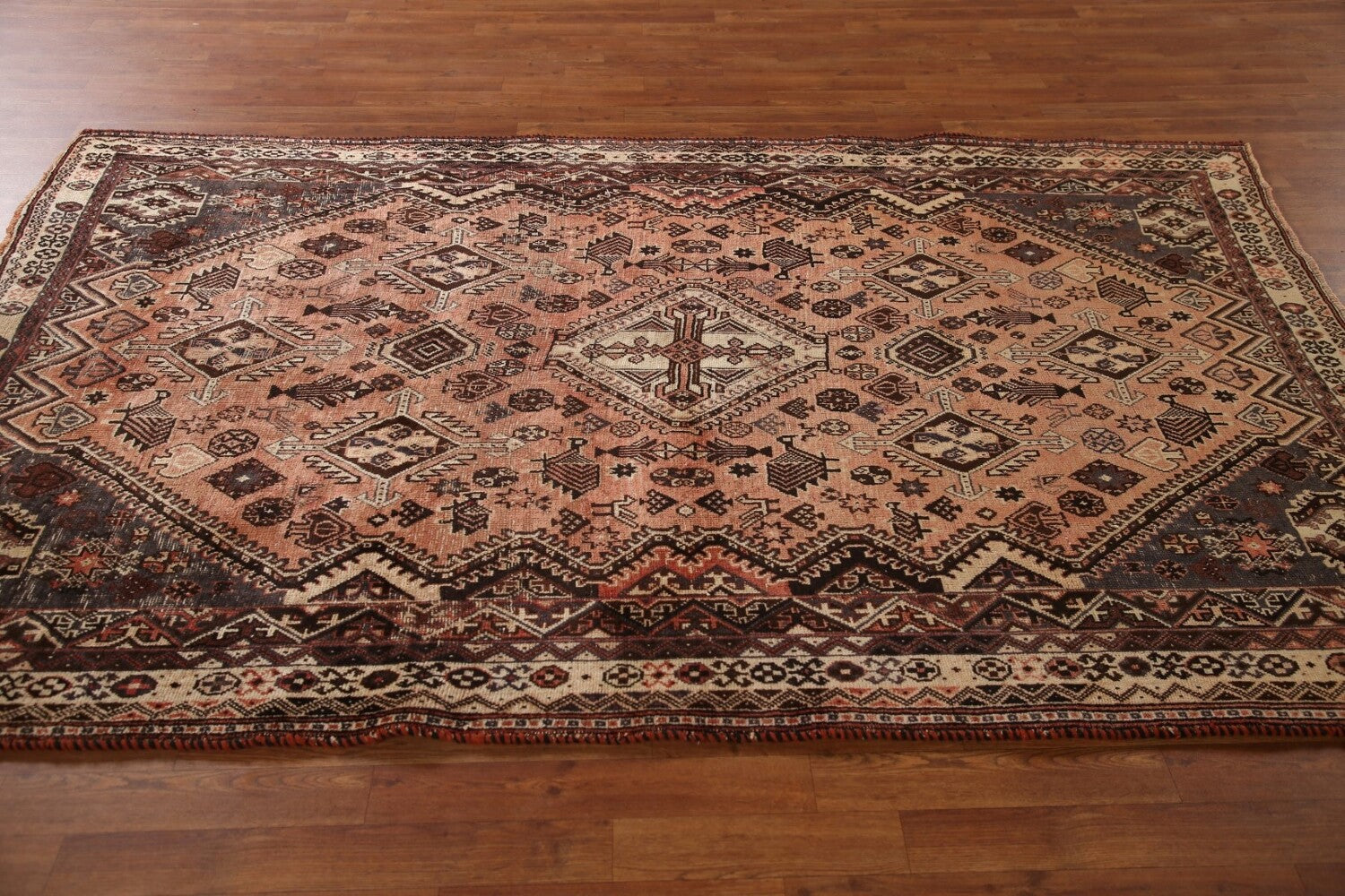 A Beautiful Genuine Persia ( Persia ) Shiraz rug is Hand Knotted by skillful weavers in Persia ( Persia ) with 100% Wool Material. This rug is in Very Good (Evenly Low Pile) condition. dimensions are 8' 4'' X 5' 4'' in foot and 254 X 163 in centimeter. the primary color is Peach.