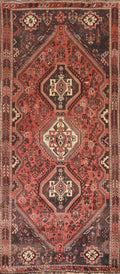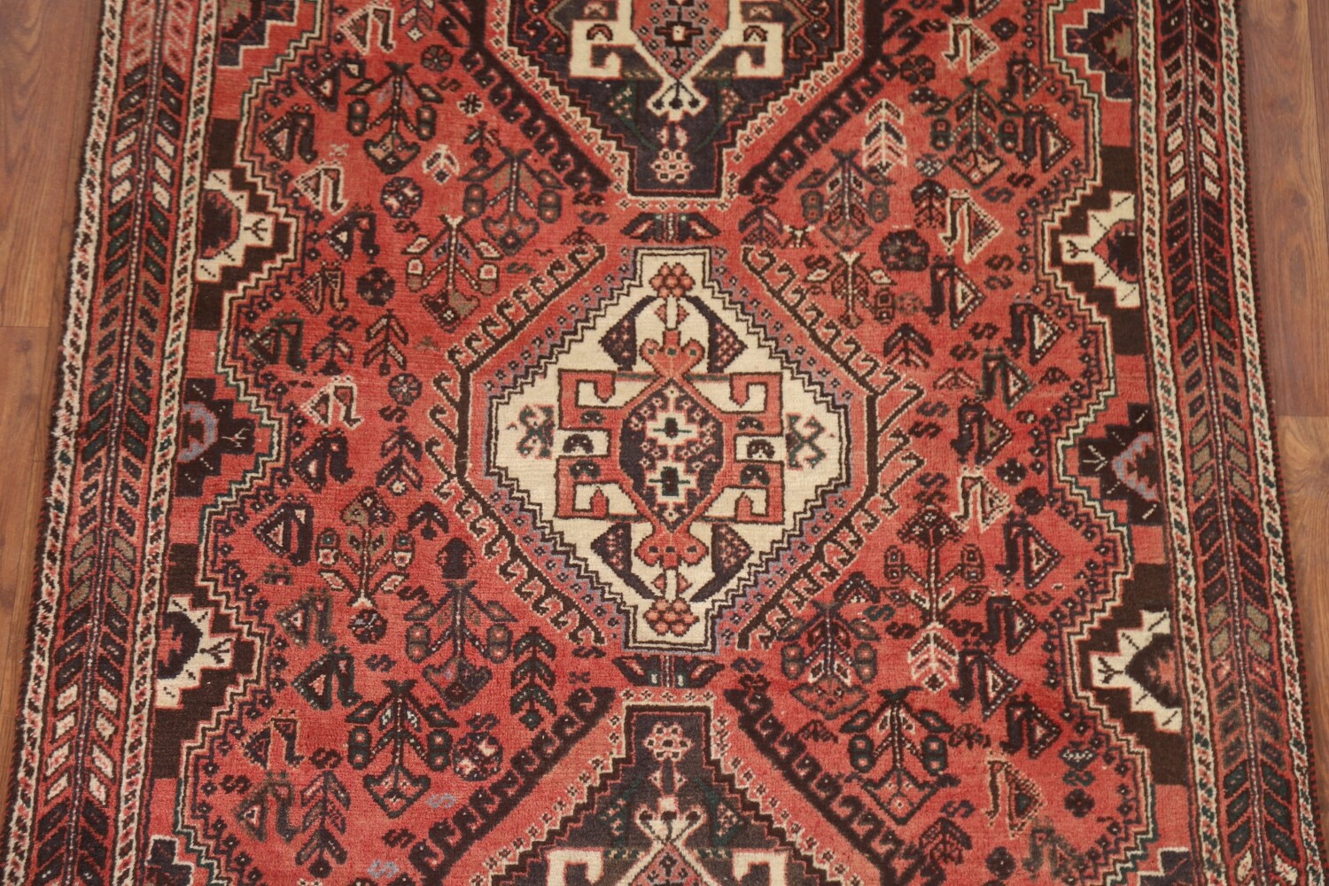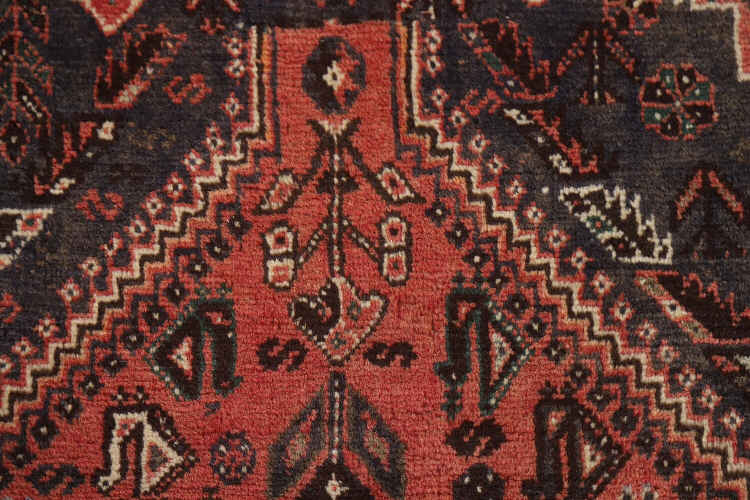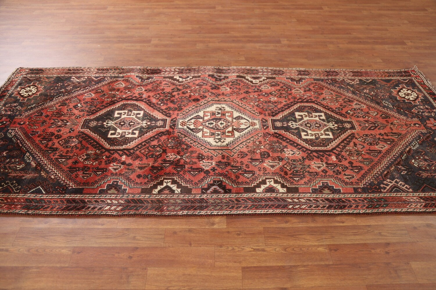 A Beautiful Genuine Persia ( Persia ) Shiraz rug is Hand Knotted by skillful weavers in Persia ( Persia ) with 100% Wool Material. This rug is in Very Good condition. dimensions are 9' 1'' X 3' 10'' in foot and 277 X 117 in centimeter. the primary color is Red.