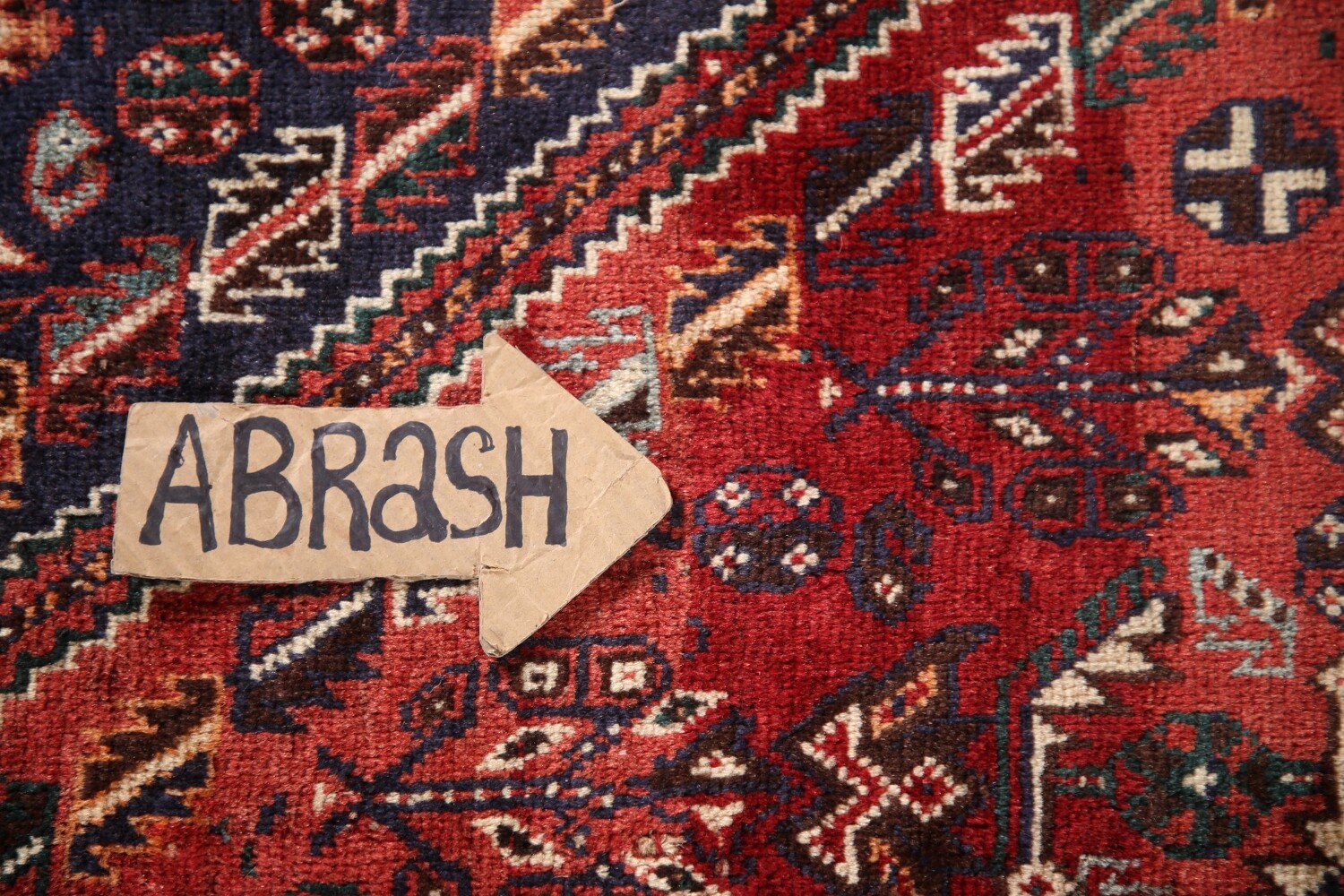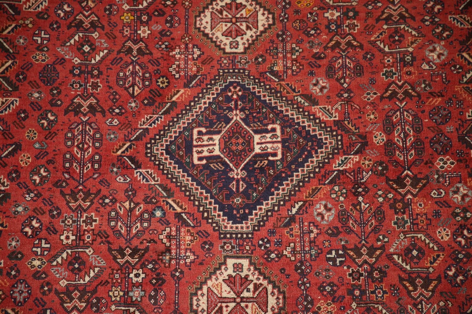 A Beautiful Genuine Persia ( Persia ) Shiraz rug is Hand Knotted by skillful weavers in Persia ( Persia ) with 100% Wool Material. This rug is in Very Good (Low Pile-Abrash) condition. dimensions are 8' 10'' X 6' 2'' in foot and 269 X 188 in centimeter. the primary color is Red.