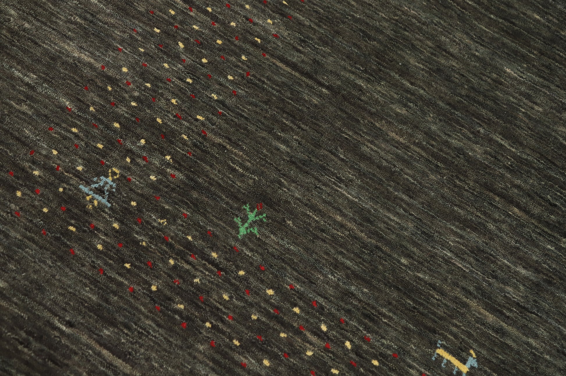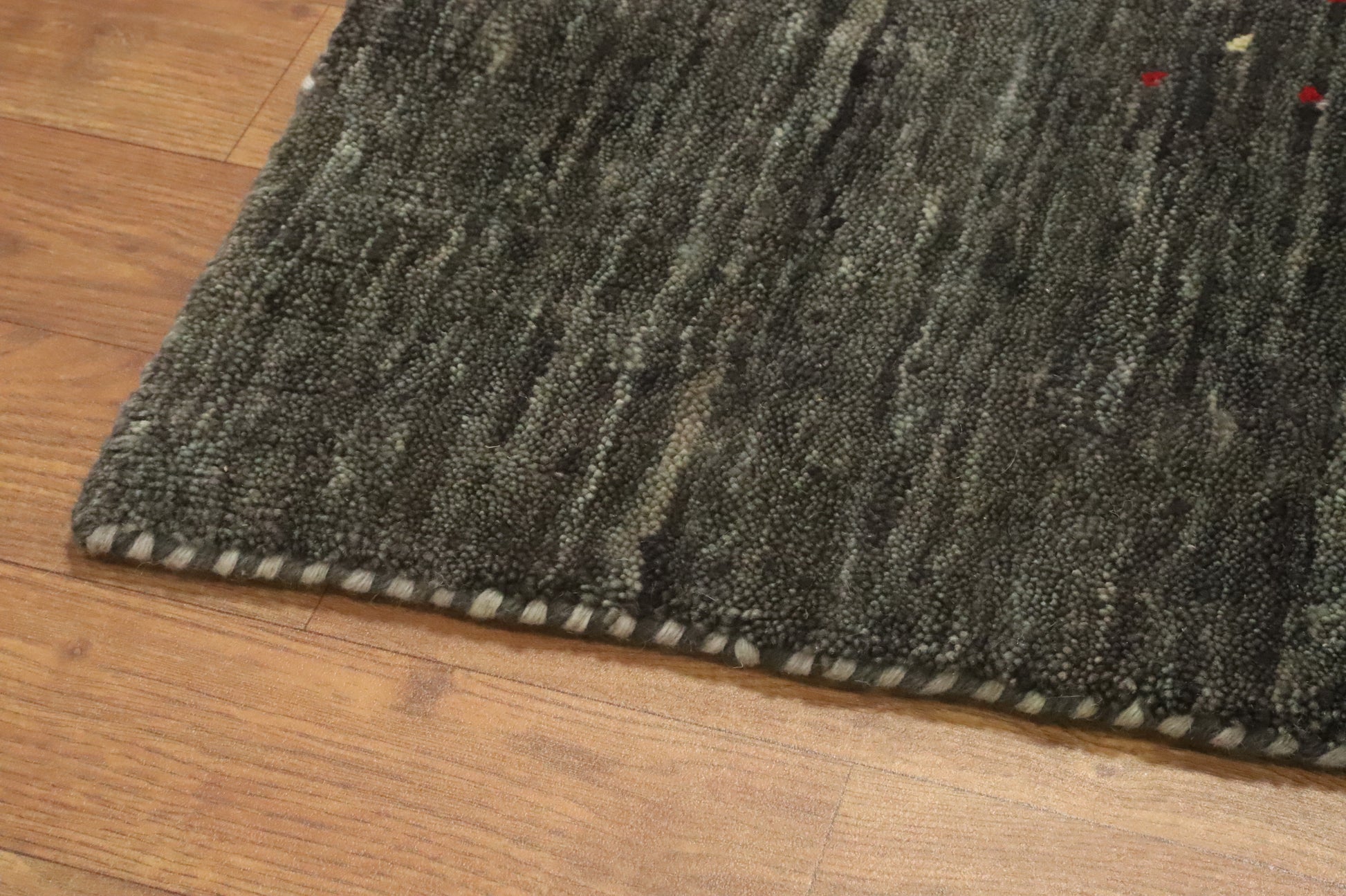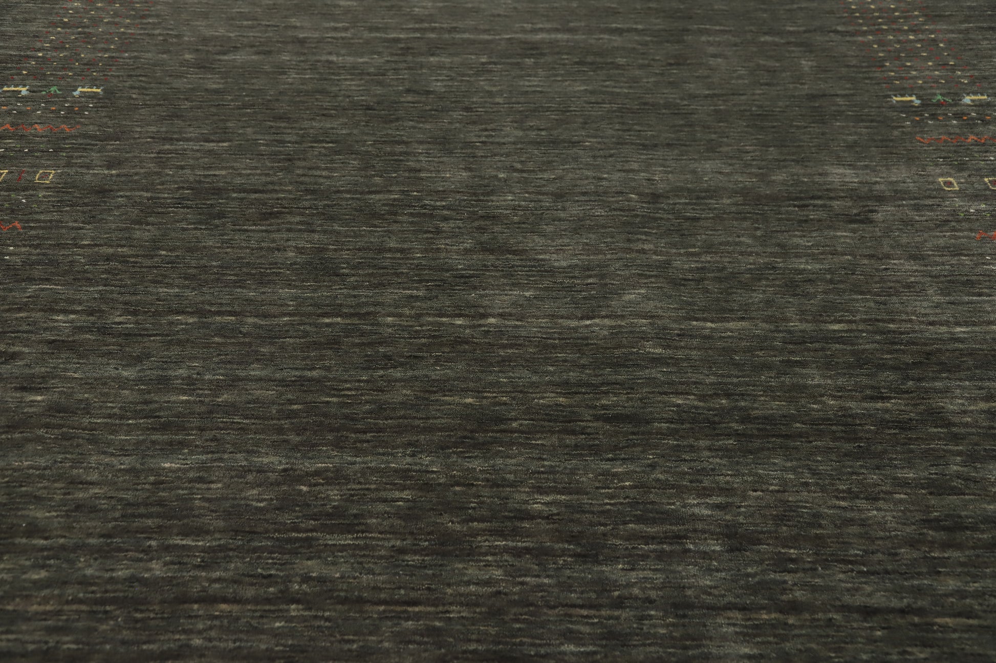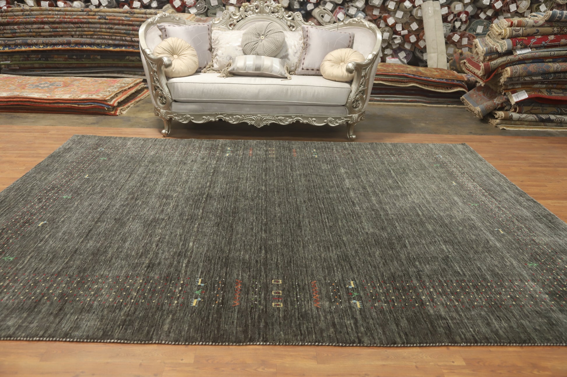 A Beautiful Genuine India Gabbeh rug is Hand Knotted by skillful weavers in India with 100% Wool Material. This rug is in New, First Quality condition. dimensions are 11' 4'' X 8' 10'' in foot and 345 X 269 in centimeter. the primary color is Greys & Charcoal.