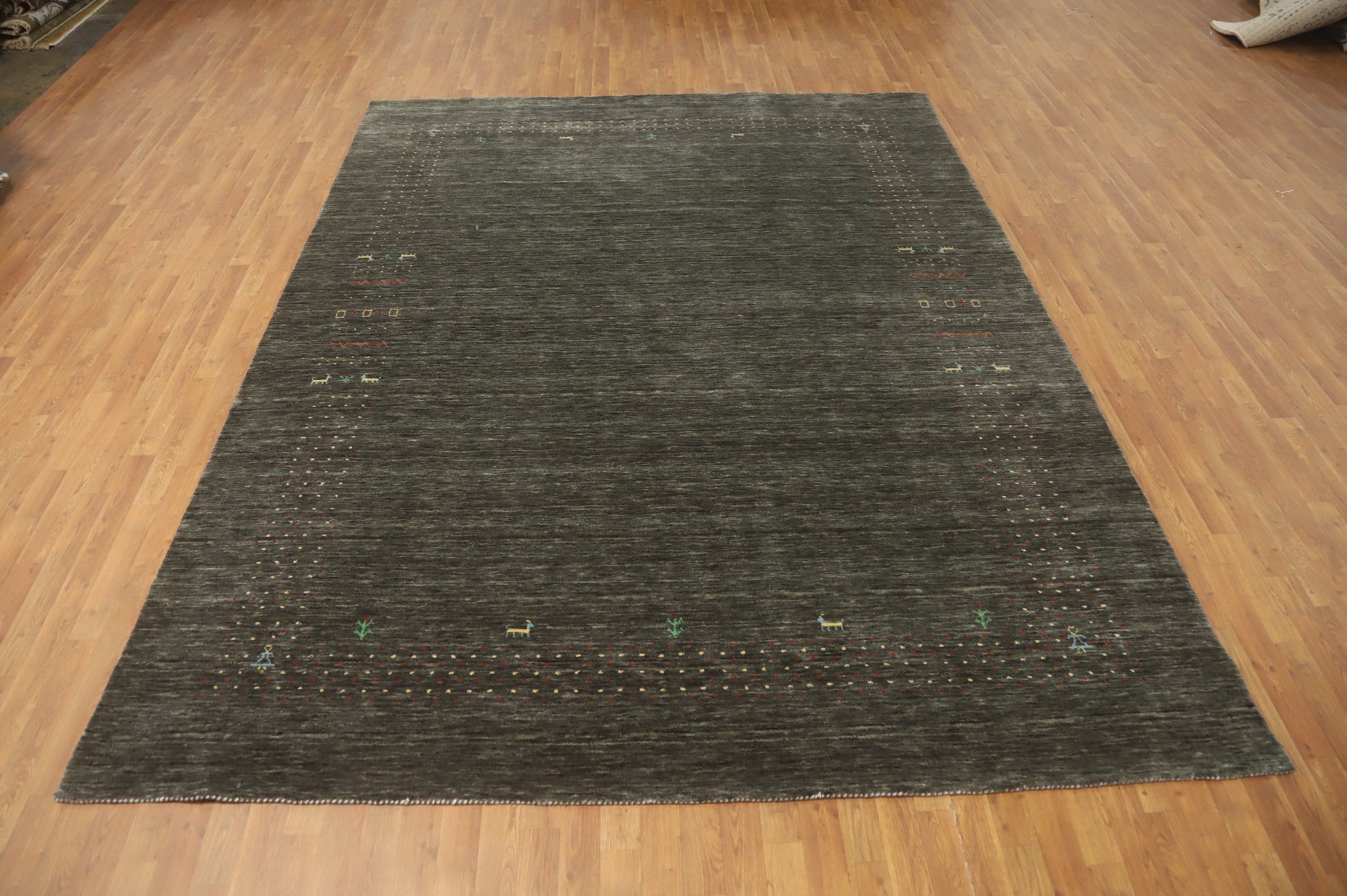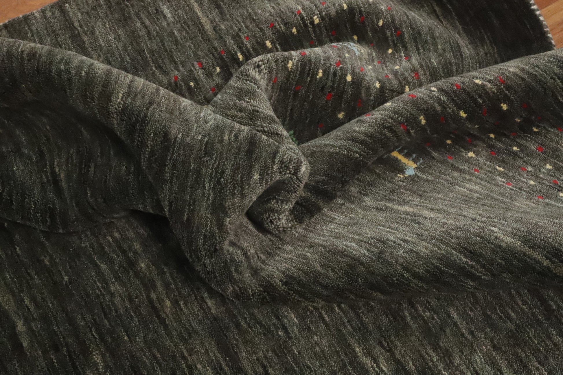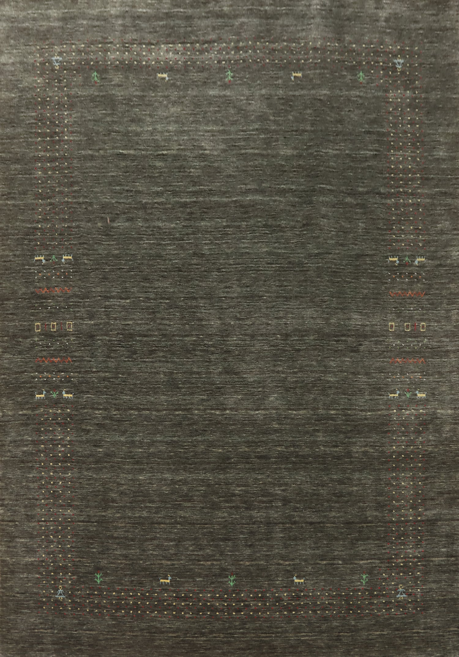 A Beautiful Genuine India Gabbeh rug is Hand Knotted by skillful weavers in India with 100% Wool Material. This rug is in New, First Quality condition. dimensions are 11' 4'' X 8' 10'' in foot and 345 X 269 in centimeter. the primary color is Greys & Charcoal.