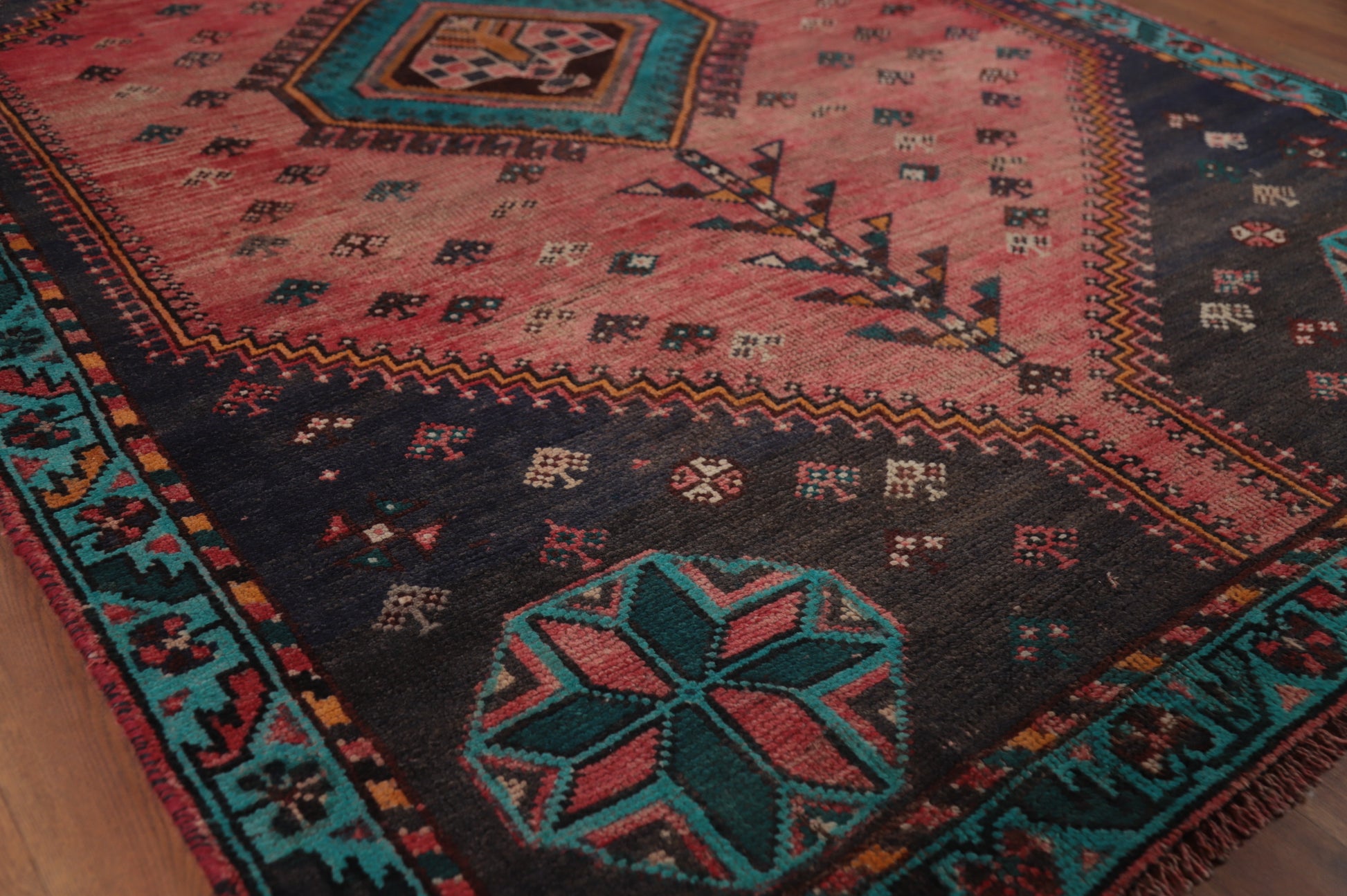 A Beautiful Genuine Persia ( Persia ) Shiraz rug is Hand Knotted by skillful weavers in Persia ( Persia ) with 100% Wool Material. This rug is in Very Good (Evenly Low Pile-Abrash) condition. dimensions are 6' 0'' X 4' 5'' in foot and 183 X 135 in centimeter. the primary color is Pink.