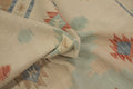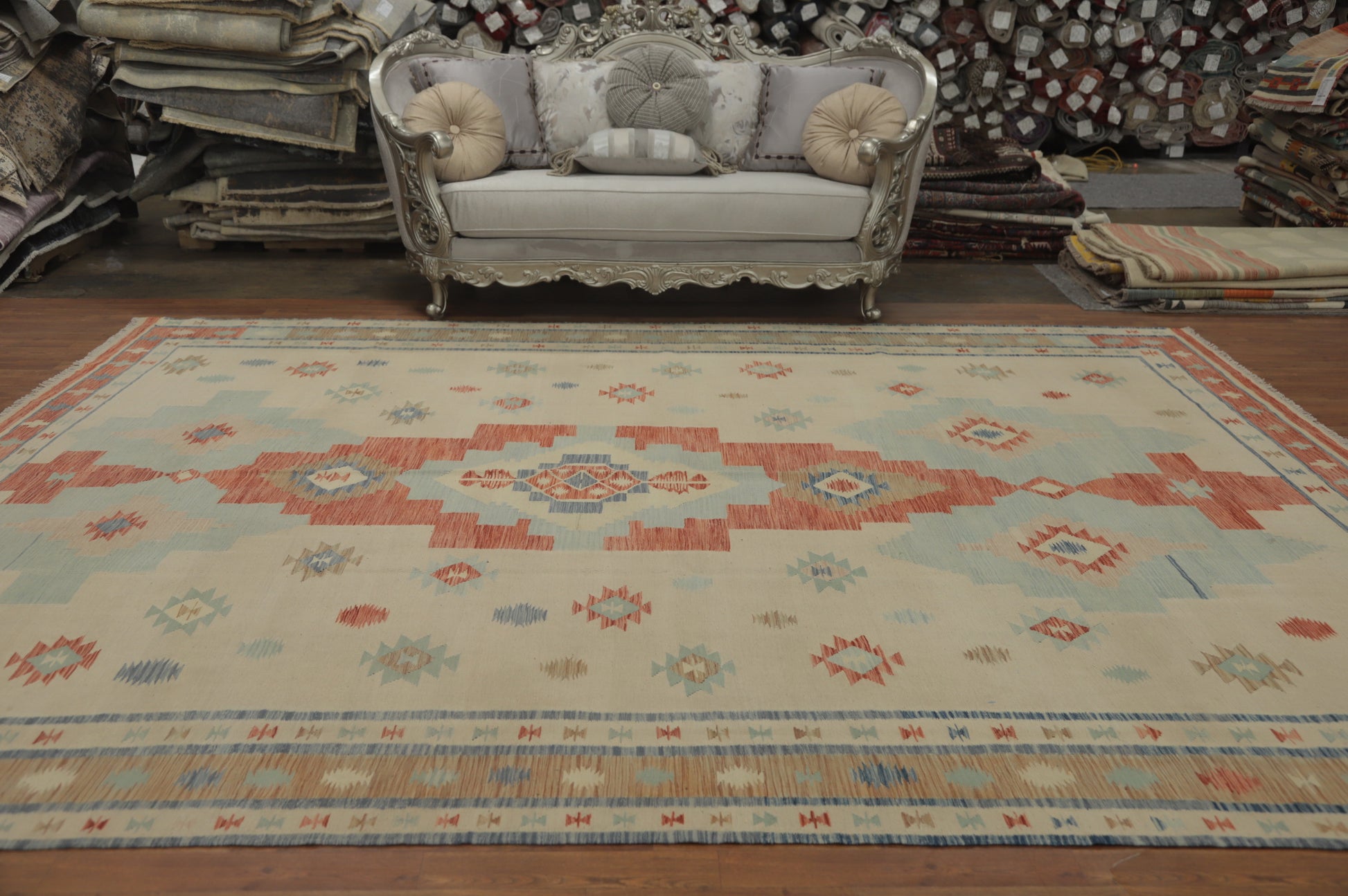 A Beautiful Genuine Pakistan Kilim rug is Hand Woven by skillful weavers in Pakistan with 100% Wool Material. This rug is in New, First Quality condition. dimensions are 12' 9'' X 9' 9'' in foot and 389 X 297 in centimeter. the primary color is Beige & Ivories.