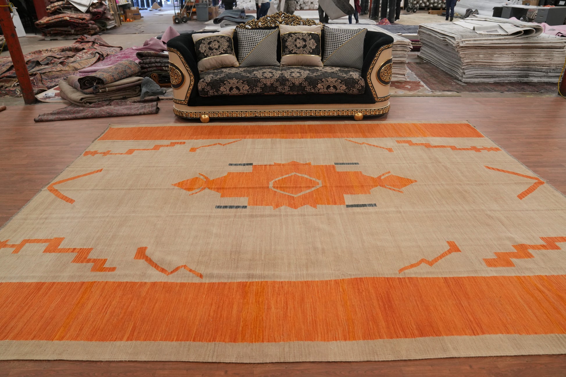 A Beautiful Genuine Pakistan Kilim rug is Hand Woven by skillful weavers in Pakistan with 100% Wool Material. This rug is in New, First Quality condition. dimensions are 12' 10'' X 10' 3'' in foot and 391 X 312 in centimeter. the primary color is Beige & Ivories.