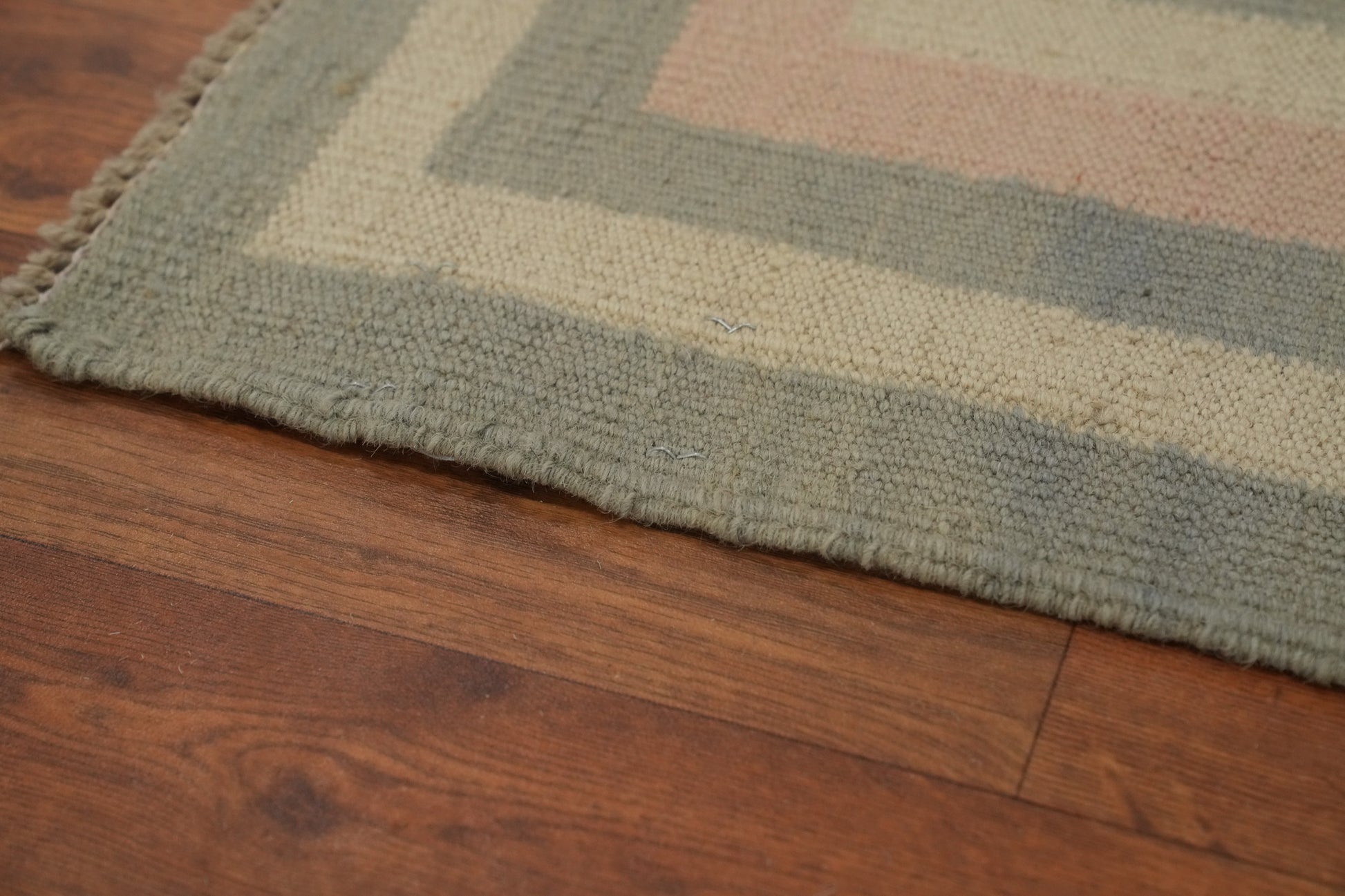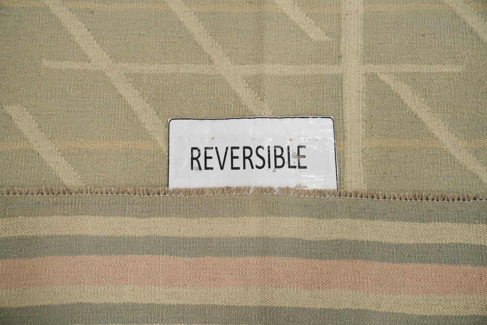 A Beautiful Genuine Pakistan Kilim rug is Hand Woven by skillful weavers in Pakistan with 100% Wool Material. This rug is in New, First Quality condition. dimensions are 9' 9'' X 7' 0'' in foot and 297 X 213 in centimeter. the primary color is Greys & Charcoal.