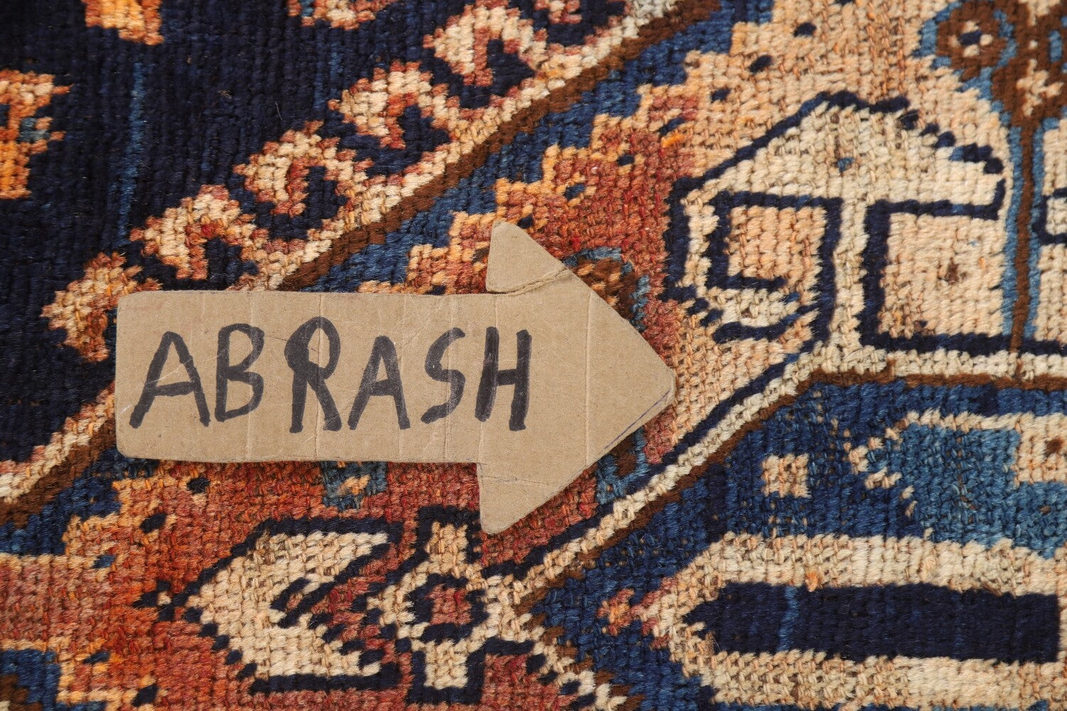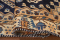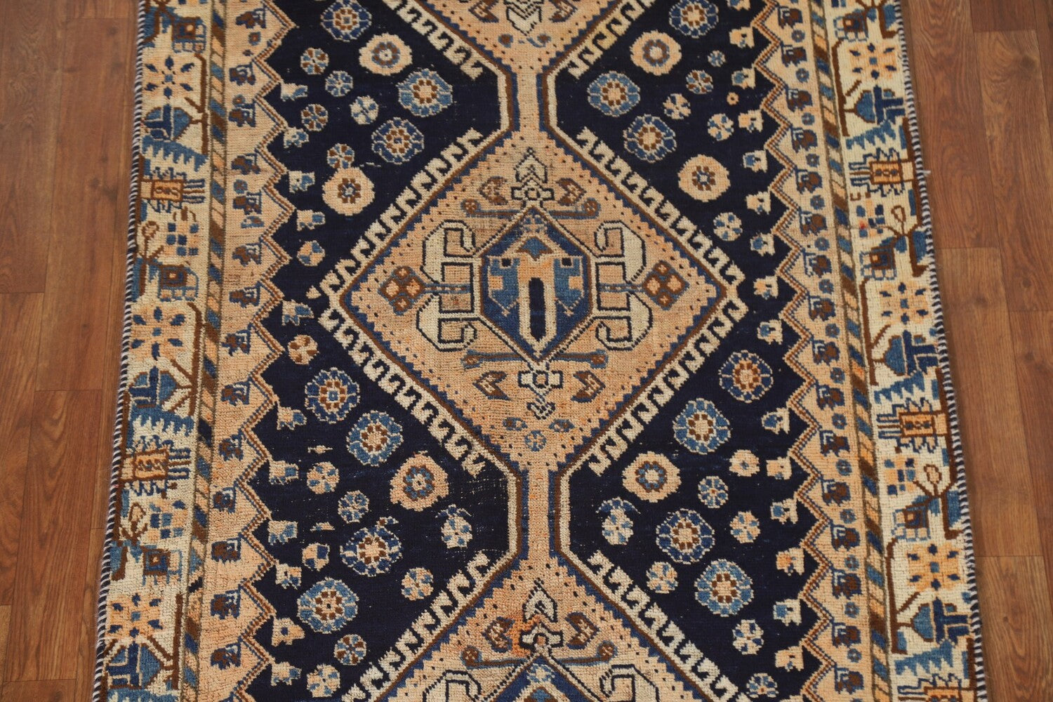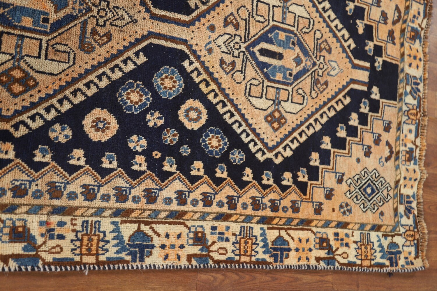 A Beautiful Genuine Persia ( Persia ) Qashqai rug is Hand Knotted by skillful weavers in Persia ( Persia ) with 100% Wool Material. This rug is in Very Good (Evenly Low Pile-Repair-Abrash) condition. dimensions are 7' 9'' X 3' 6'' in foot and 236 X 107 in centimeter. the primary color is Navy Blue & Blues.