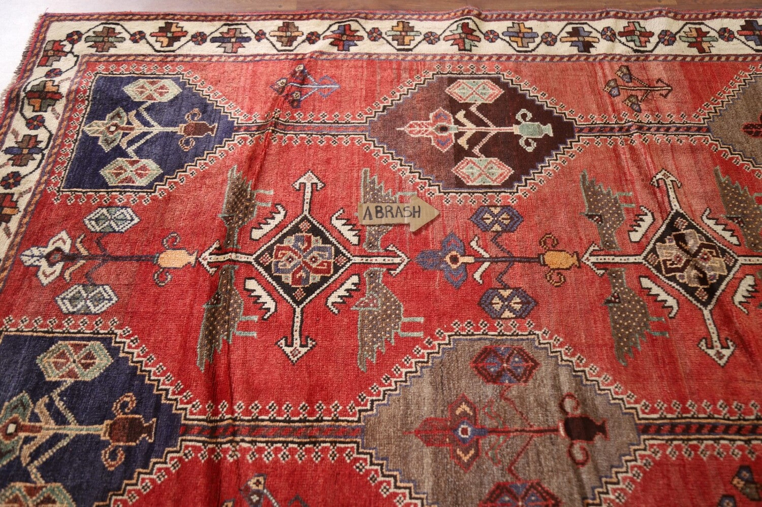A Beautiful Genuine Persia ( Persia ) Shiraz rug is Hand Knotted by skillful weavers in Persia ( Persia ) with 100% Wool Material. This rug is in Very Good (Abrash) condition. dimensions are 9' 5'' X 5' 3'' in foot and 287 X 160 in centimeter. the primary color is Red.