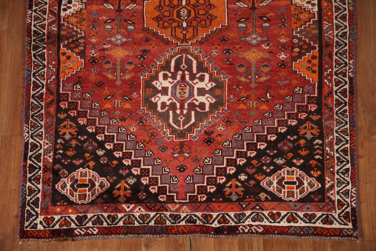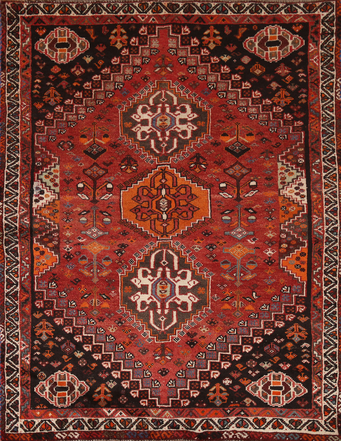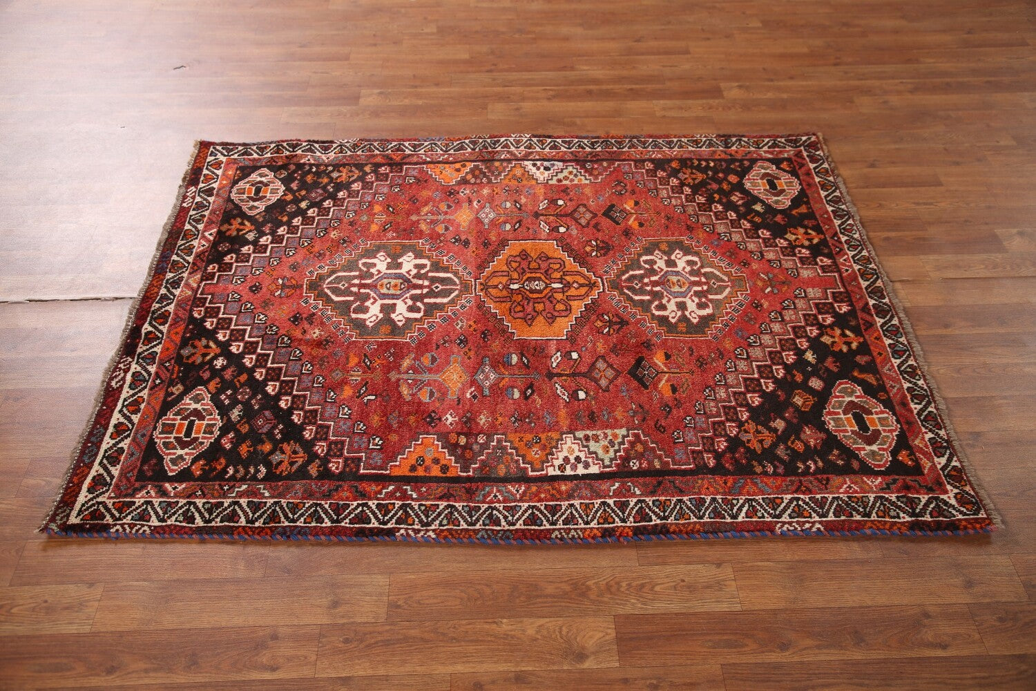 A Beautiful Genuine Persia ( Persia ) Shiraz rug is Hand Knotted by skillful weavers in Persia ( Persia ) with 100% Wool Material. This rug is in Very Good (Abrash) condition. dimensions are 5' 2'' X 3' 11'' in foot and 157 X 119 in centimeter. the primary color is Red.