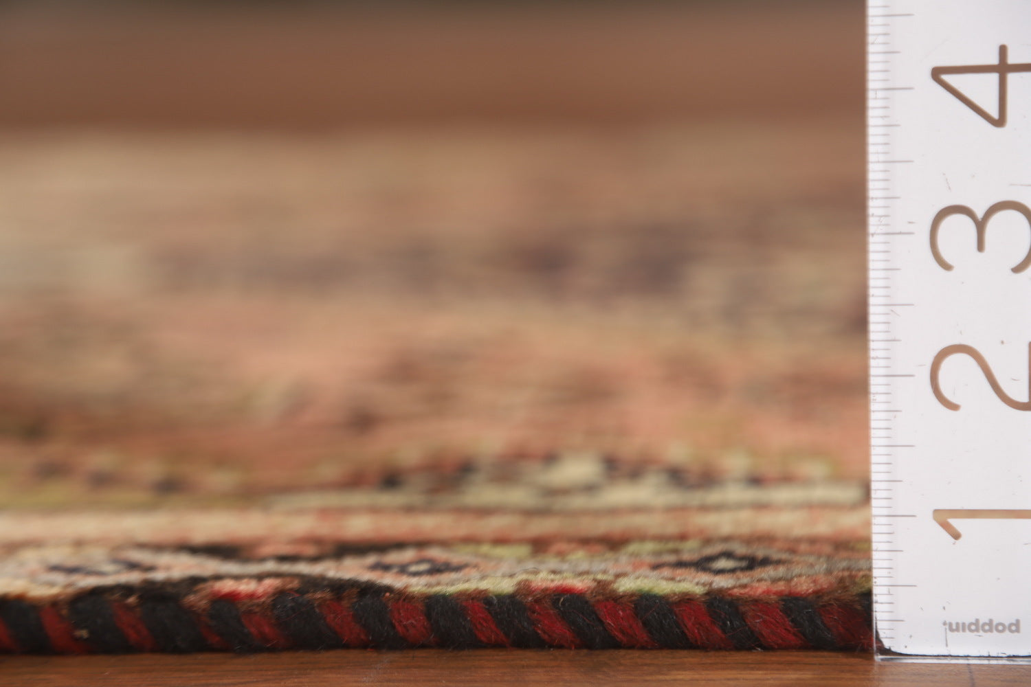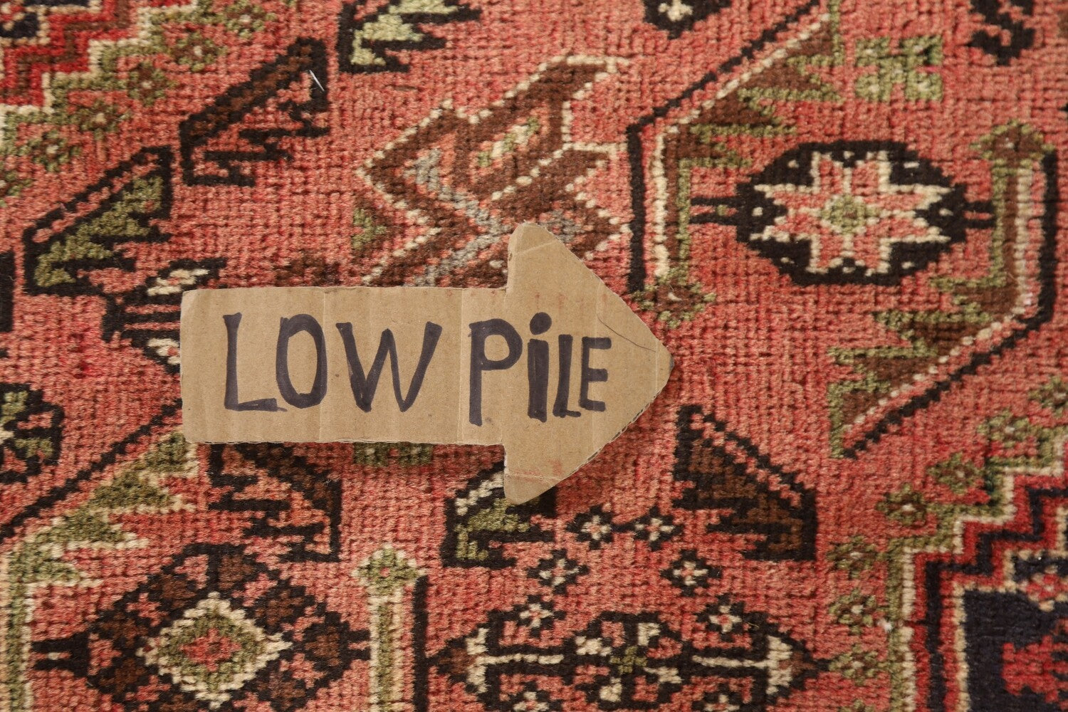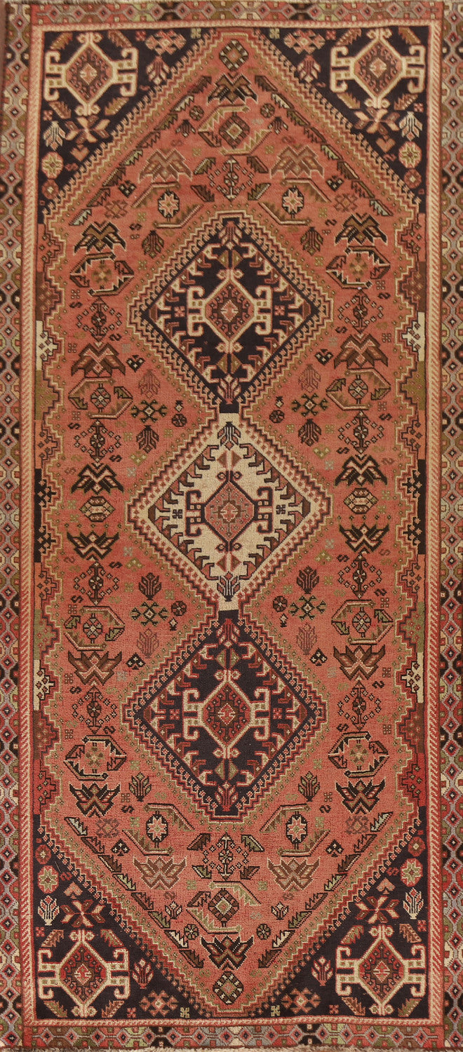 A Beautiful Genuine Persia ( Persia ) Shiraz rug is Hand Knotted by skillful weavers in Persia ( Persia ) with 100% Wool Material. This rug is in Very Good (Low Pile) condition. dimensions are 9' 7'' X 3' 5'' in foot and 292 X 104 in centimeter. the primary color is Coral.