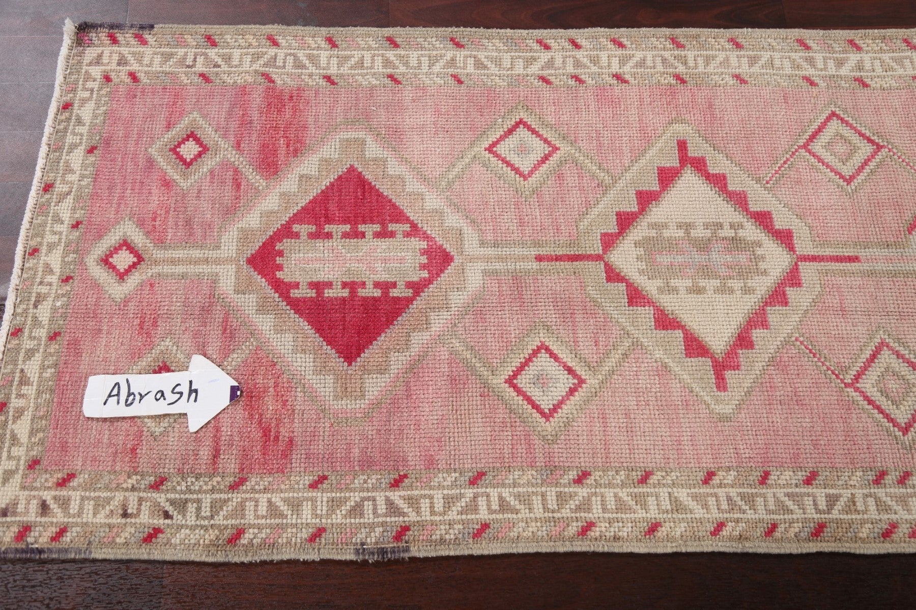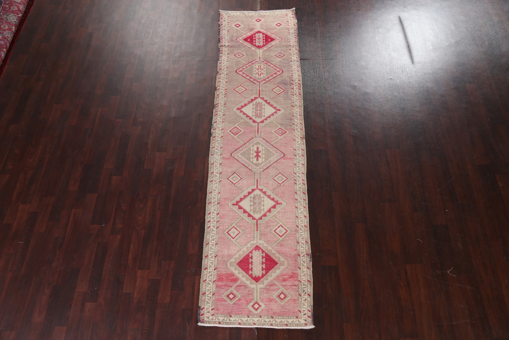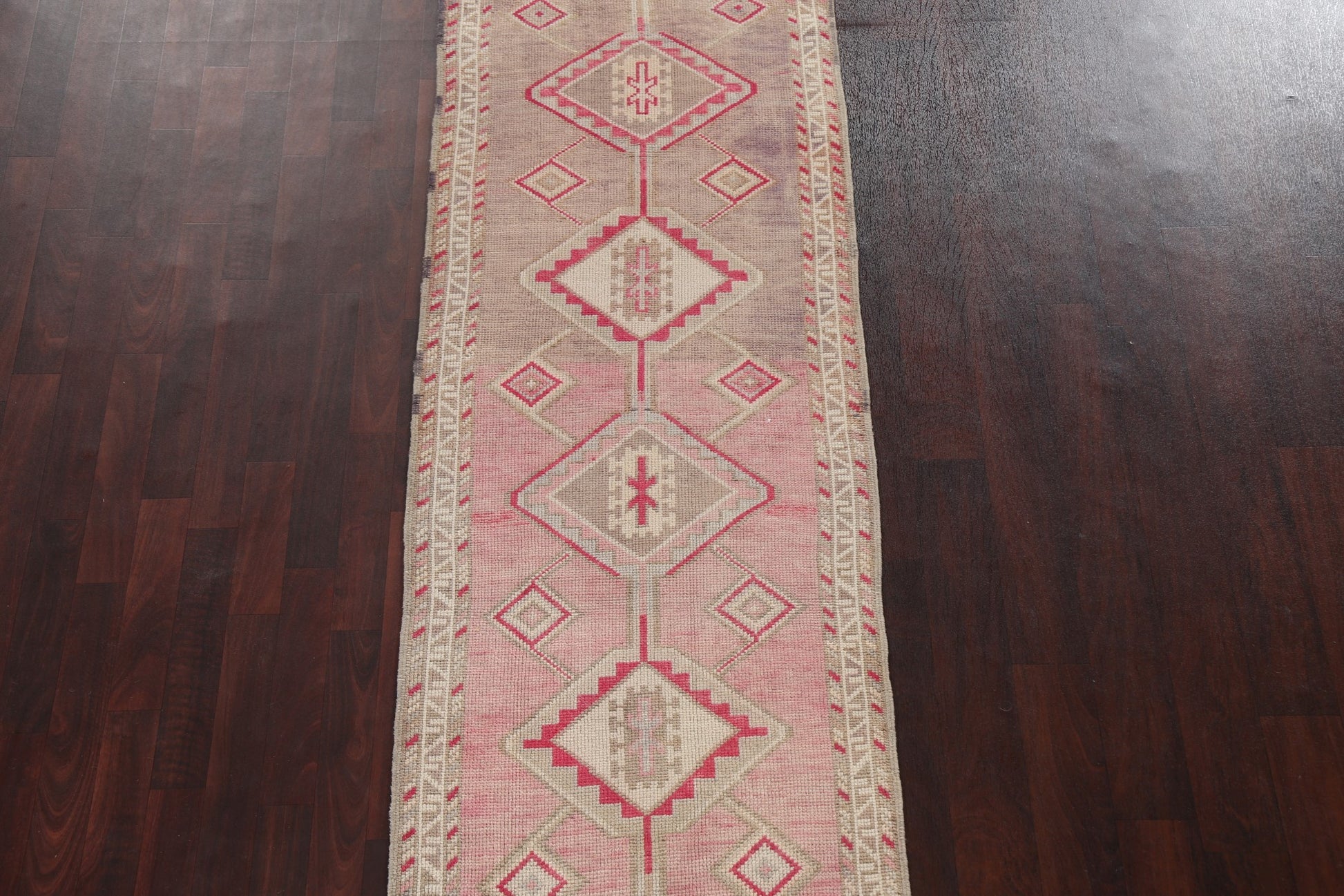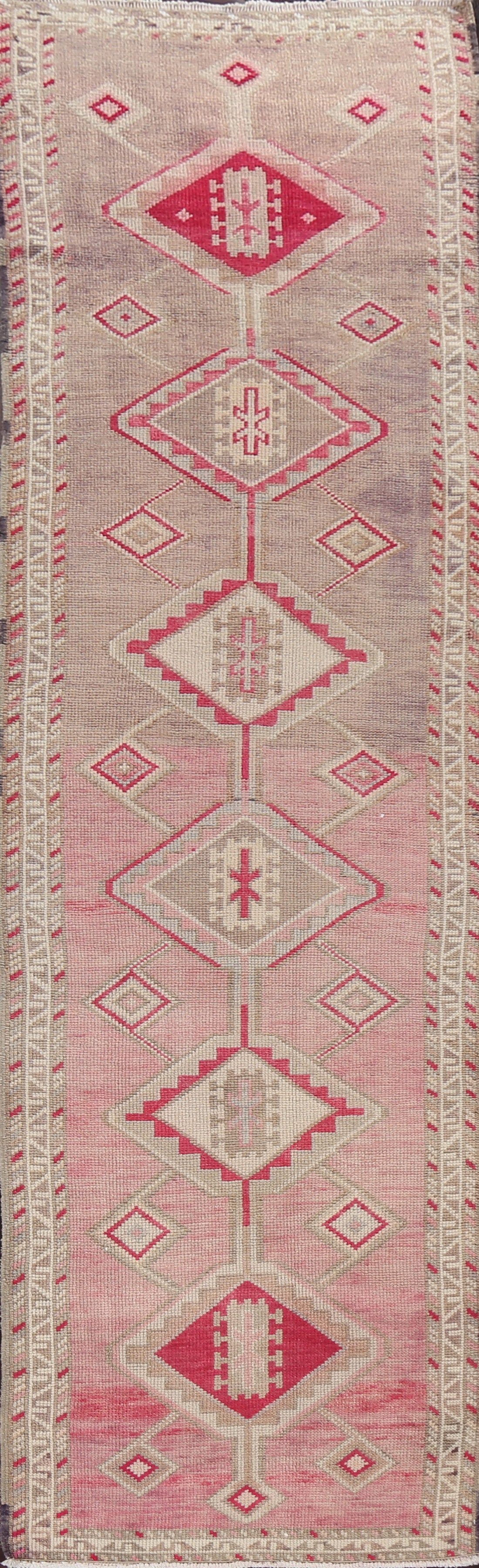 A Beautiful Genuine Turkey Oushak rug is Hand Knotted by skillful weavers in Turkey with 100% Wool Material. This rug is in Very Good (Abrash) condition. dimensions are 10' 3'' X 2' 8'' in foot and 312 X 81 in centimeter. the primary color is Pink.