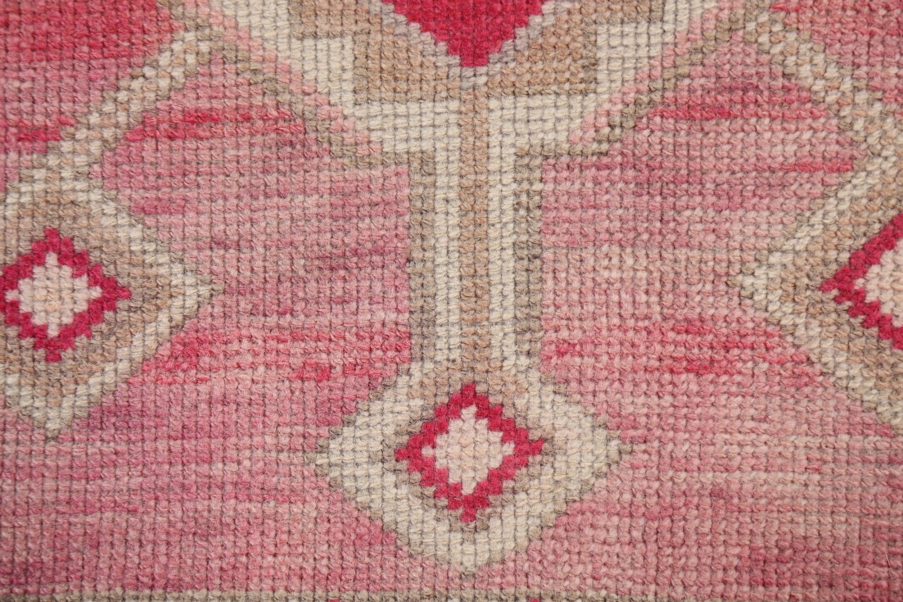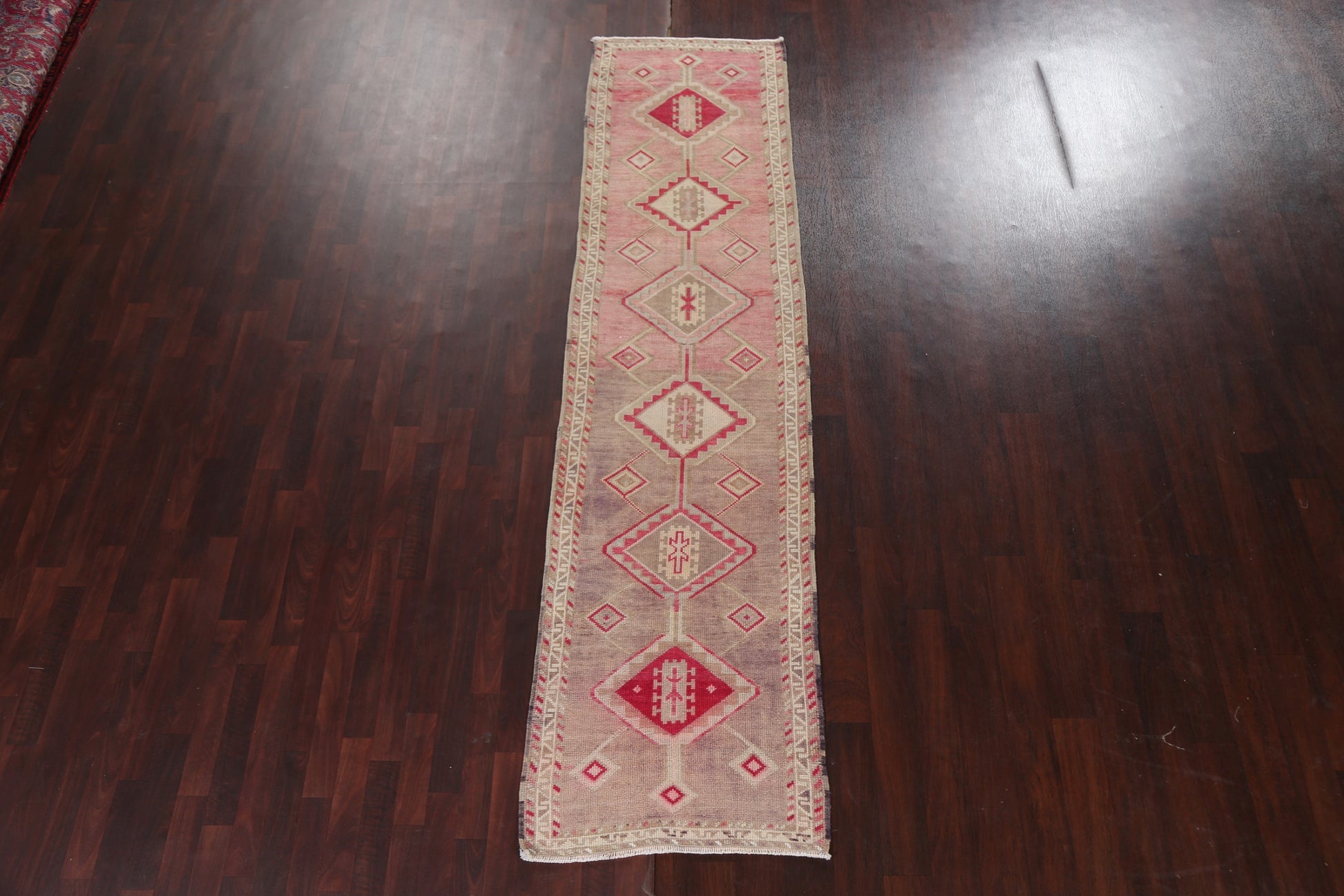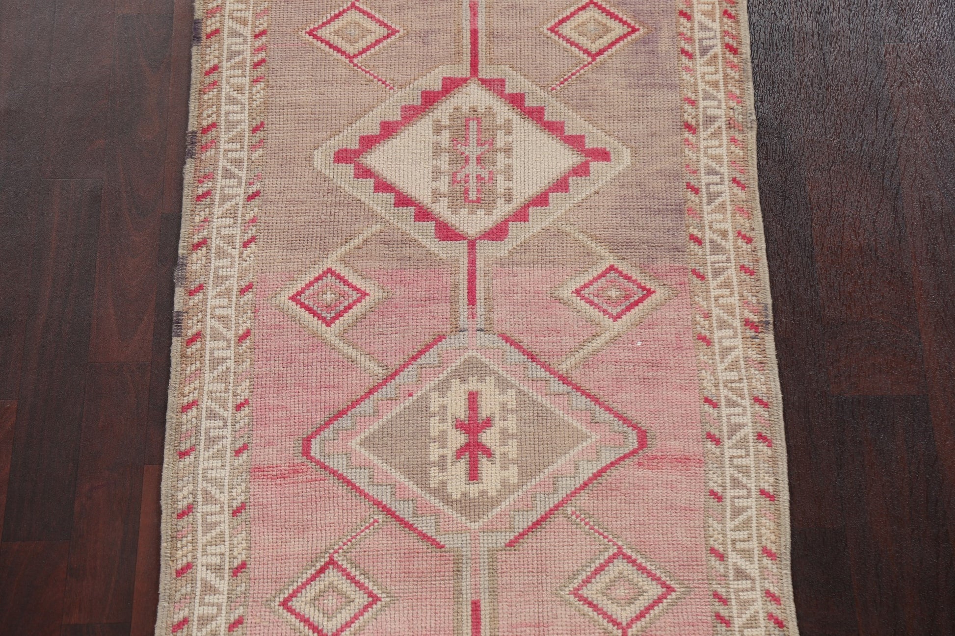 A Beautiful Genuine Turkey Oushak rug is Hand Knotted by skillful weavers in Turkey with 100% Wool Material. This rug is in Very Good (Abrash) condition. dimensions are 10' 3'' X 2' 8'' in foot and 312 X 81 in centimeter. the primary color is Pink.