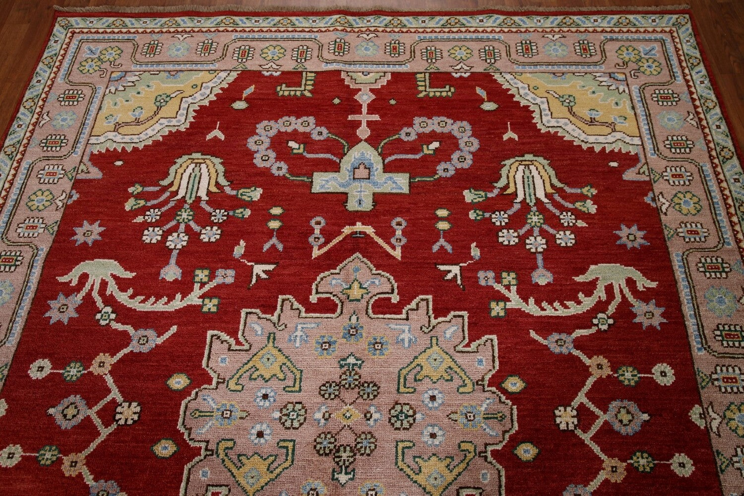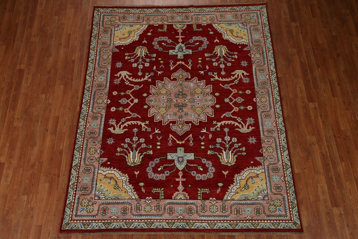 A Beautiful Genuine Turkey Oushak rug is Hand Knotted by skillful weavers in Turkey with 100% Wool Material. This rug is in New, First Quality condition. dimensions are 8' 0'' X 6' 5'' in foot and 244 X 196 in centimeter. the primary color is Red.
