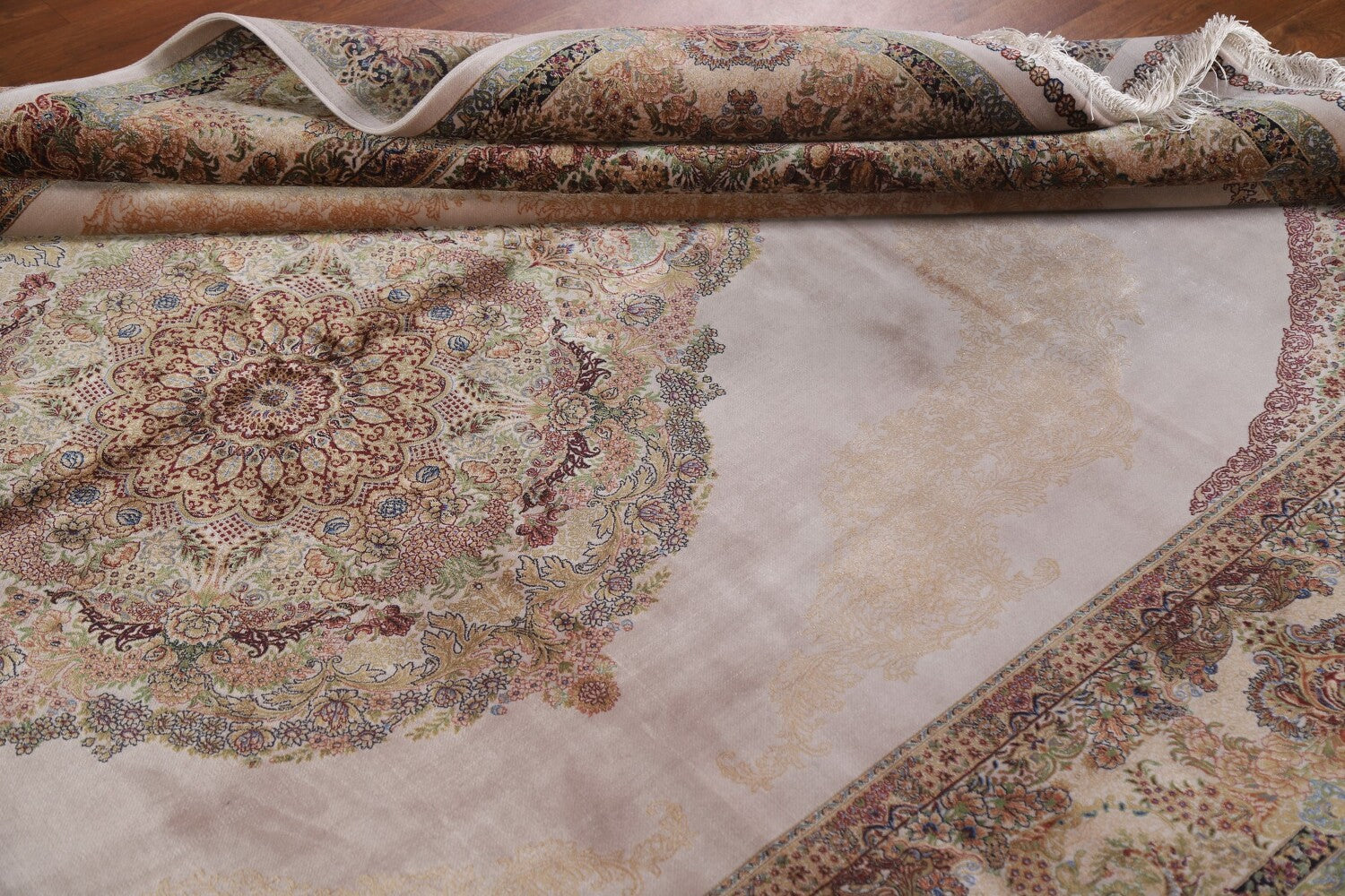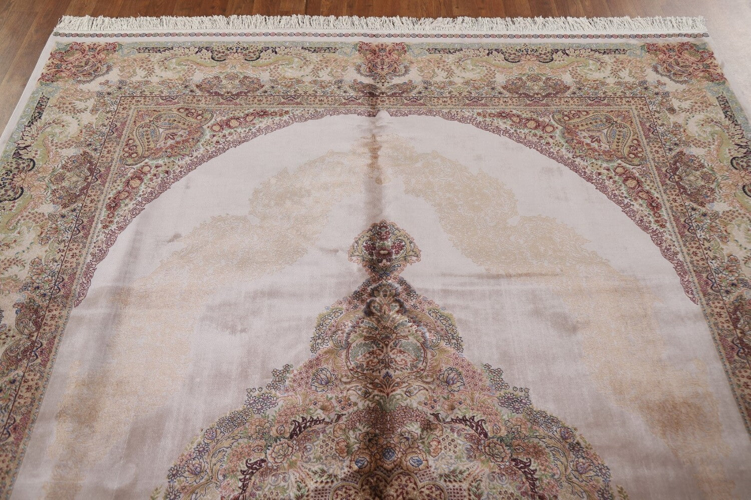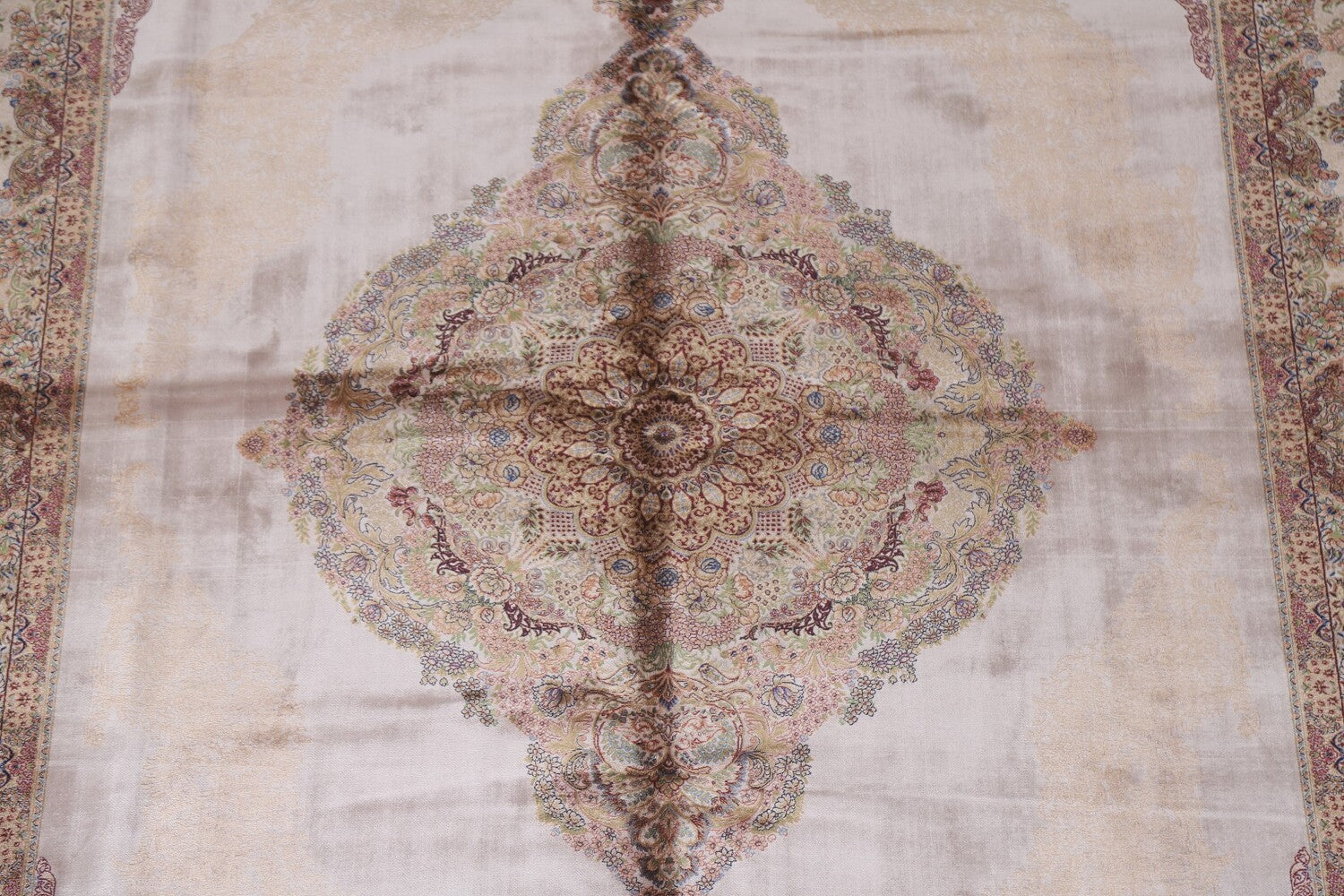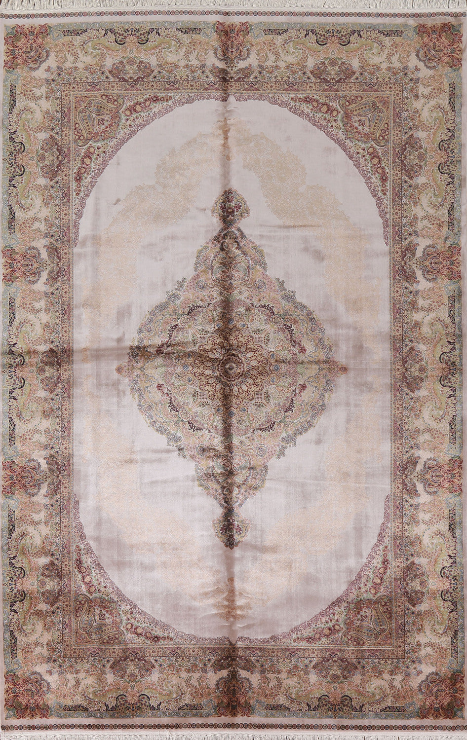 A Beautiful Genuine Turkey Qum rug is Machine Made by skillful weavers in Turkey with 90% Silk - 10% Polyester Material. This rug is in condition. dimensions are 10' 0'' X 6' 7'' in foot and 305 X 201 in centimeter. the primary color is Beige & Ivories.