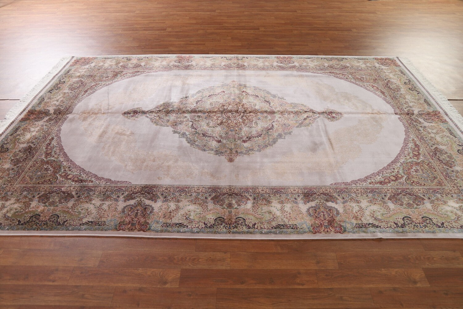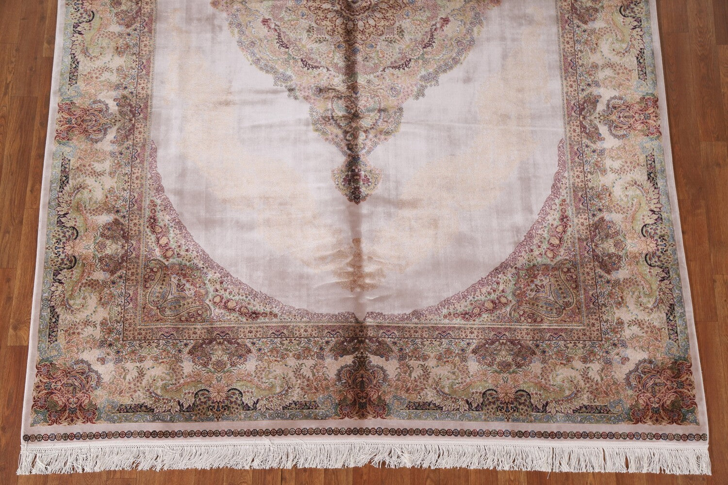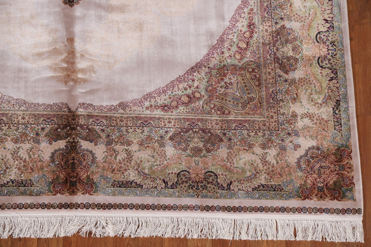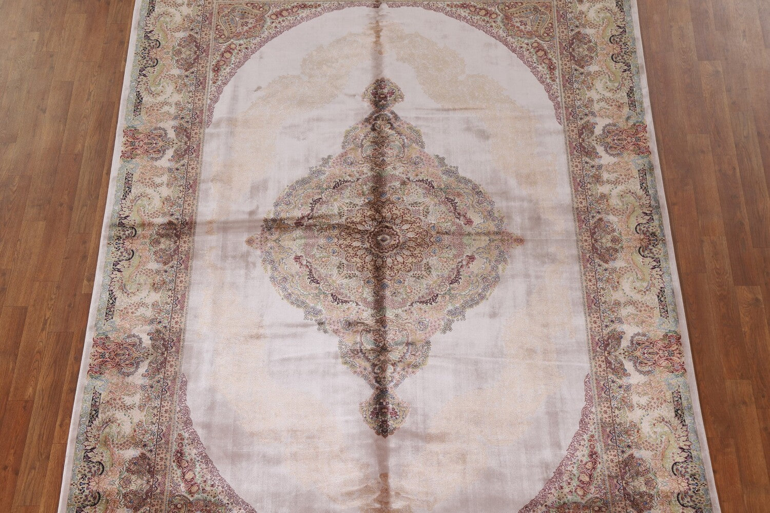 A Beautiful Genuine Turkey Qum rug is Machine Made by skillful weavers in Turkey with 90% Silk - 10% Polyester Material. This rug is in condition. dimensions are 10' 0'' X 6' 7'' in foot and 305 X 201 in centimeter. the primary color is Beige & Ivories.