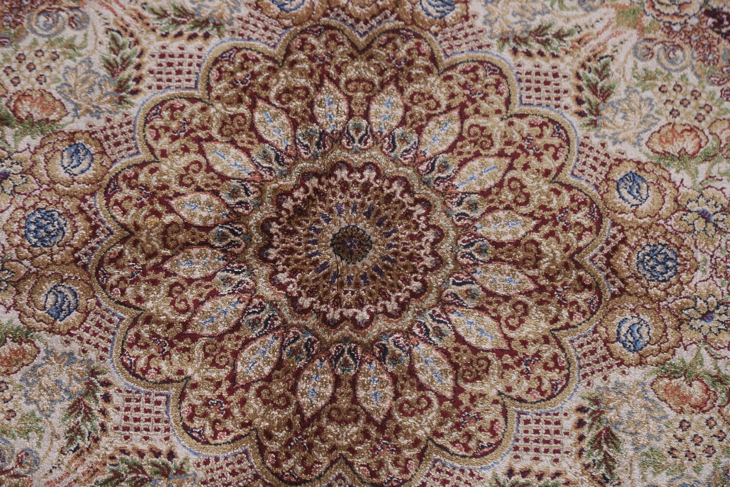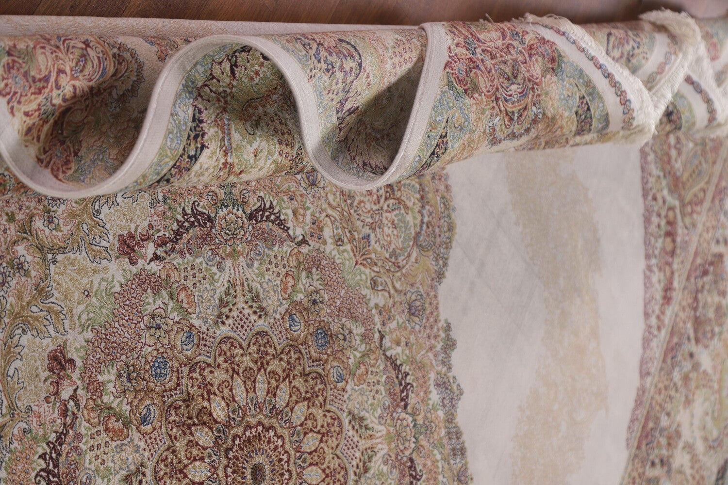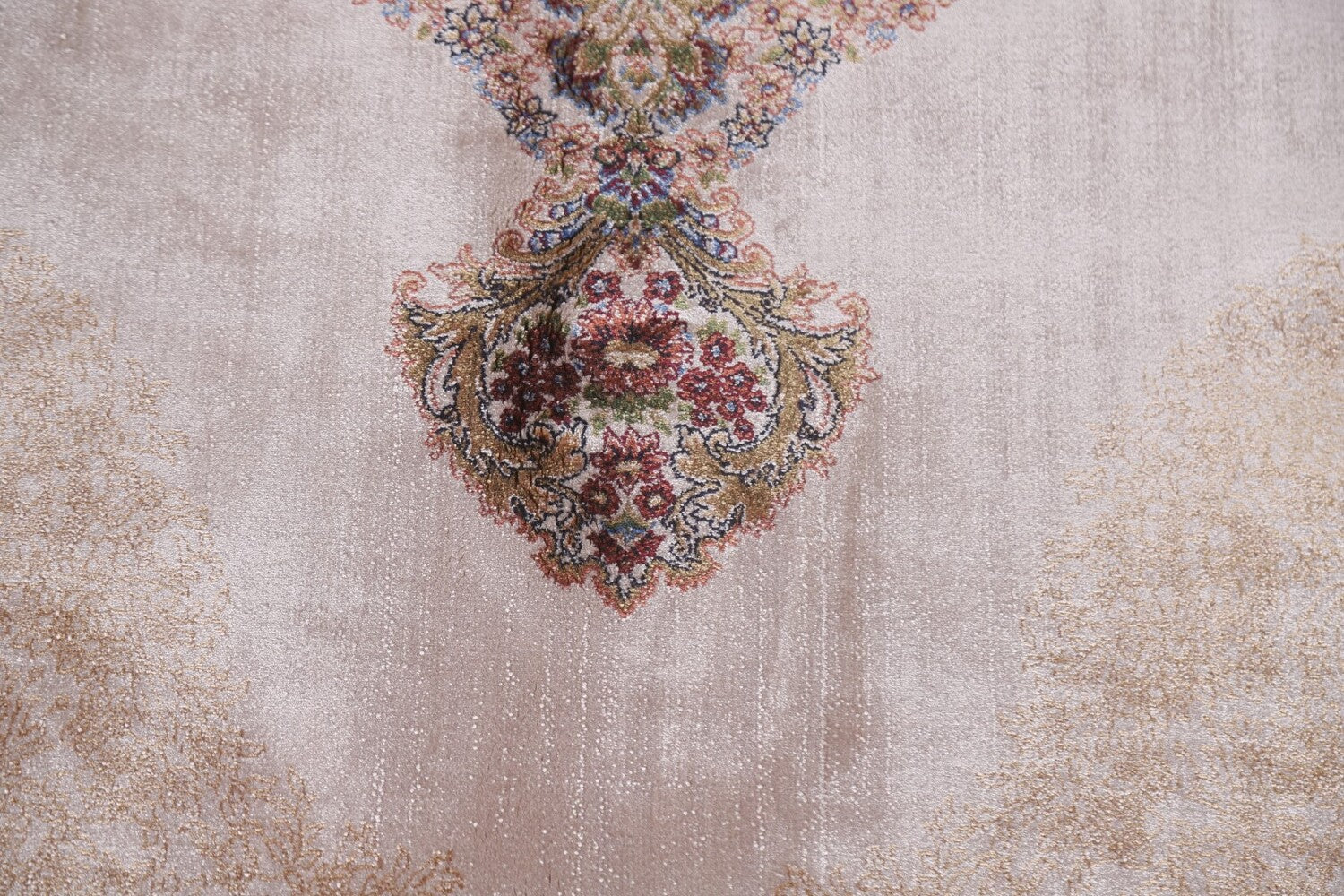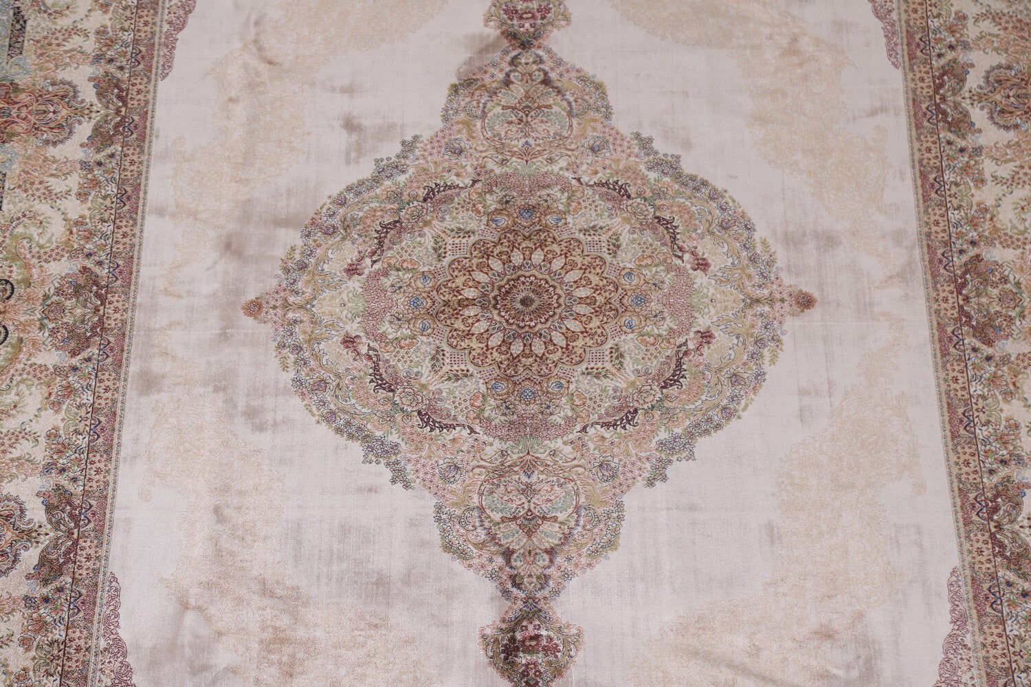A Beautiful Genuine Turkey Qum rug is Machine Made by skillful weavers in Turkey with 90% Silk - 10% Polyester Material. This rug is in condition. dimensions are 10' 0'' X 6' 7'' in foot and 305 X 201 in centimeter. the primary color is Beige & Ivories.