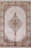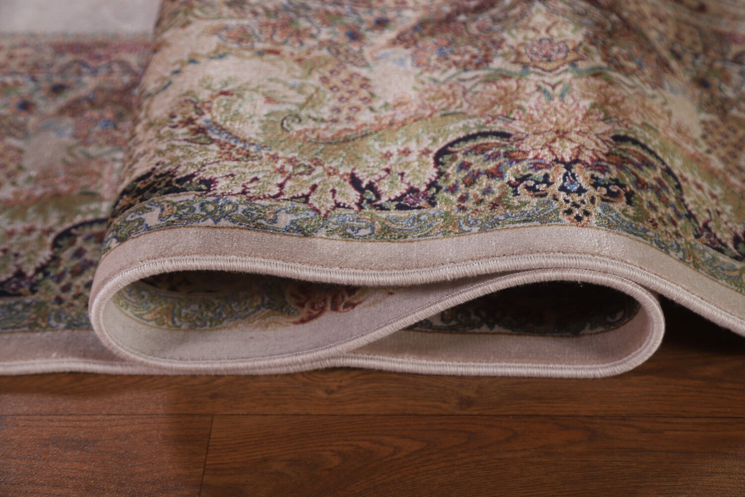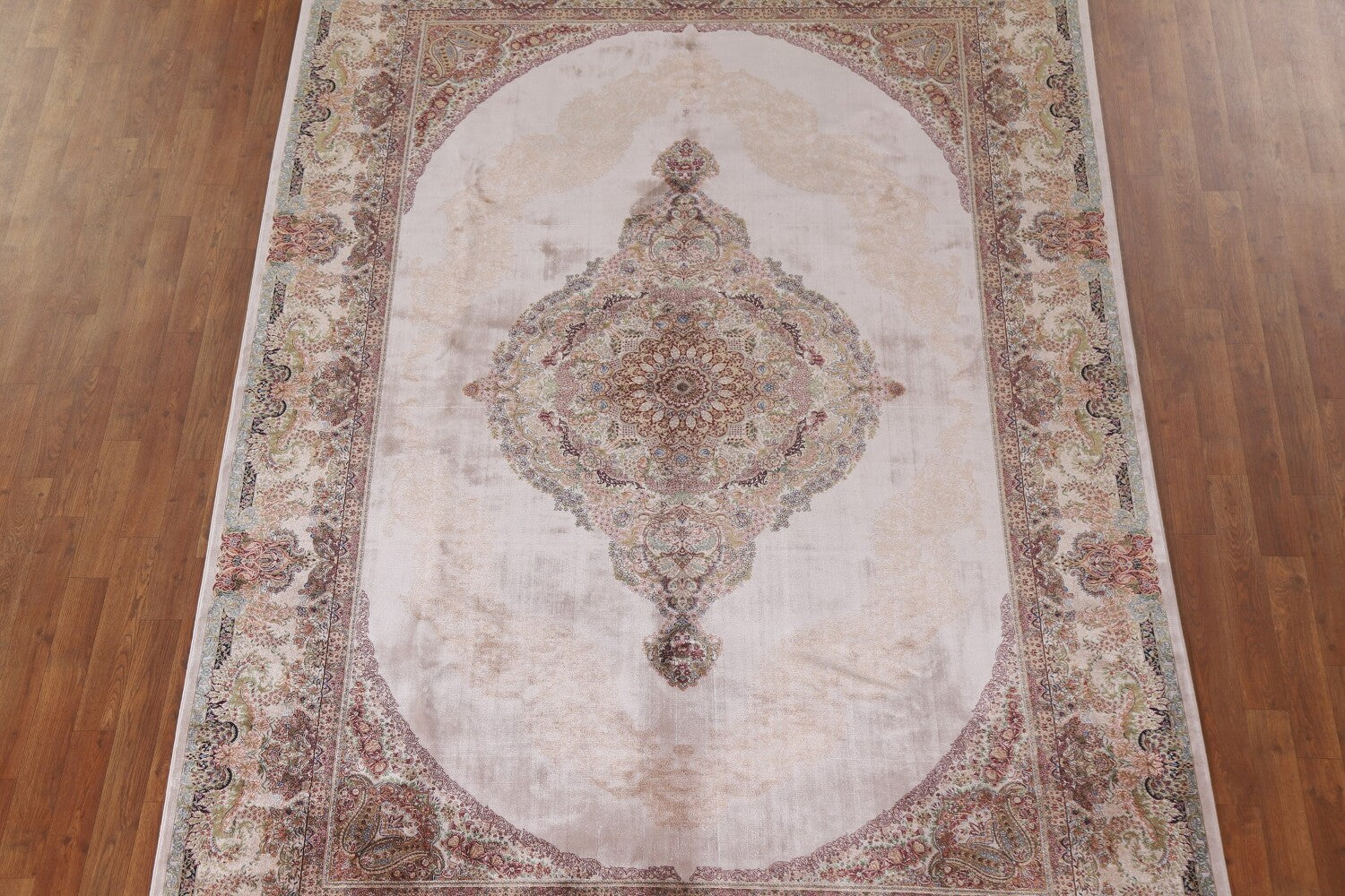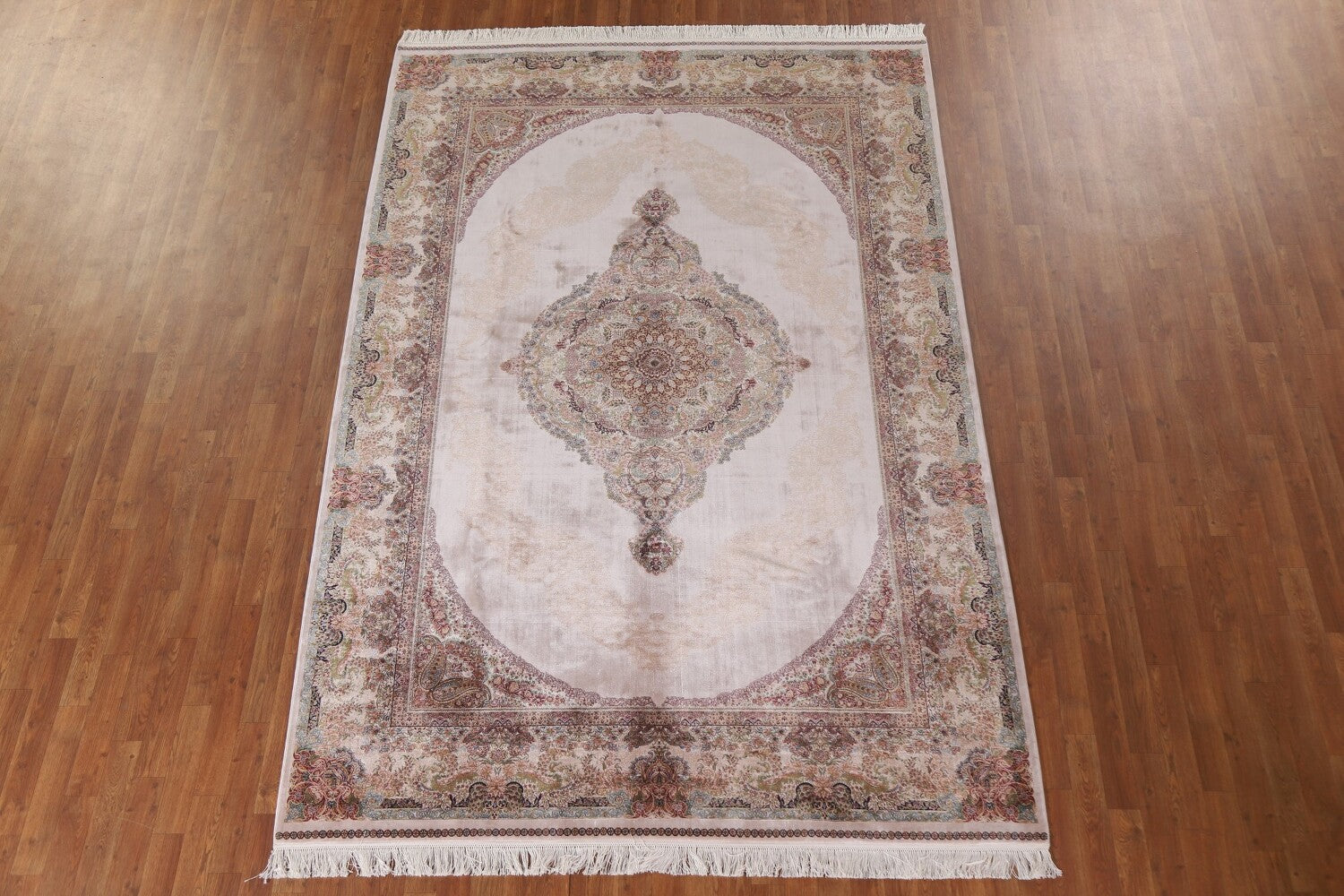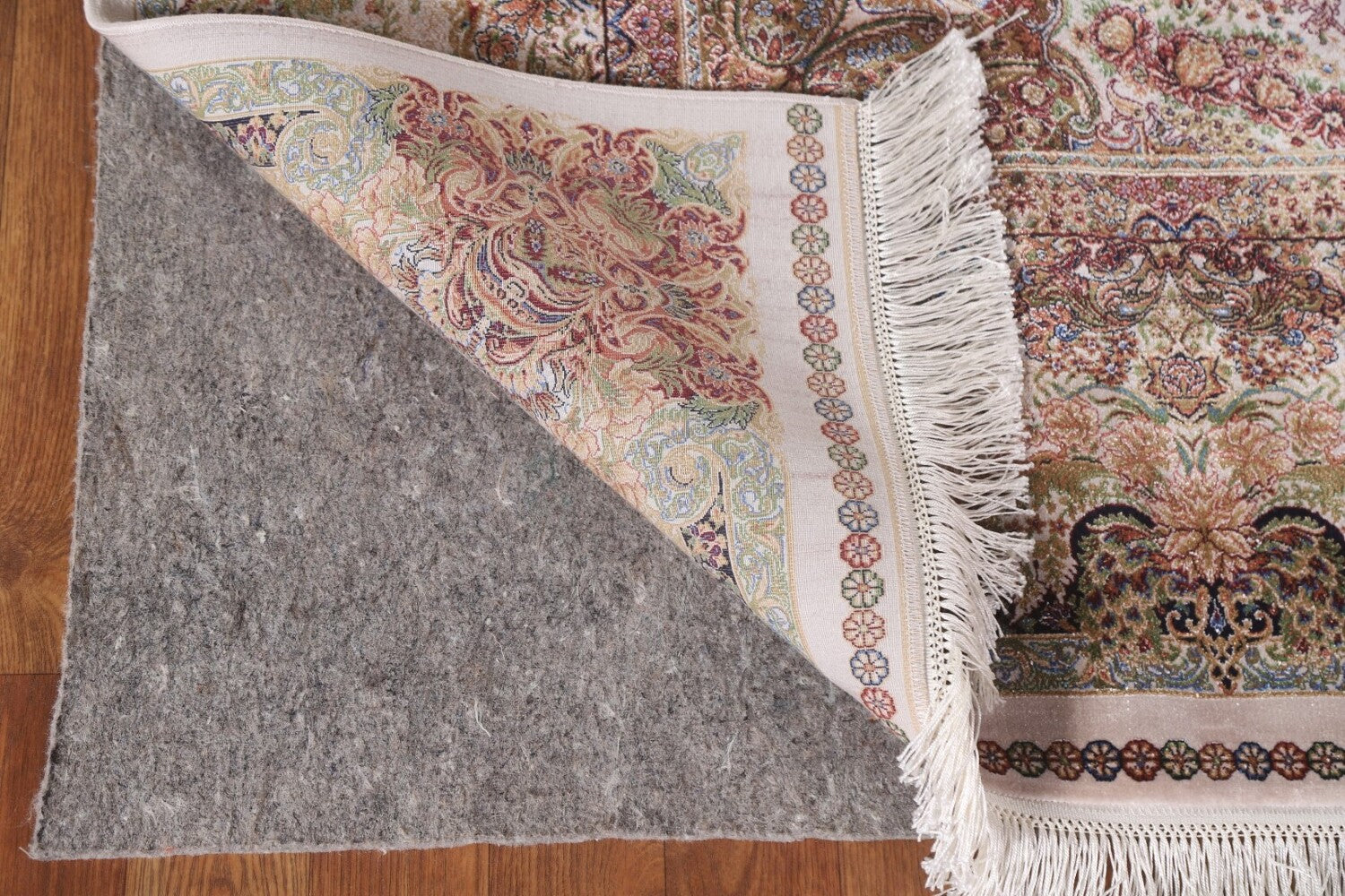 A Beautiful Genuine Turkey Qum rug is Machine Made by skillful weavers in Turkey with 90% Silk - 10% Polyester Material. This rug is in condition. dimensions are 10' 0'' X 6' 7'' in foot and 305 X 201 in centimeter. the primary color is Beige & Ivories.