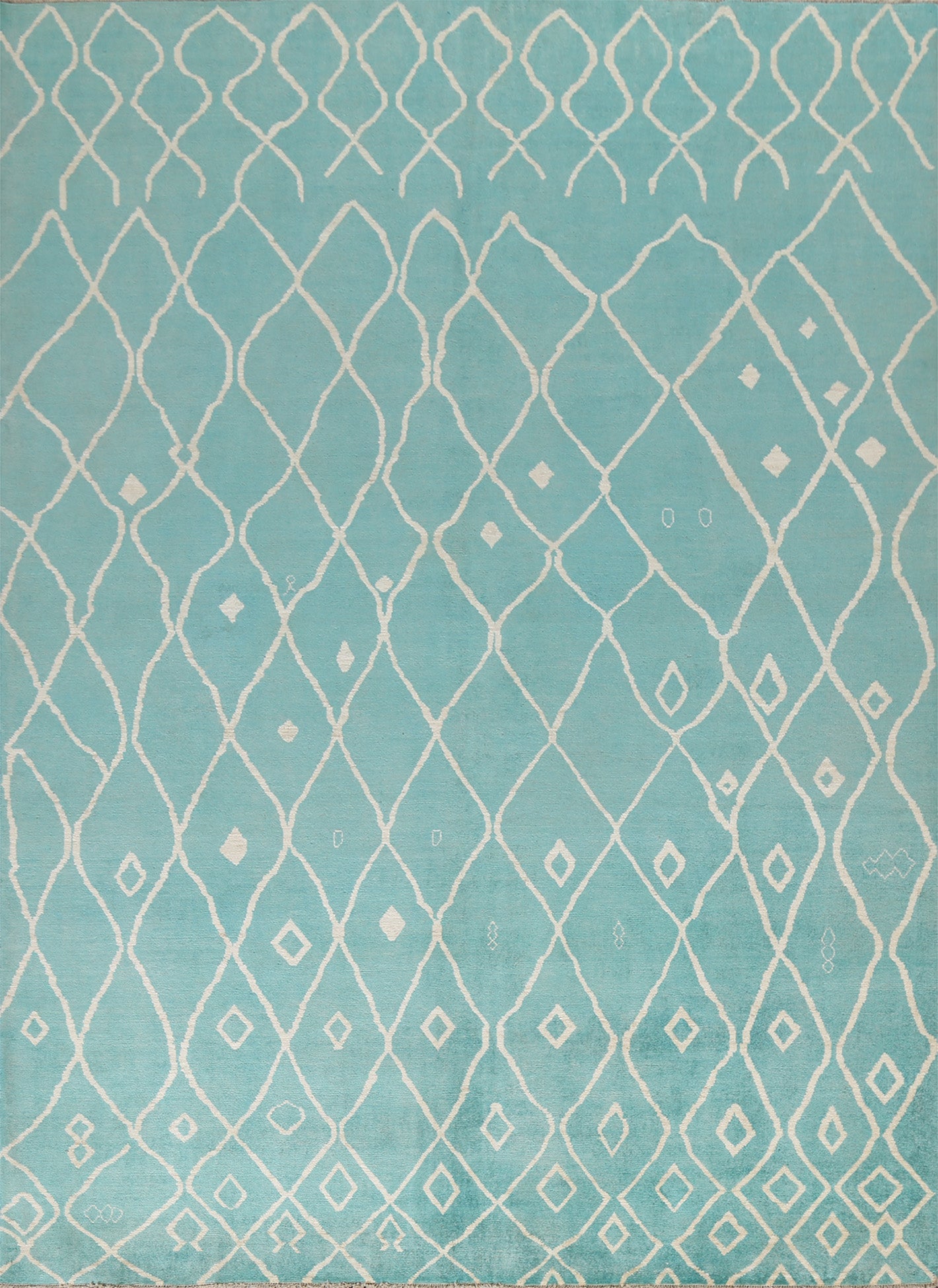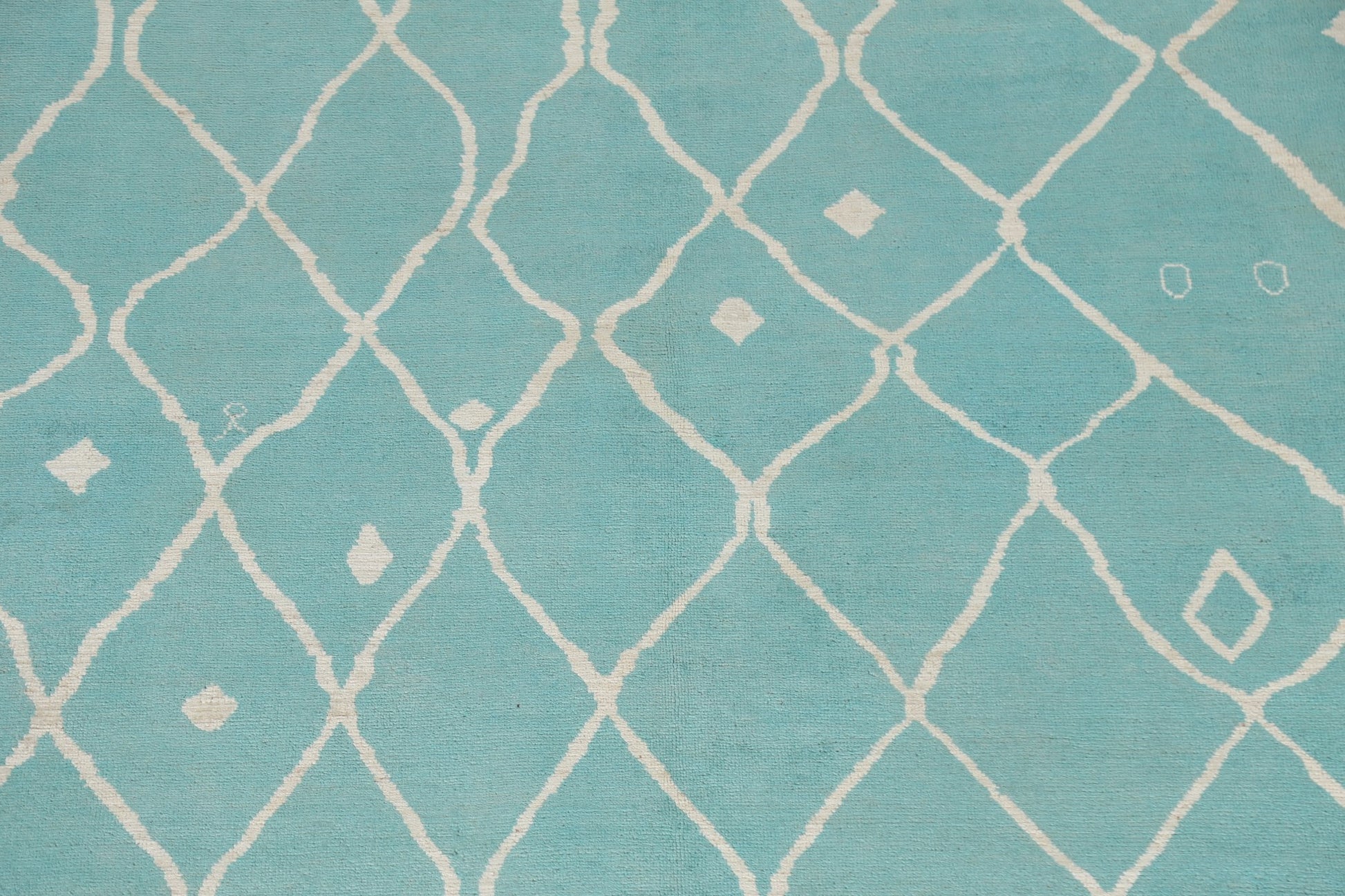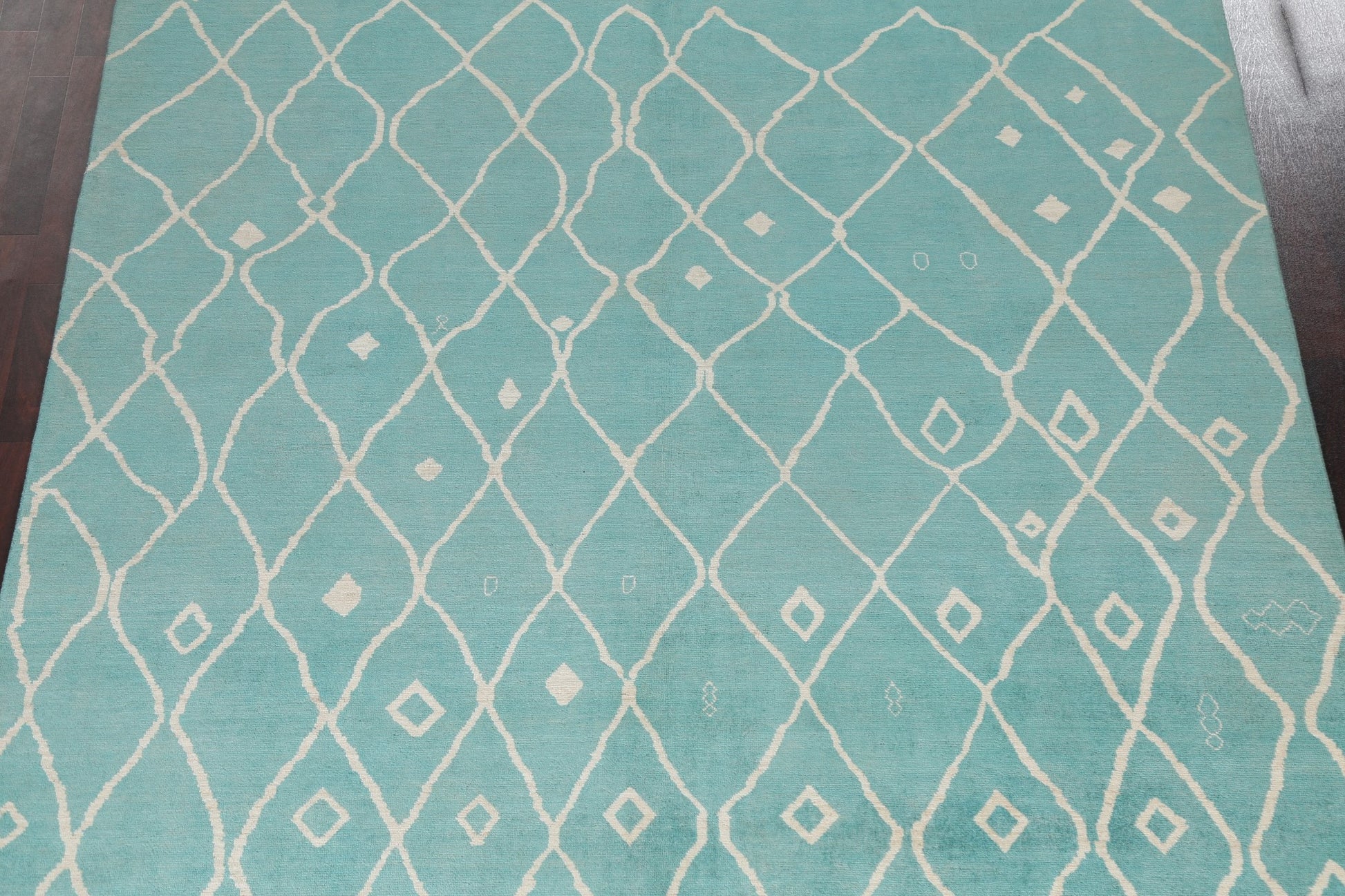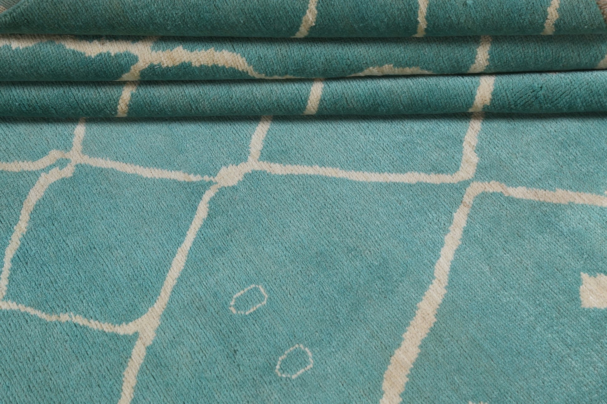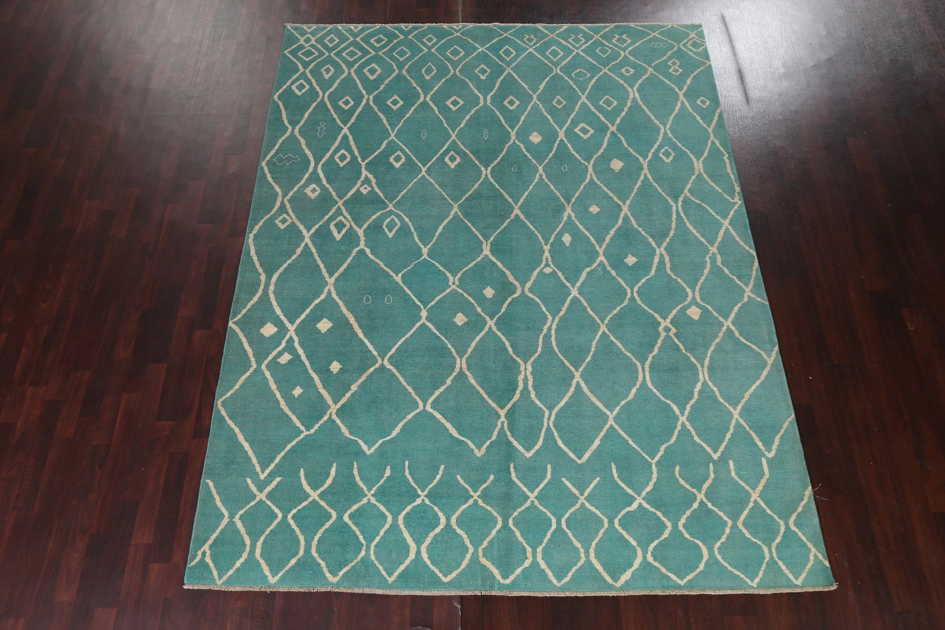A Beautiful Genuine Pakistan Moroccan rug is Hand Knotted by skillful weavers in Pakistan with 100% Wool Material. This rug is in New, First Quality condition. dimensions are 9' 11'' X 7' 9'' in foot and 302 X 236 in centimeter. the primary color is Green.