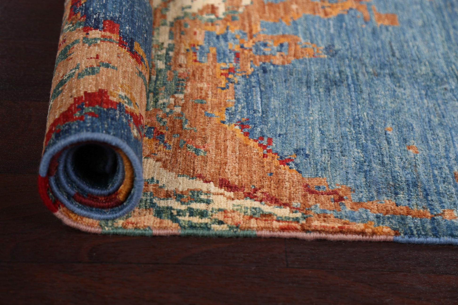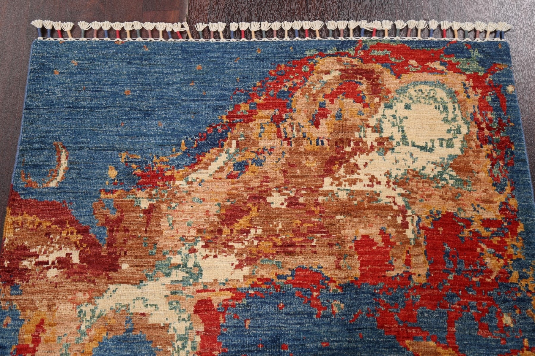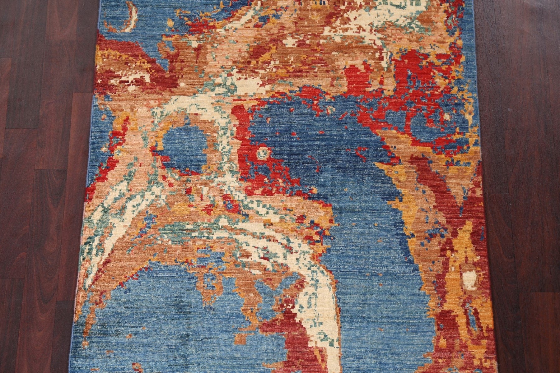A Beautiful Genuine Pakistan Abstract rug is Hand Knotted by skillful weavers in Pakistan with 100% Wool Material. This rug is in New, First Quality condition. dimensions are 5' 1'' X 3' 4'' in foot and 155 X 102 in centimeter. the primary color is Navy Blue & Blues.