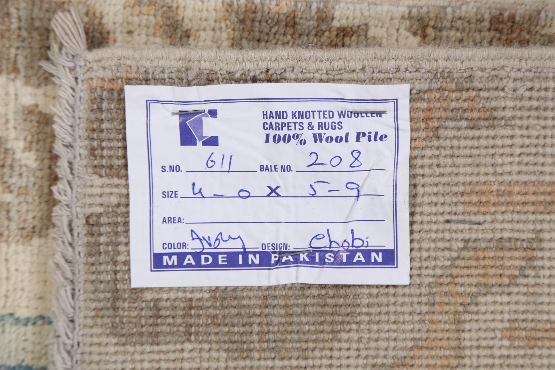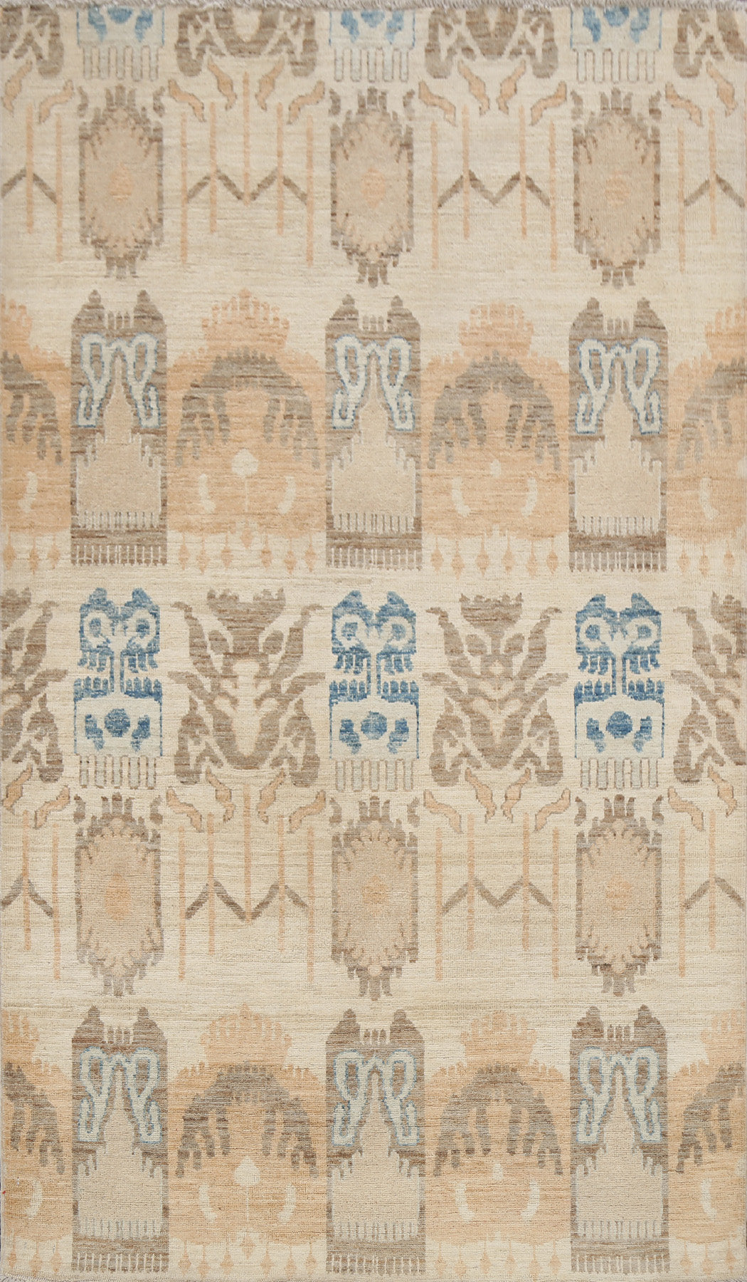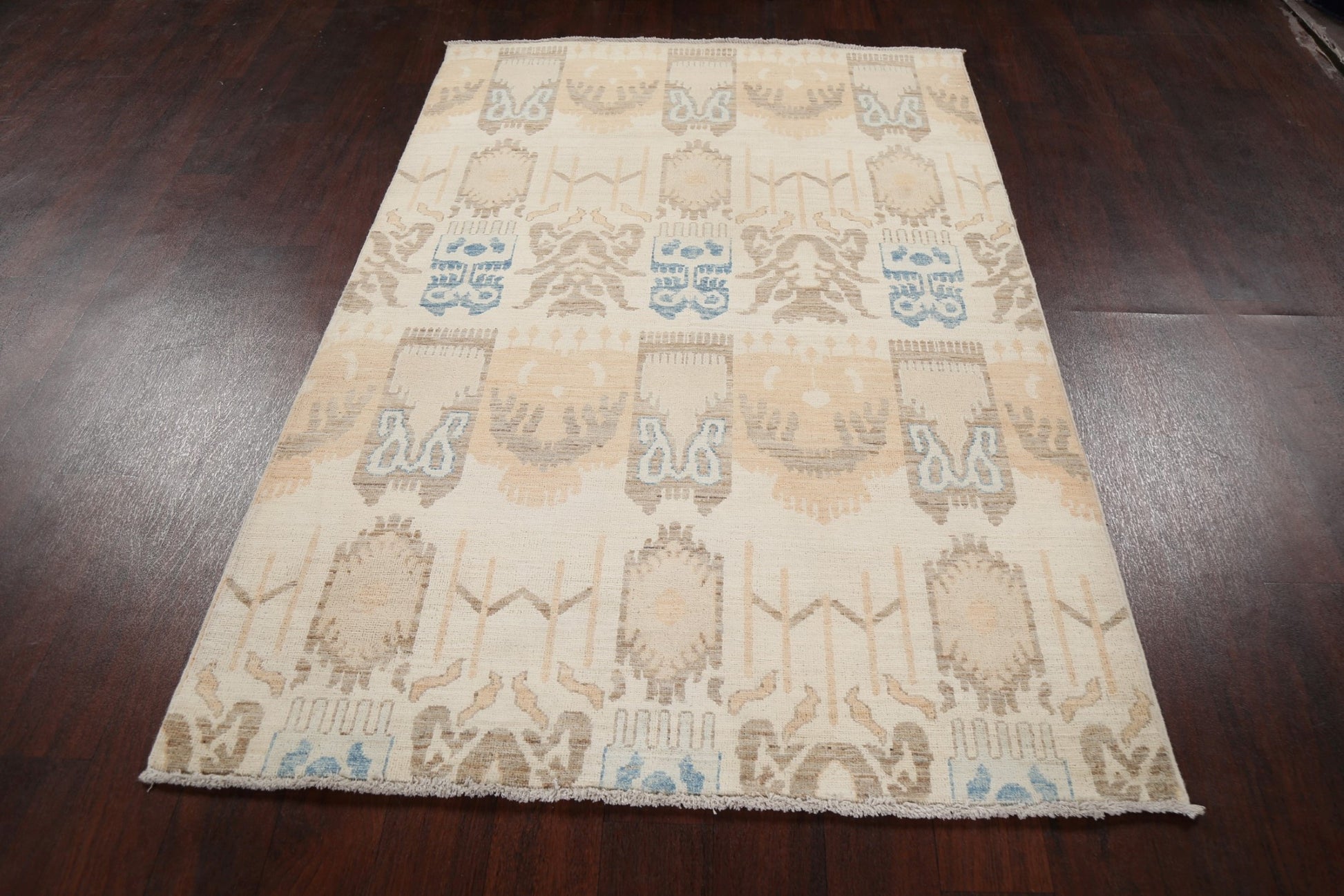 A Beautiful Genuine Pakistan IKats rug is Hand Knotted by skillful weavers in Pakistan with 100% Wool Material. This rug is in New, First Quality condition. dimensions are 5' 9'' X 4' 0'' in foot and 175 X 122 in centimeter. the primary color is Beige & Ivories.
