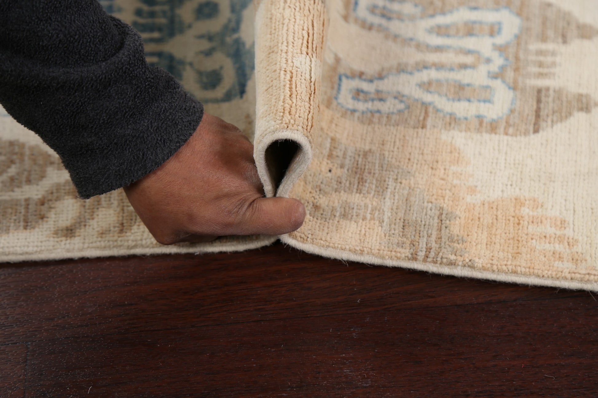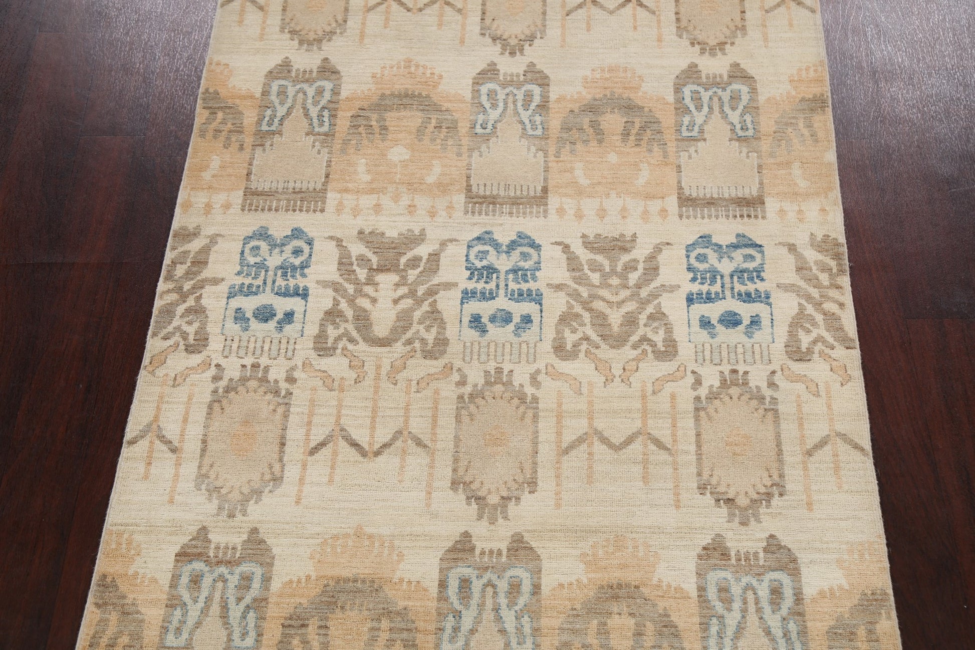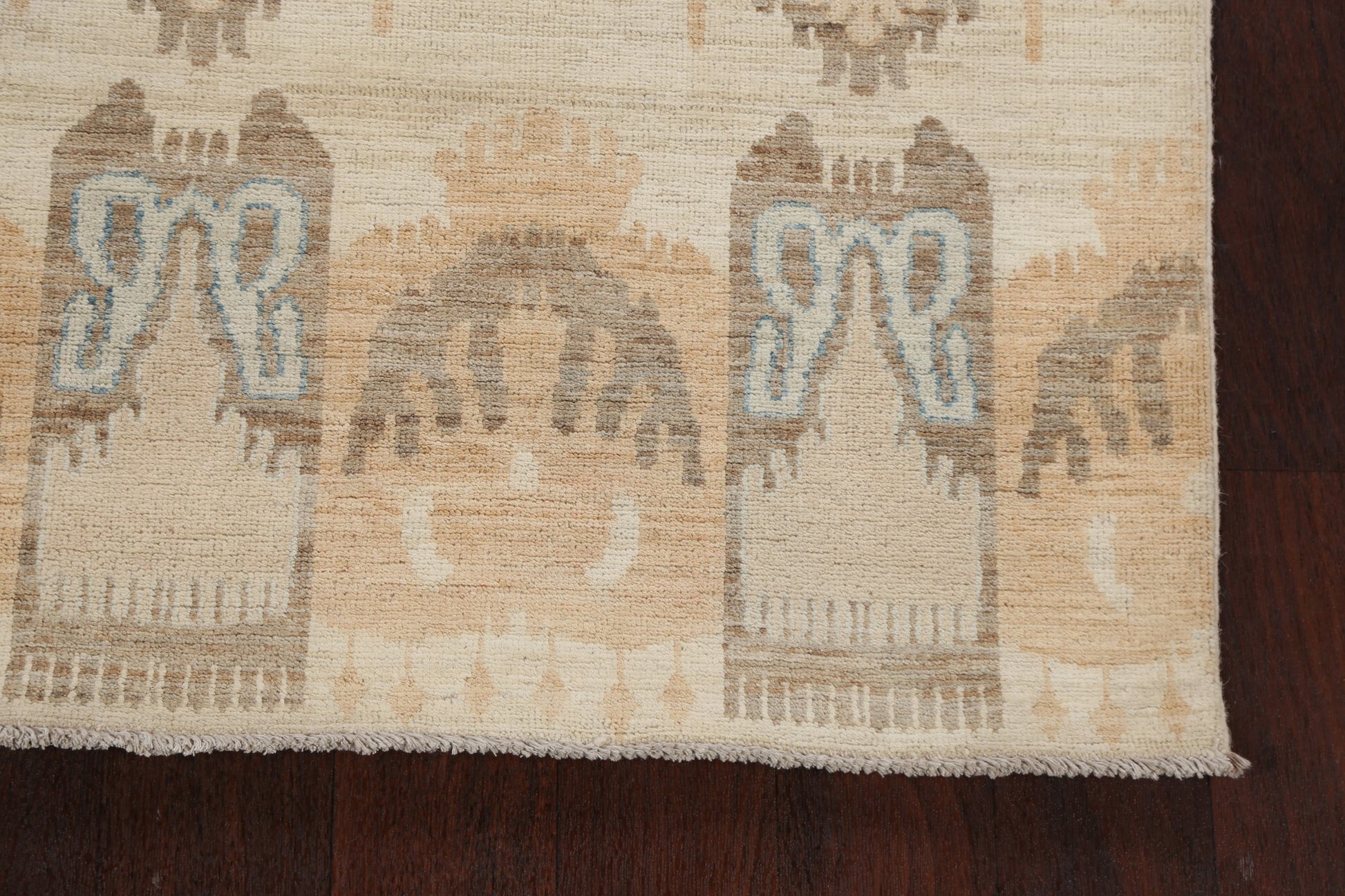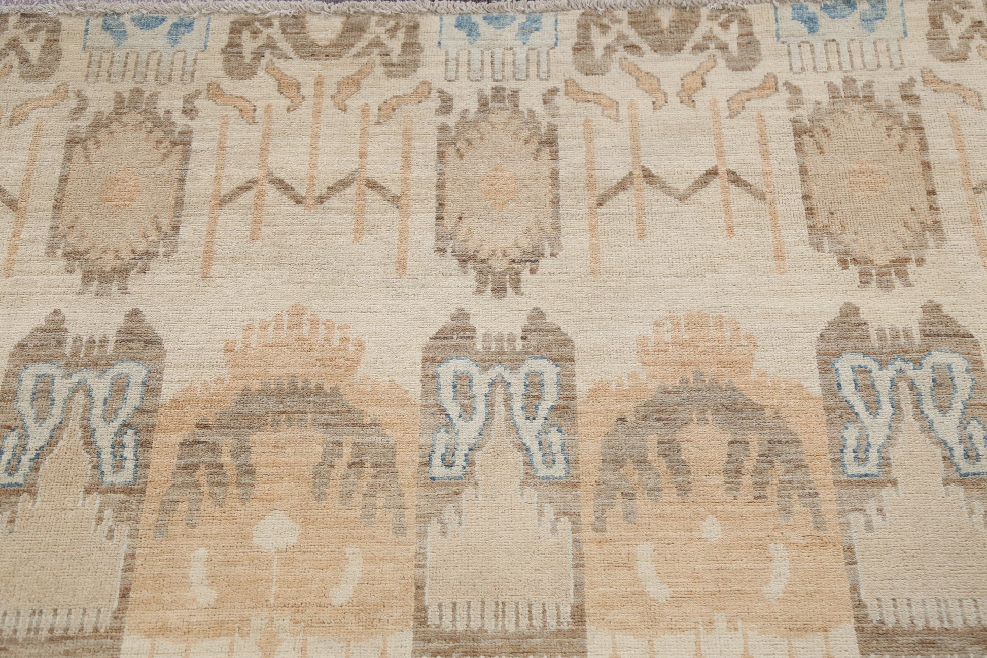 A Beautiful Genuine Pakistan IKats rug is Hand Knotted by skillful weavers in Pakistan with 100% Wool Material. This rug is in New, First Quality condition. dimensions are 5' 9'' X 4' 0'' in foot and 175 X 122 in centimeter. the primary color is Beige & Ivories.