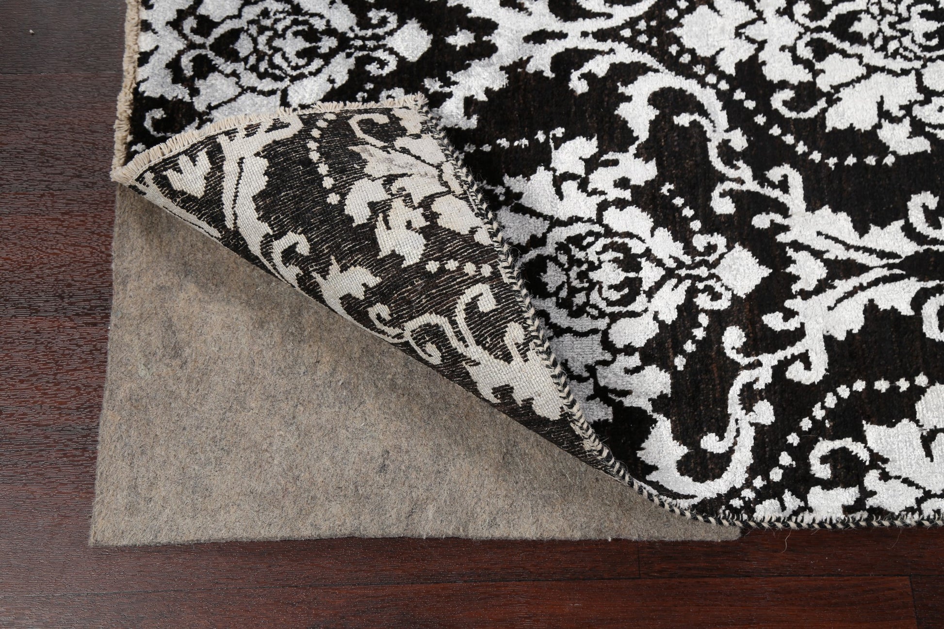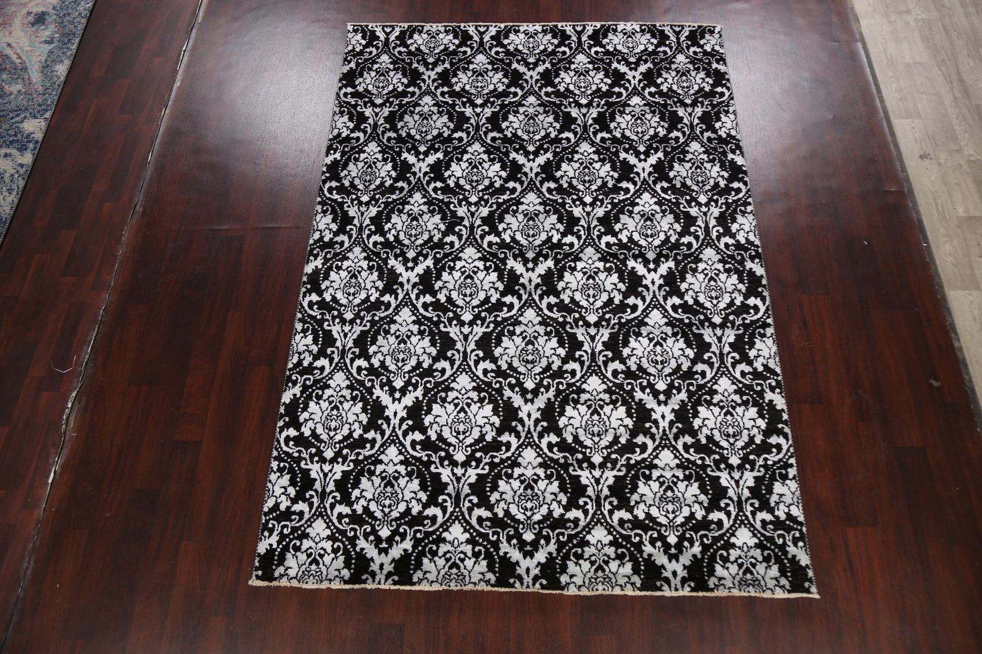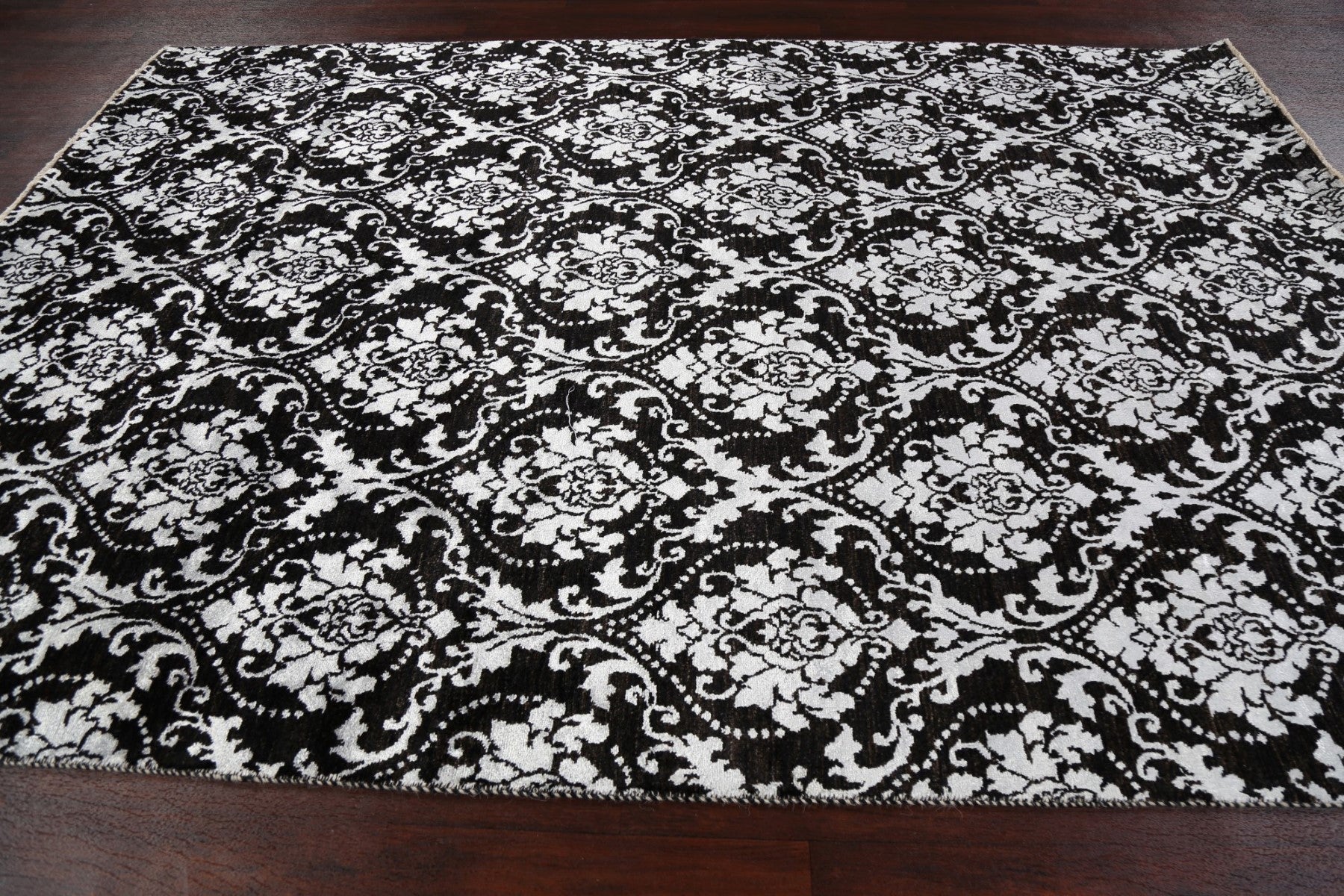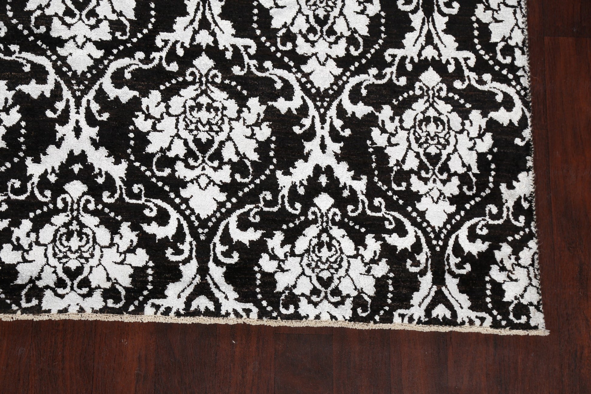 A Beautiful Genuine Pakistan Versace rug is Hand Knotted by skillful weavers in Pakistan with Wool & Silk Material. This rug is in New, First Quality condition. dimensions are 9' 7'' X 6' 8'' in foot and 292 X 203 in centimeter. the primary color is Black.