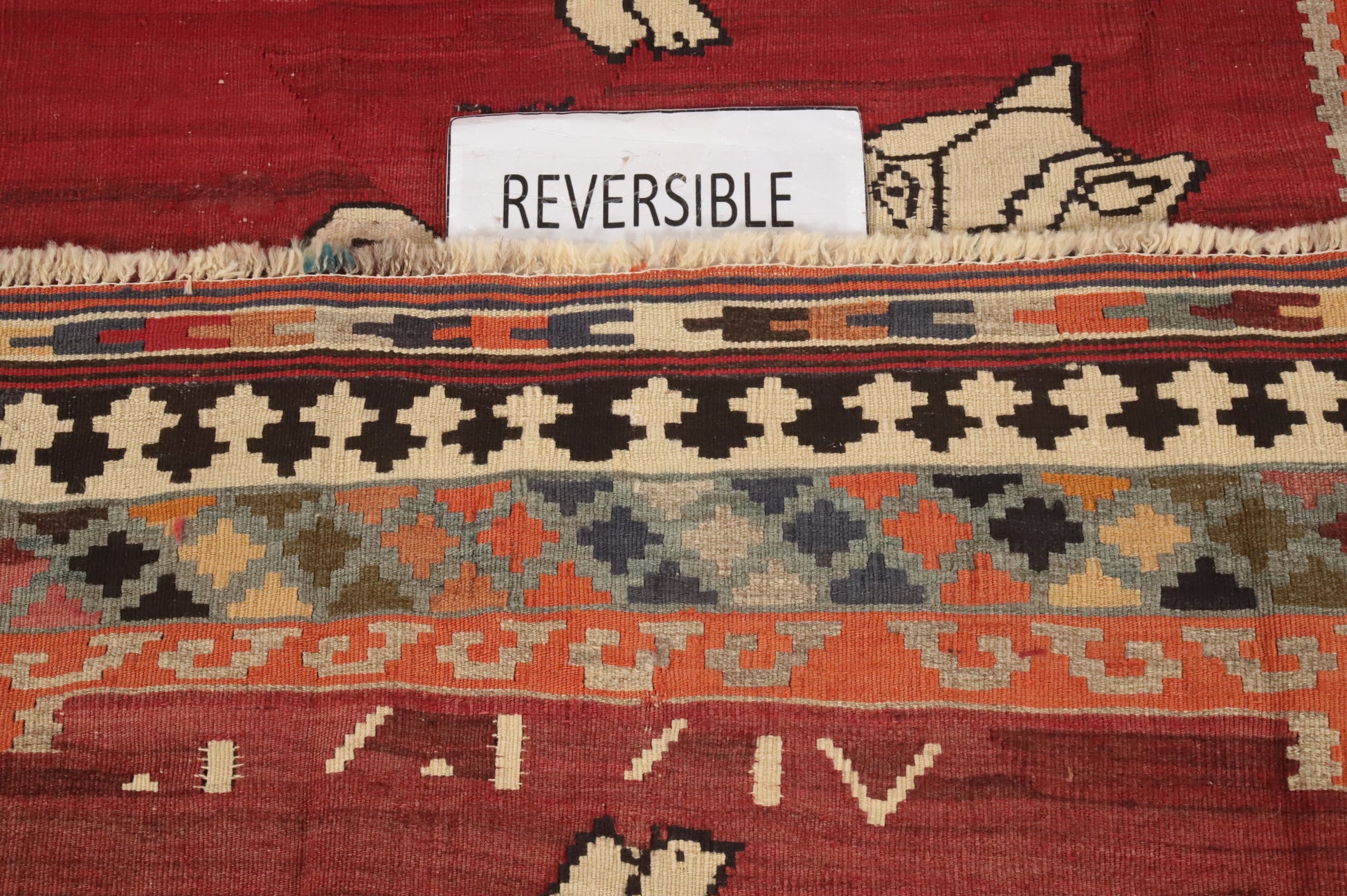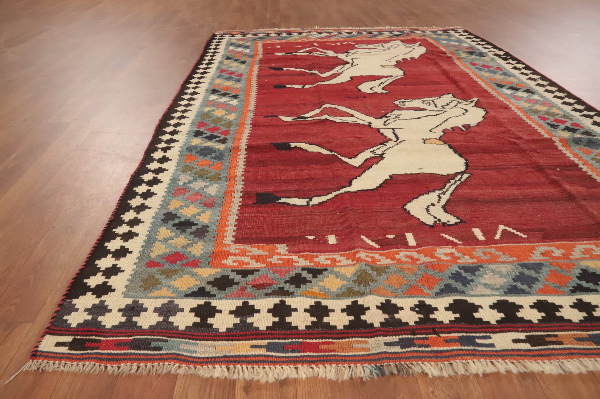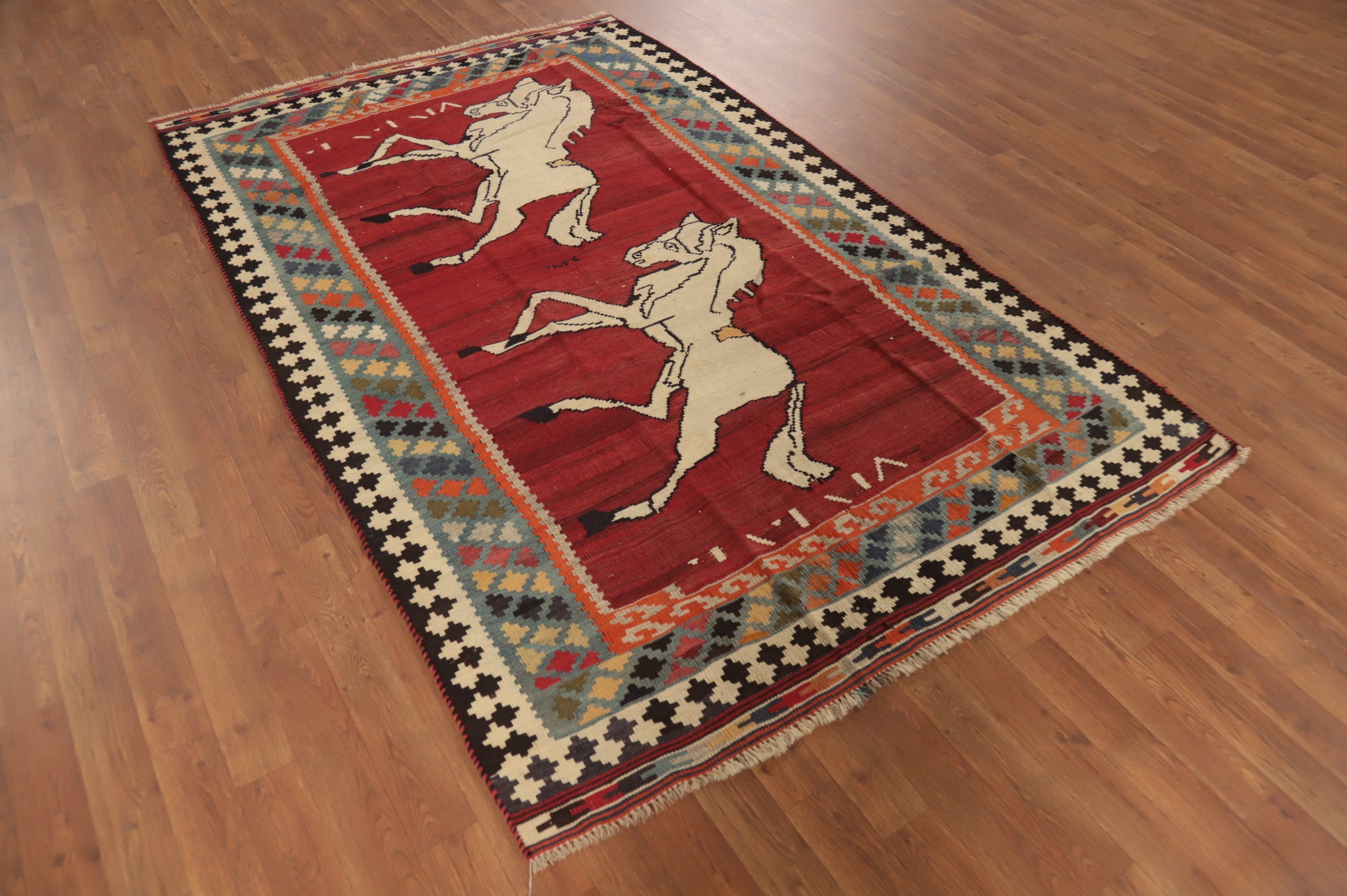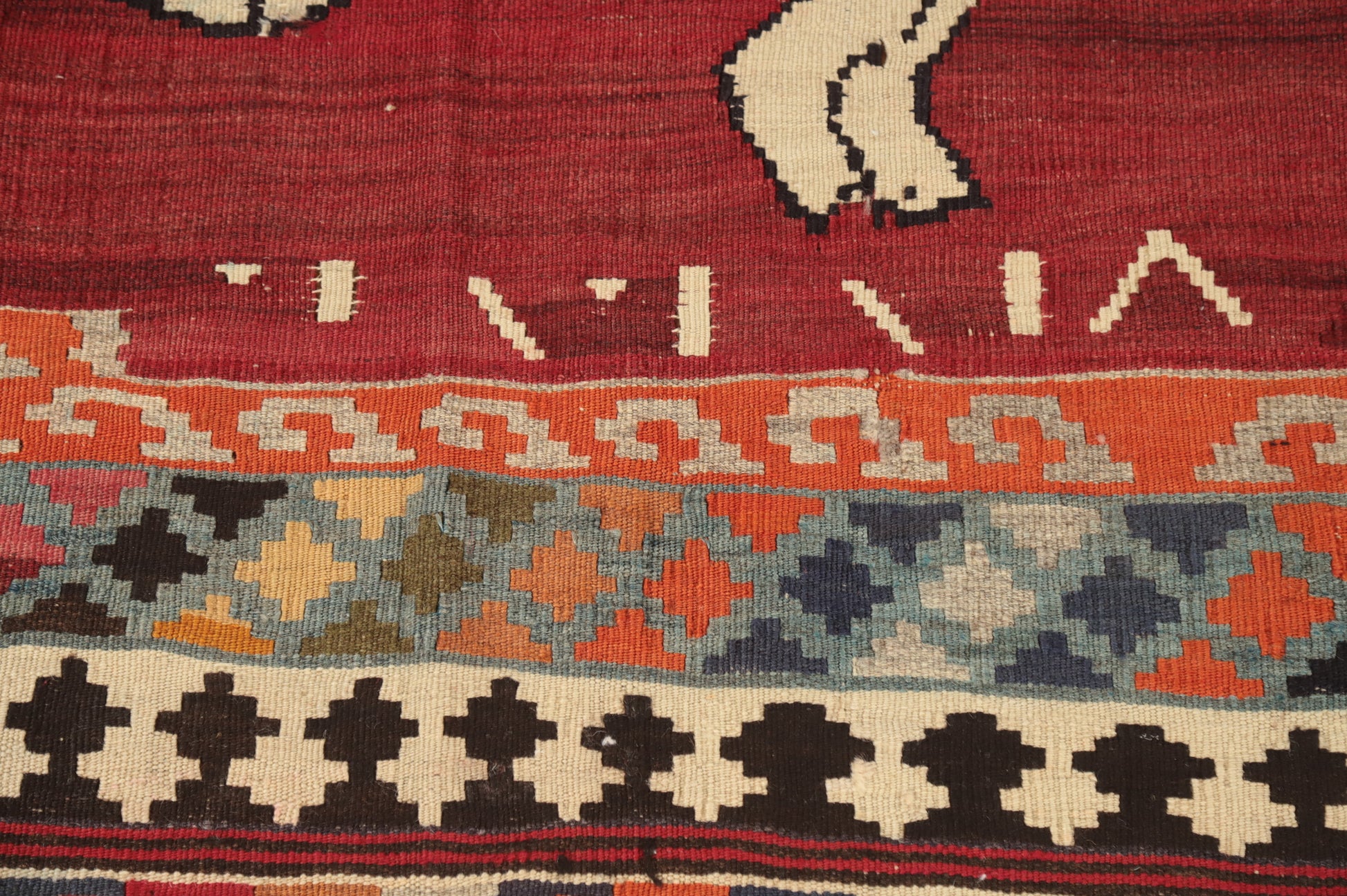 A Beautiful Genuine Persia ( Persia ) Kilim (Qashqai) rug is Hand Woven by skillful weavers in Persia ( Persia ) with 100% Wool Material. This rug is in Very Good (Abrash-Repair) condition. dimensions are 7' 4'' X 4' 8'' in foot and 224 X 142 in centimeter. the primary color is Red.
