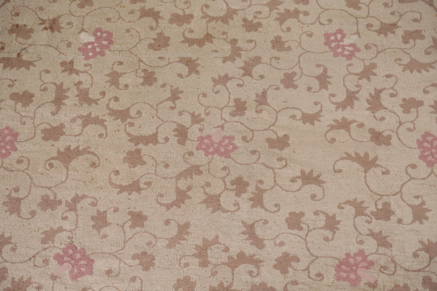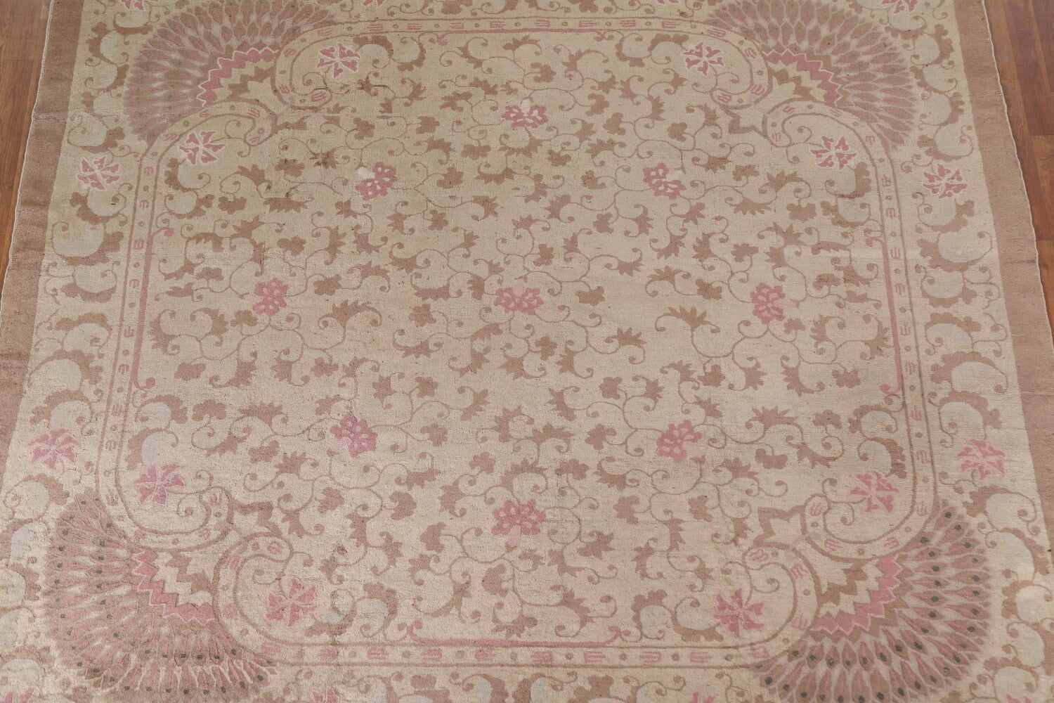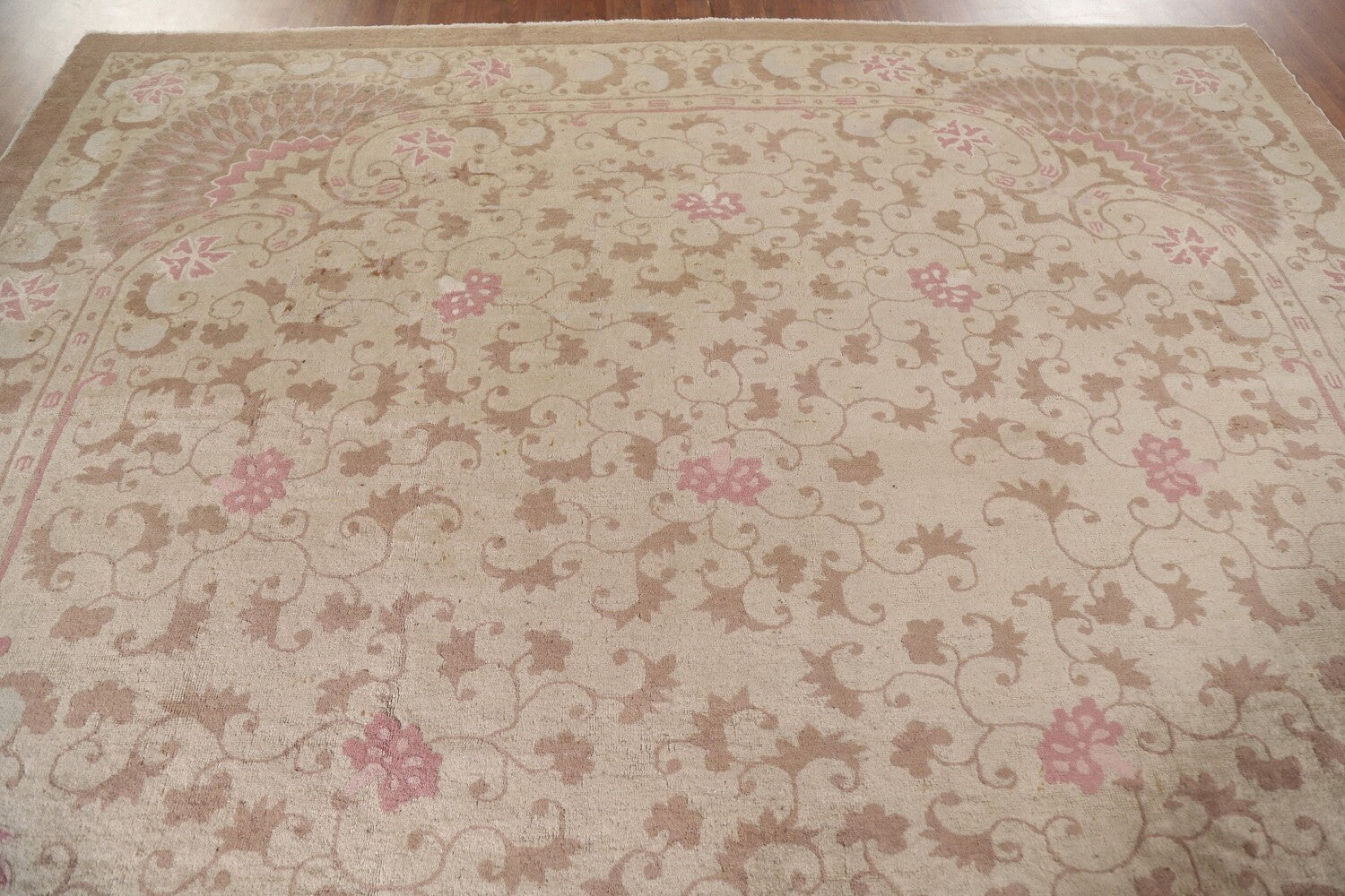 A Beautiful Genuine China Art Deco rug is Hand Knotted by skillful weavers in China with 100% Wool Material. This rug is in Very Good (Small Low Pile Area) condition. dimensions are 8' 7'' X 9' 2'' in foot and 262 X 279 in centimeter. the primary color is Beige & Ivories.