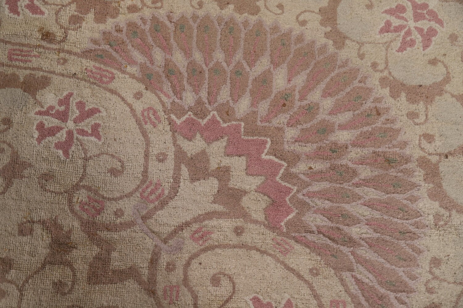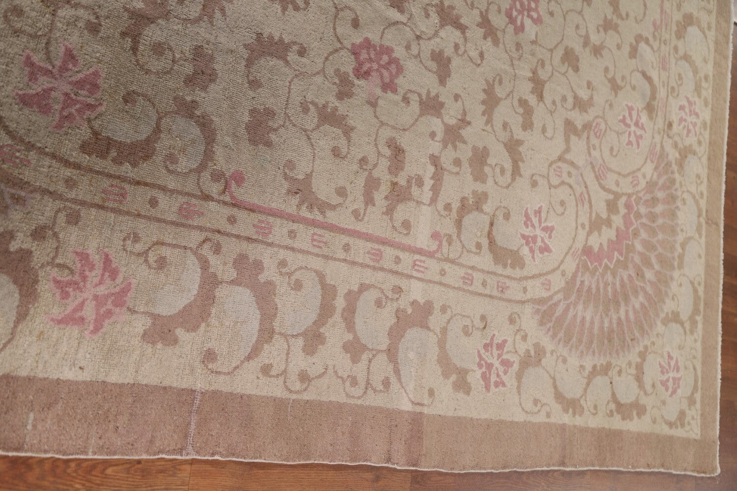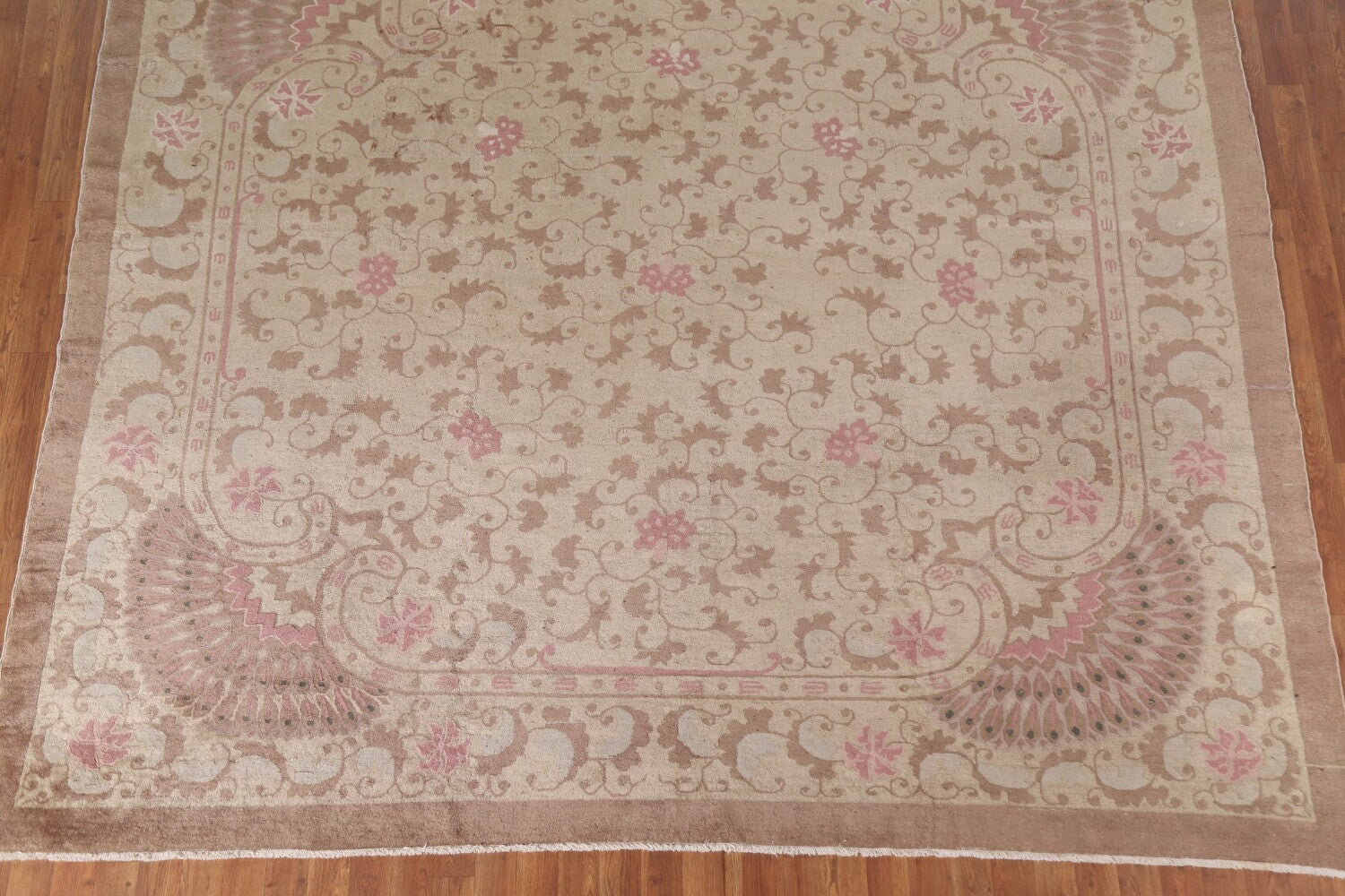 A Beautiful Genuine China Art Deco rug is Hand Knotted by skillful weavers in China with 100% Wool Material. This rug is in Very Good (Small Low Pile Area) condition. dimensions are 8' 7'' X 9' 2'' in foot and 262 X 279 in centimeter. the primary color is Beige & Ivories.