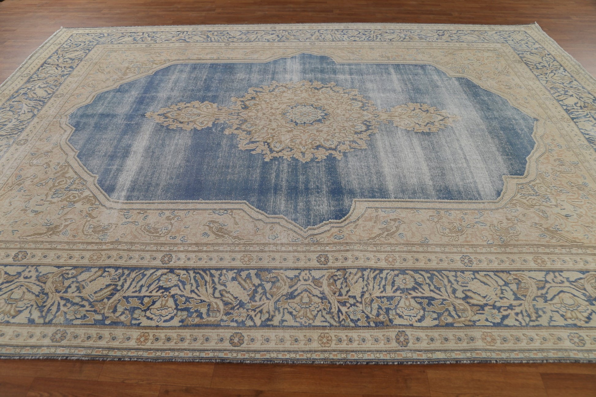 A Beautiful Genuine Persia ( Persia ) Kerman rug is Hand Knotted by skillful weavers in Persia ( Persia ) with 100% Wool Material. This rug is in Very Good (Evenly Low Pile) condition. dimensions are 12' 6'' X 9' 2'' in foot and 381 X 279 in centimeter. the primary color is Navy Blue & Blues.