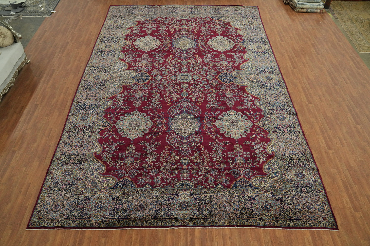 A Beautiful Genuine Persia ( Persia ) Kerman rug is Hand Knotted by skillful weavers in Persia ( Persia ) with 100% Wool Material. This rug is in very good (small low pile) condition. dimensions are 19' 4'' X 12' 9'' in foot and 589 X 389 in centimeter. the primary color is Red.