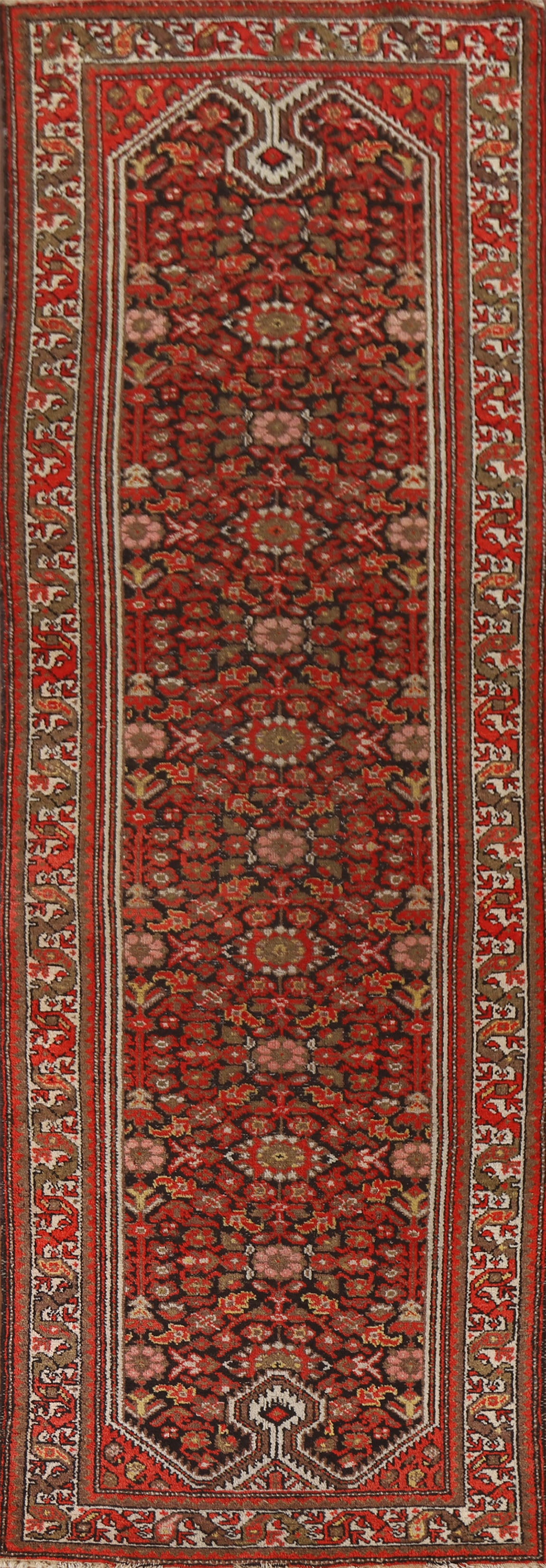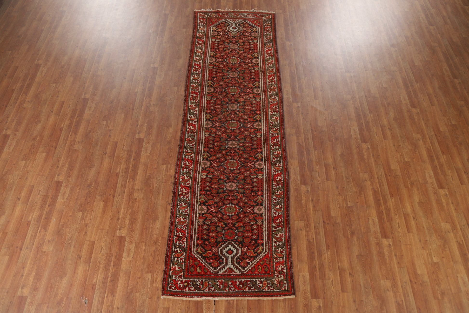 A Beautiful Genuine Persia ( Persia ) Malayer (100% Vegetable Dye) rug is Hand Knotted by skillful weavers in Persia ( Persia ) with 100% Wool Material. This rug is in Very Good (Evenly Low Pile) condition. dimensions are 11' 9'' X 3' 5'' in foot and 358 X 104 in centimeter. the primary color is Red.
