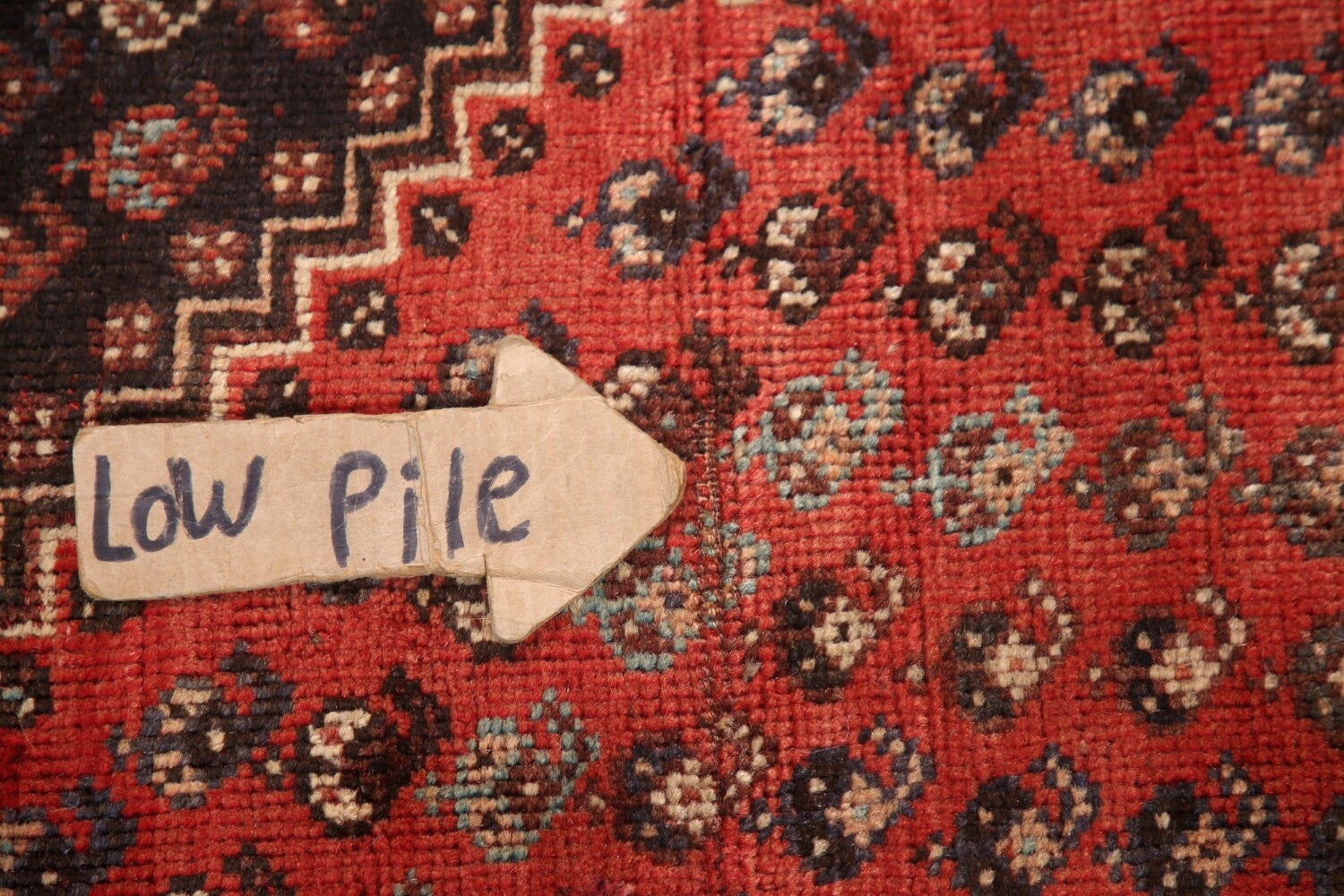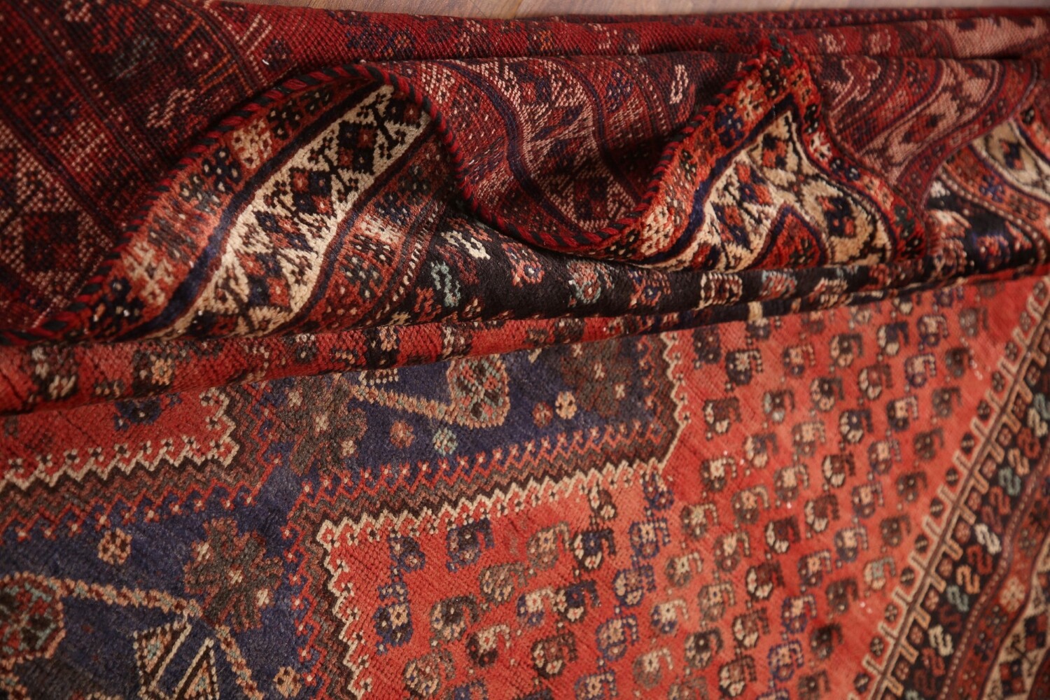 A Beautiful Genuine Persia ( Persia ) Shiraz rug is Hand Knotted by skillful weavers in Persia ( Persia ) with 100% Wool Material. This rug is in Very Good (Low Pile-Abrash) condition. dimensions are 9' 7'' X 6' 7'' in foot and 292 X 201 in centimeter. the primary color is Red.