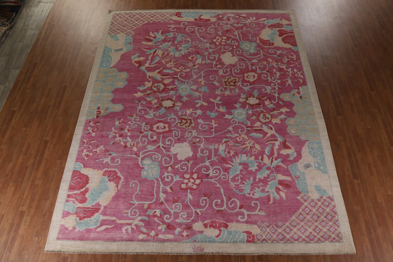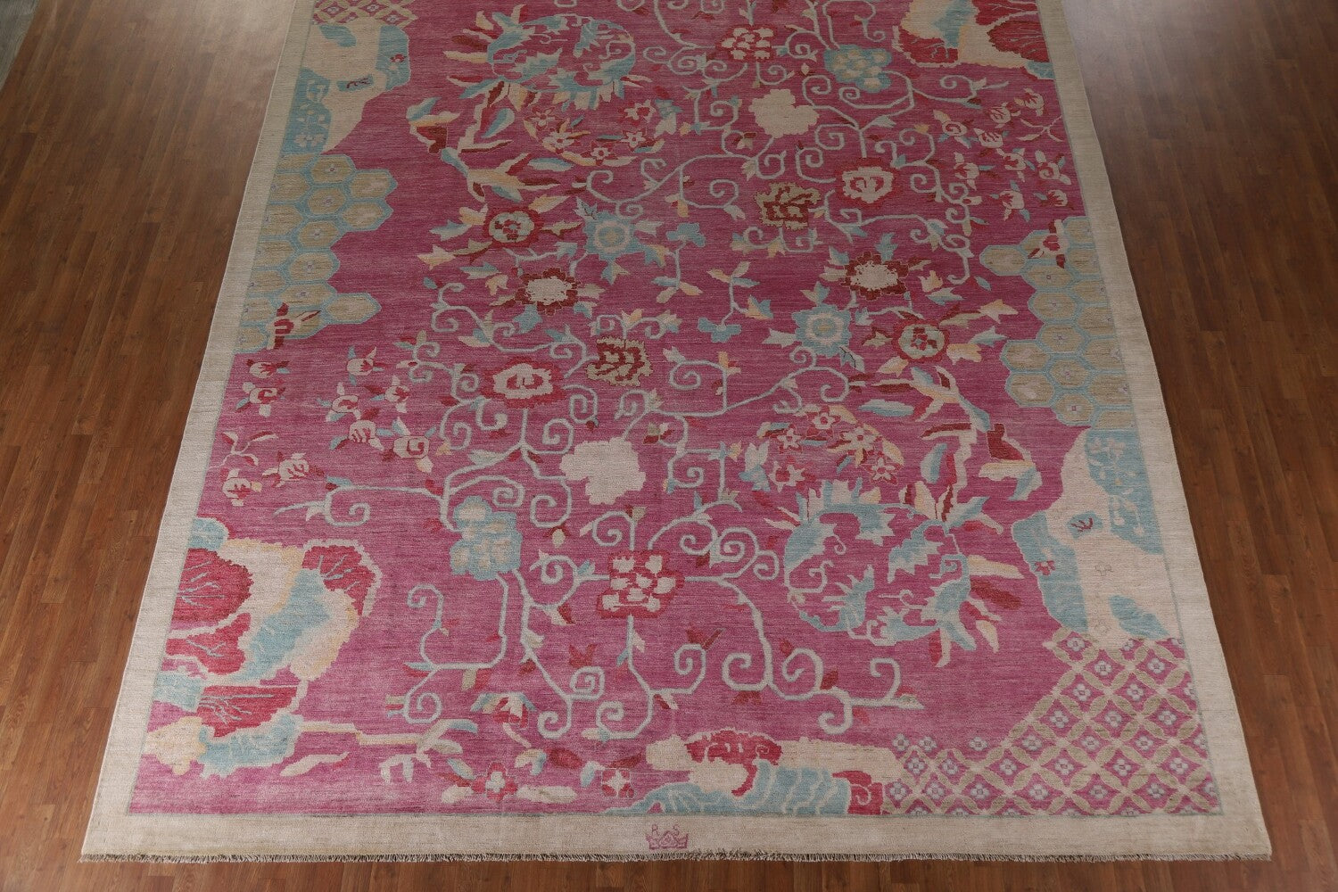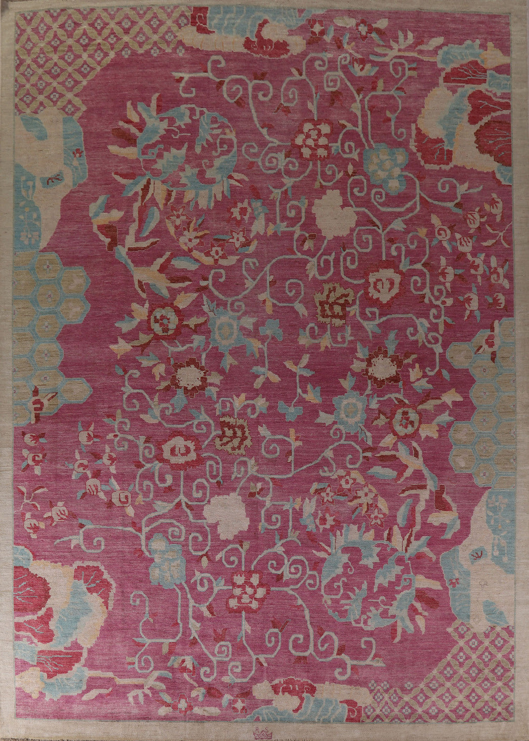 A Beautiful Genuine China Art Deco rug is Hand Knotted by skillful weavers in China with 100% Wool Material. This rug is in New, First Quality condition. dimensions are 14' 3'' X 11' 9'' in foot and 434 X 358 in centimeter. the primary color is Pink.