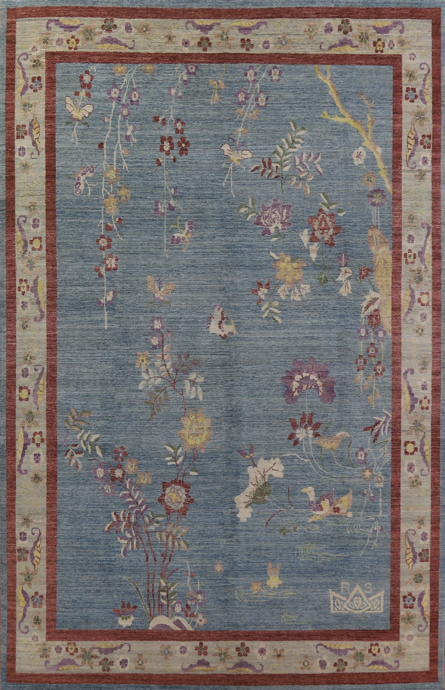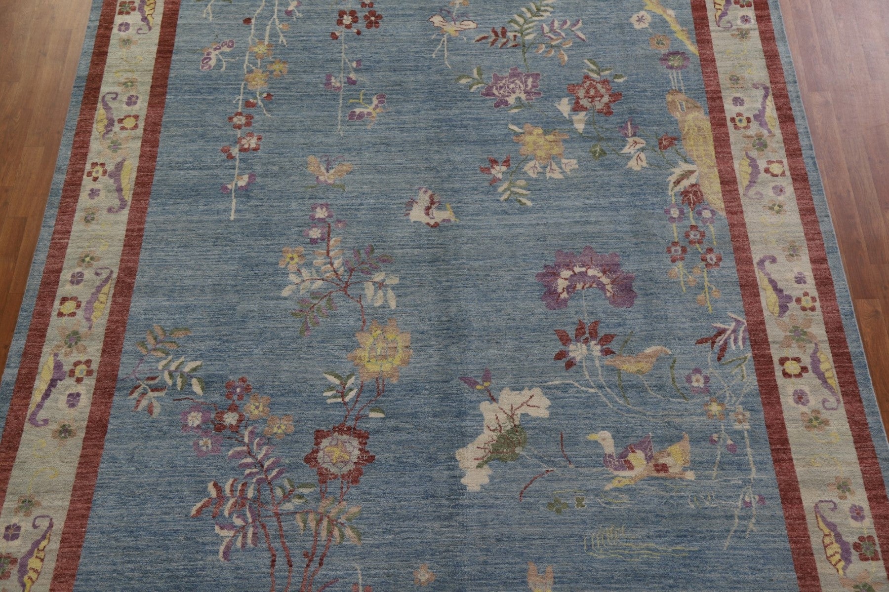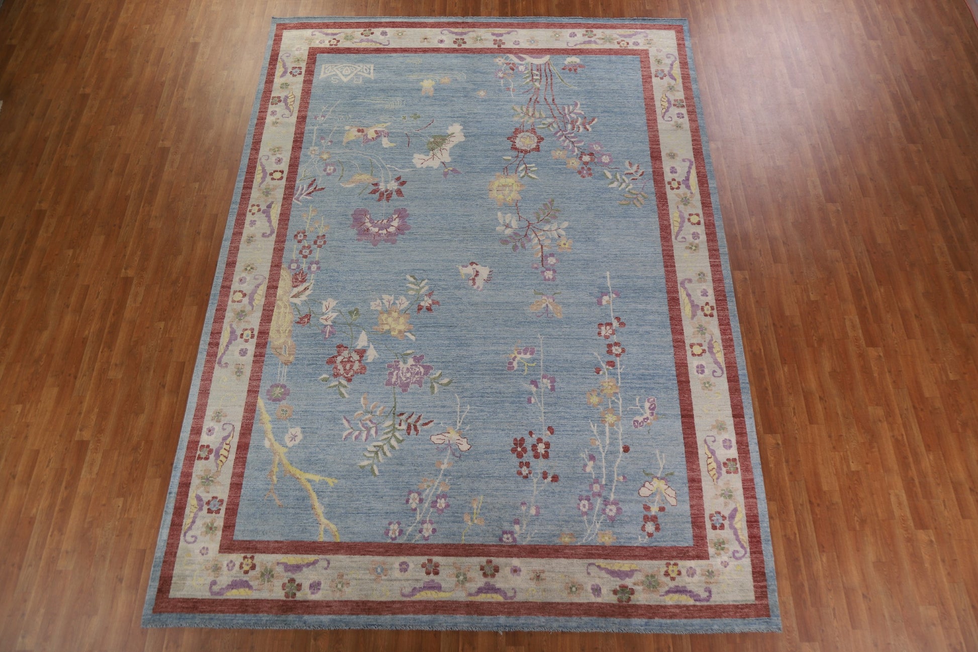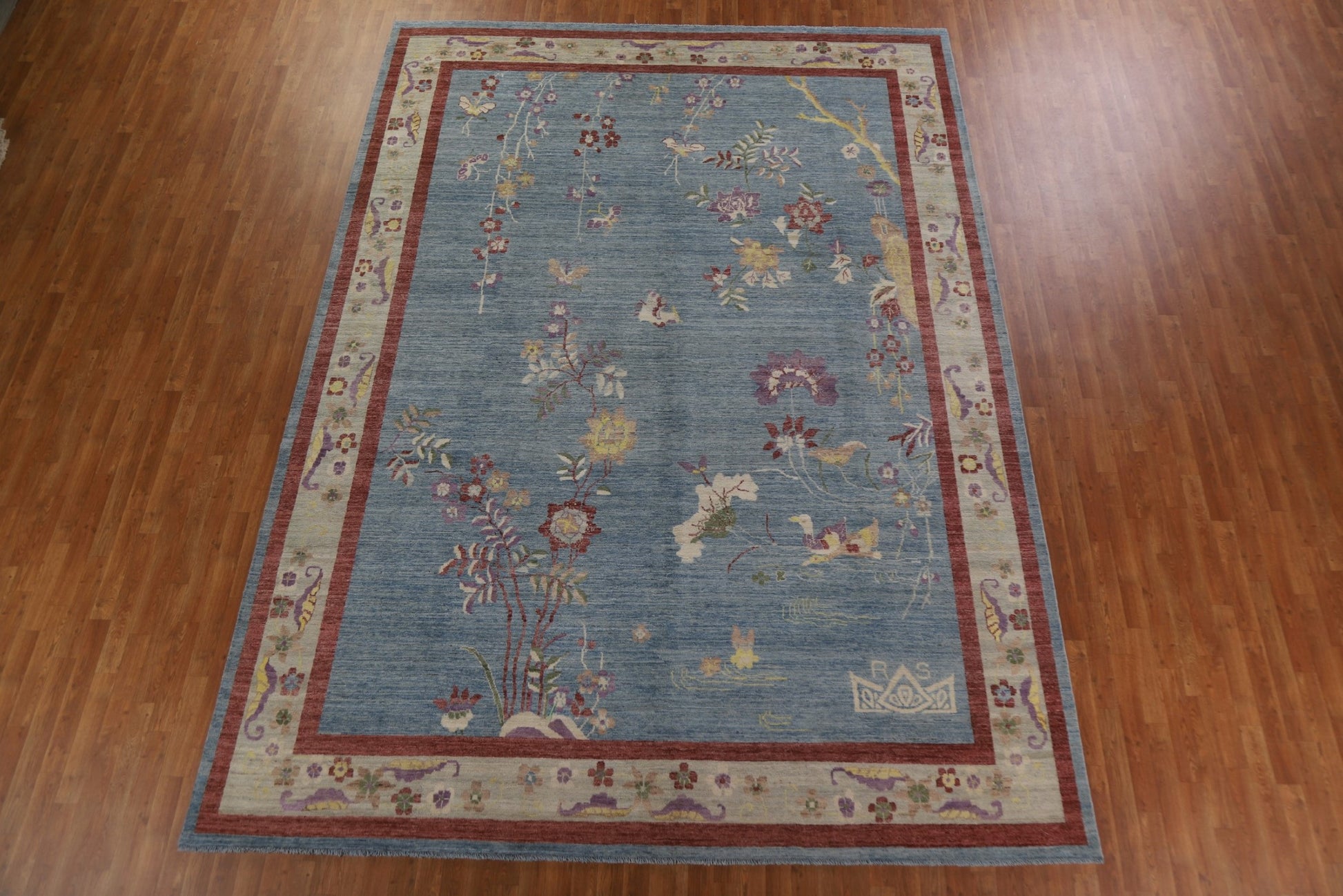 A Beautiful Genuine China Art Deco rug is Hand Knotted by skillful weavers in China with 100% Wool Material. This rug is in New, First Quality condition. dimensions are 13' 5'' X 9' 9'' in foot and 409 X 297 in centimeter. the primary color is Navy Blue & Blues.