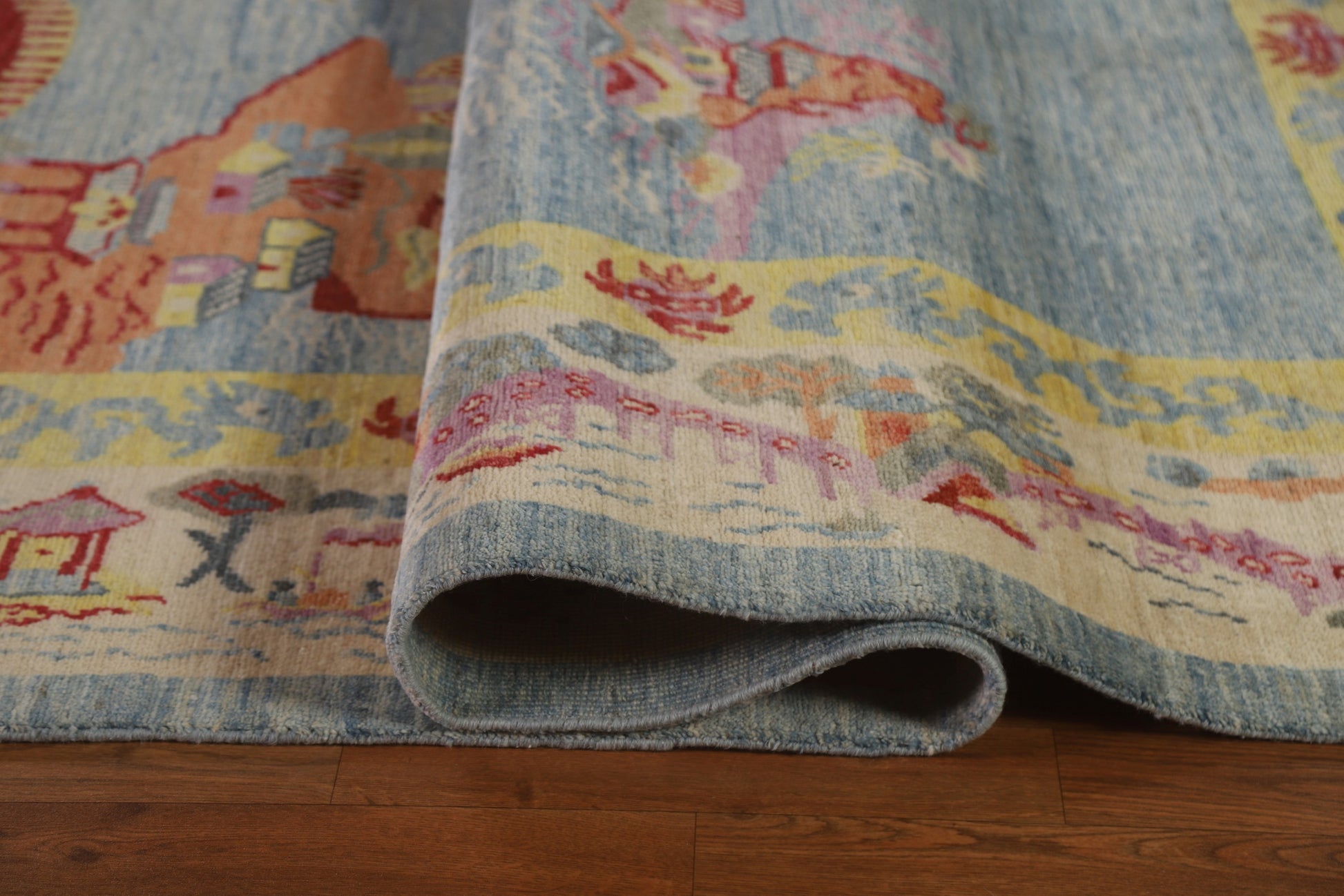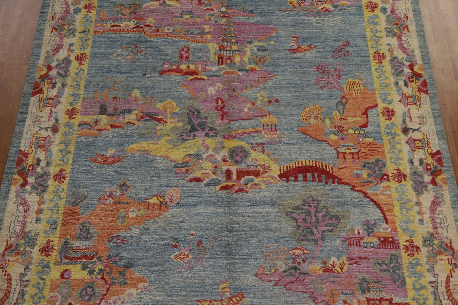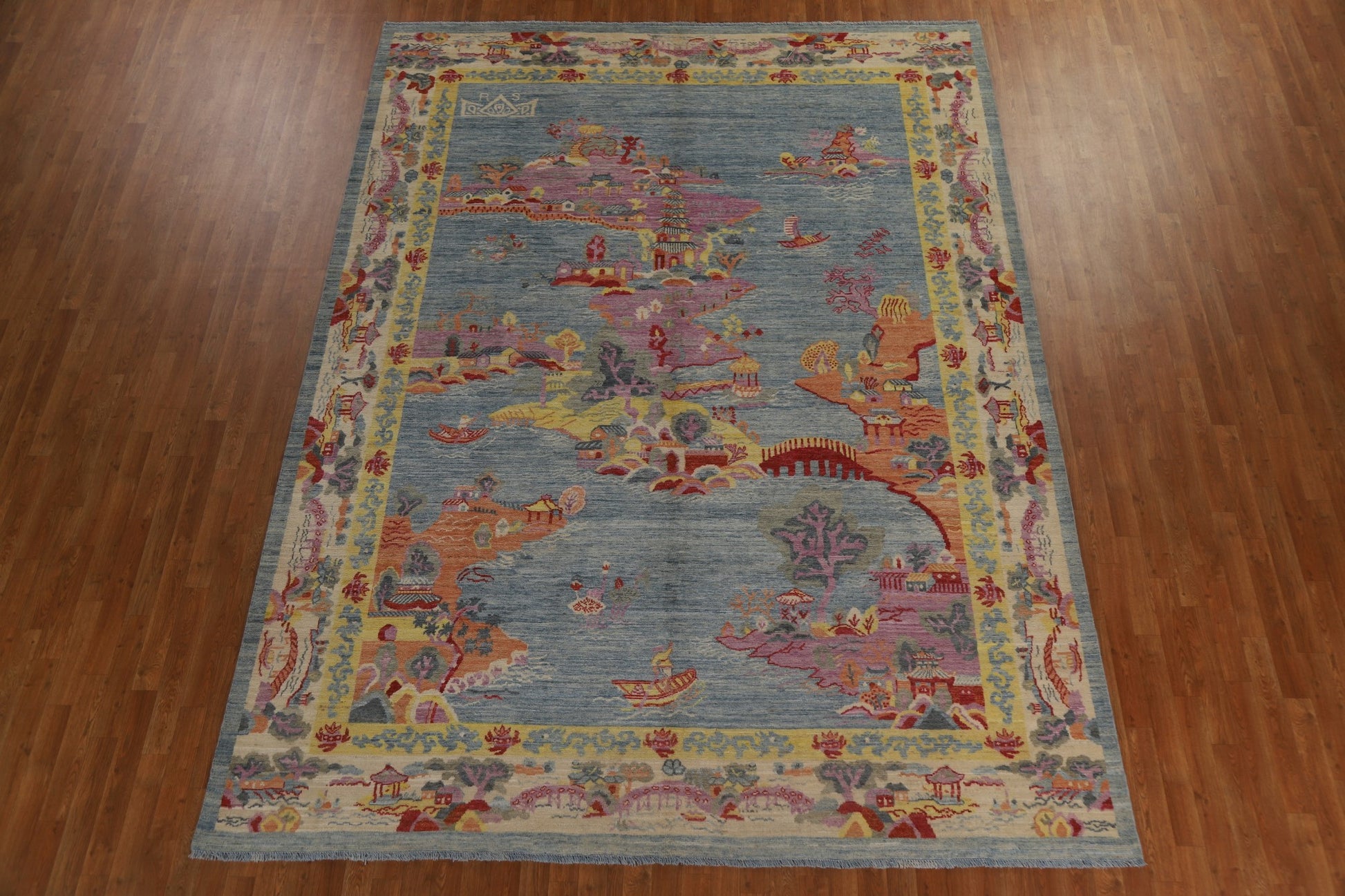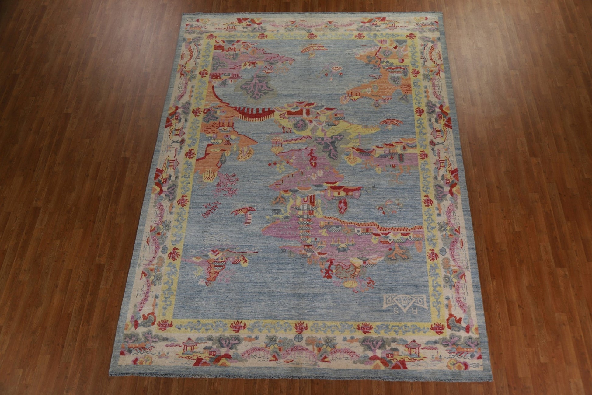 A Beautiful Genuine China Art Deco rug is Hand Knotted by skillful weavers in China with 100% Wool Material. This rug is in New, First Quality condition. dimensions are 11' 10'' X 8' 9'' in foot and 361 X 267 in centimeter. the primary color is Navy Blue & Blues.
