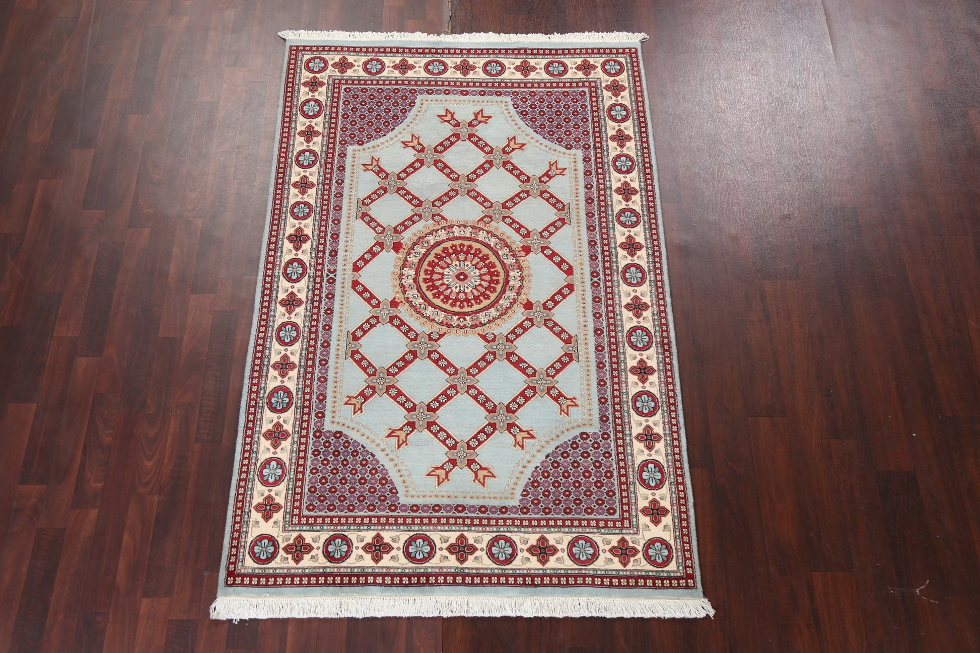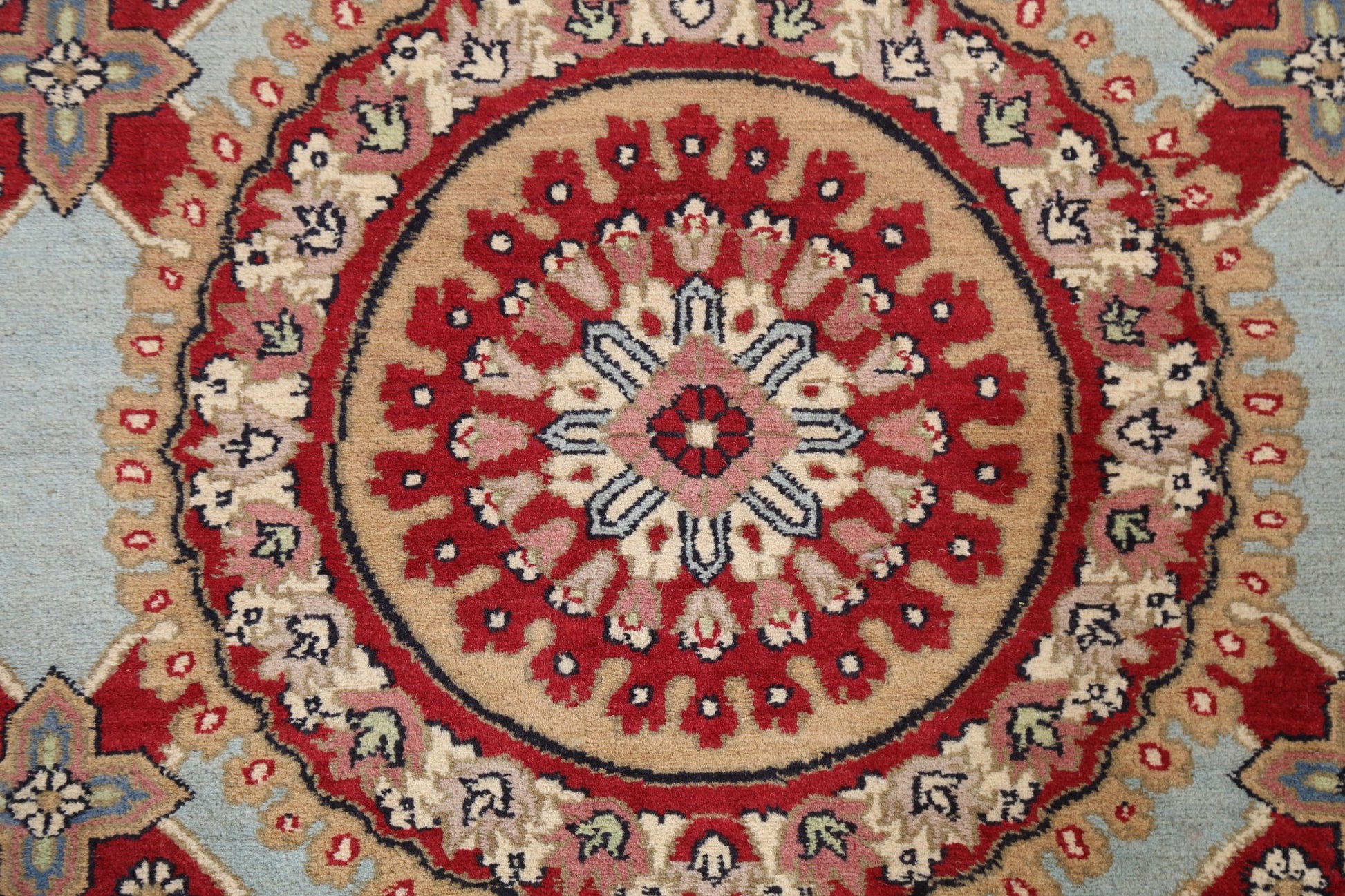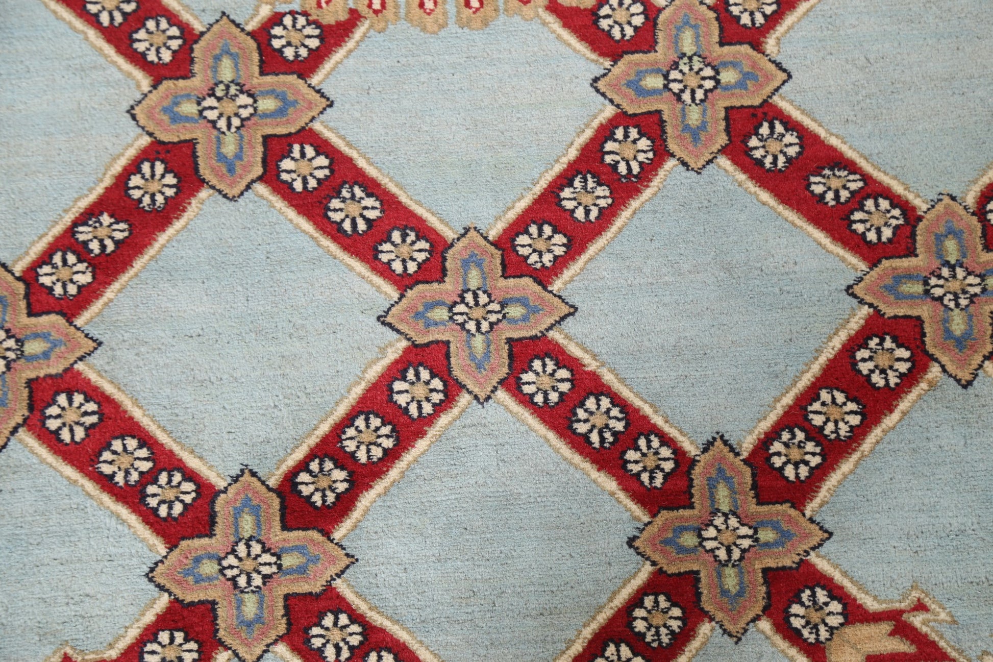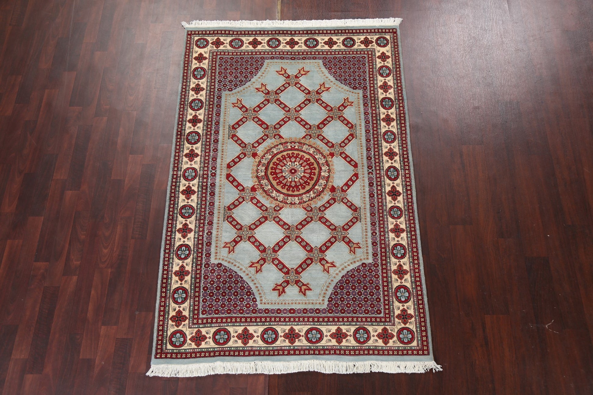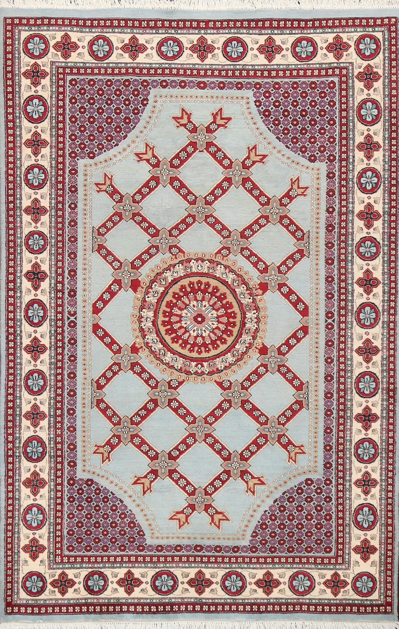 A Beautiful Genuine Pakistan Aubusson rug is Hand Knotted by skillful weavers in Pakistan with 100% Wool Material. This rug is in New, First Quality condition. dimensions are 7' 1'' X 4' 7'' in foot and 216 X 140 in centimeter. the primary color is Navy Blue & Blues.