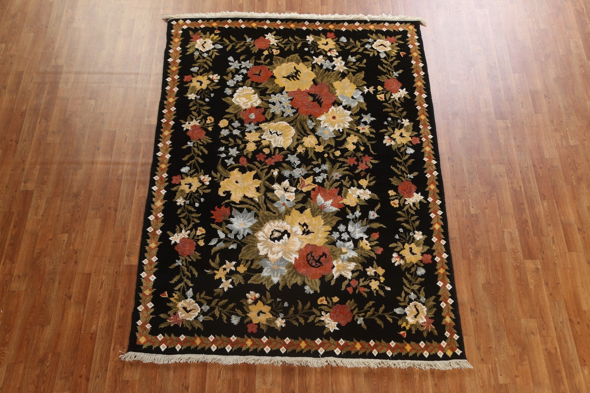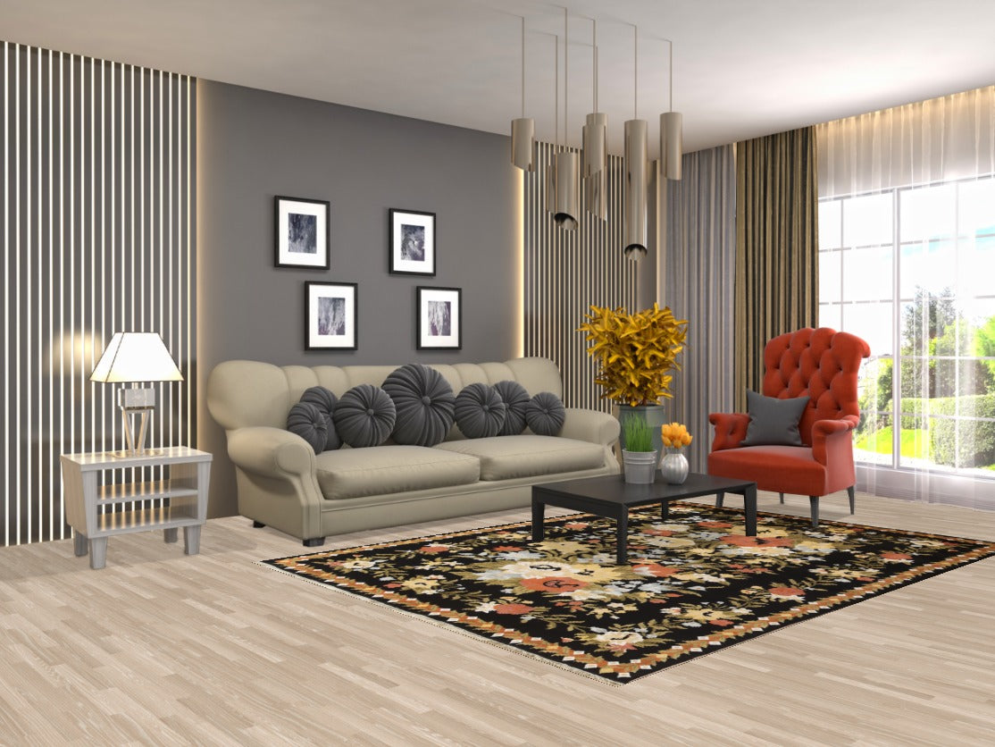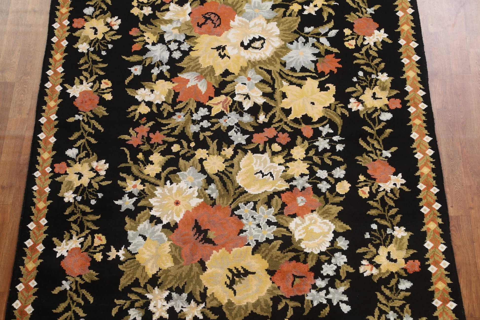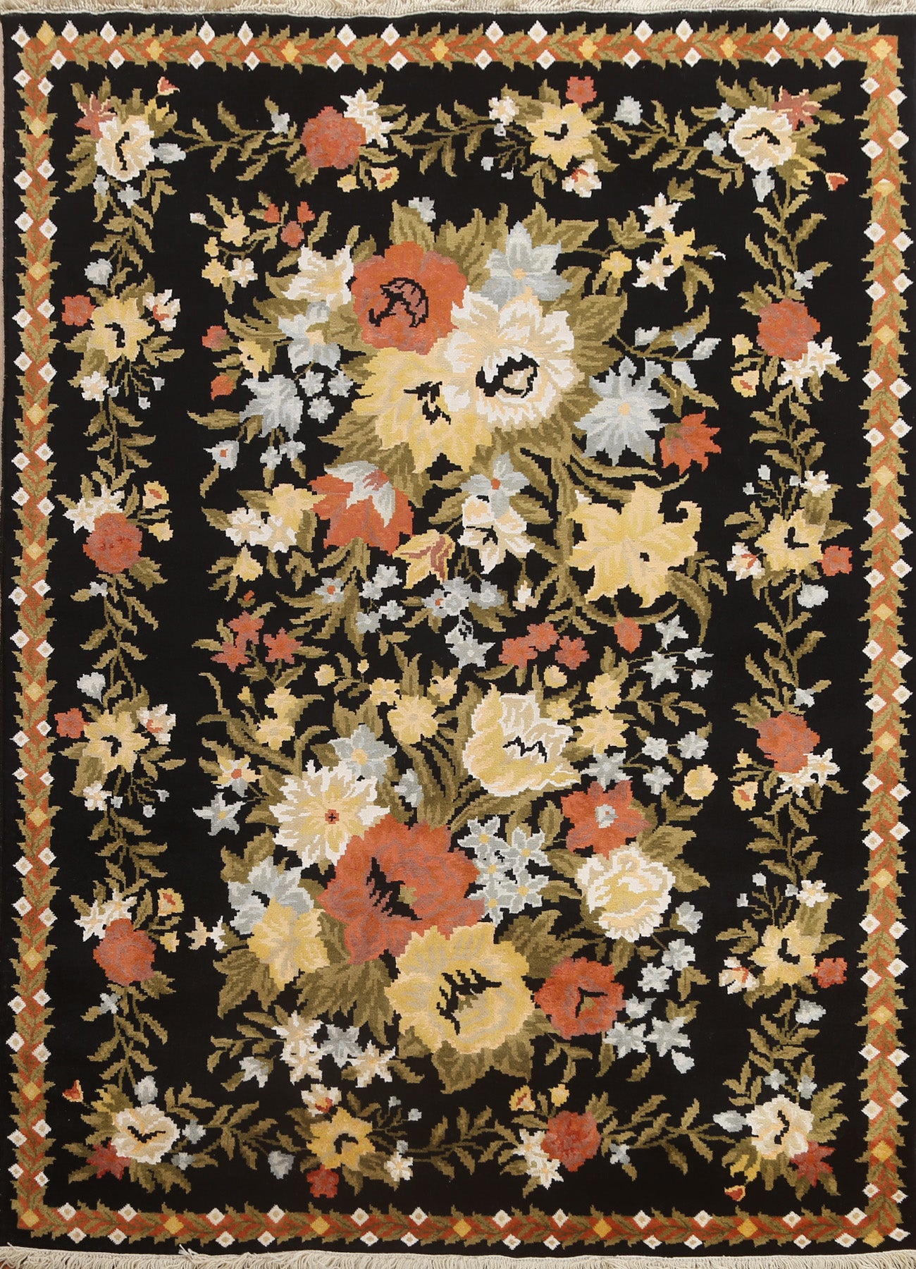 A Beautiful Genuine India Aubusson rug is Hand Knotted by skillful weavers in India with Wool & Silk Material. This rug is in New, First Quality condition. dimensions are 8' 2'' X 5' 9'' in foot and 249 X 175 in centimeter. the primary color is Black.