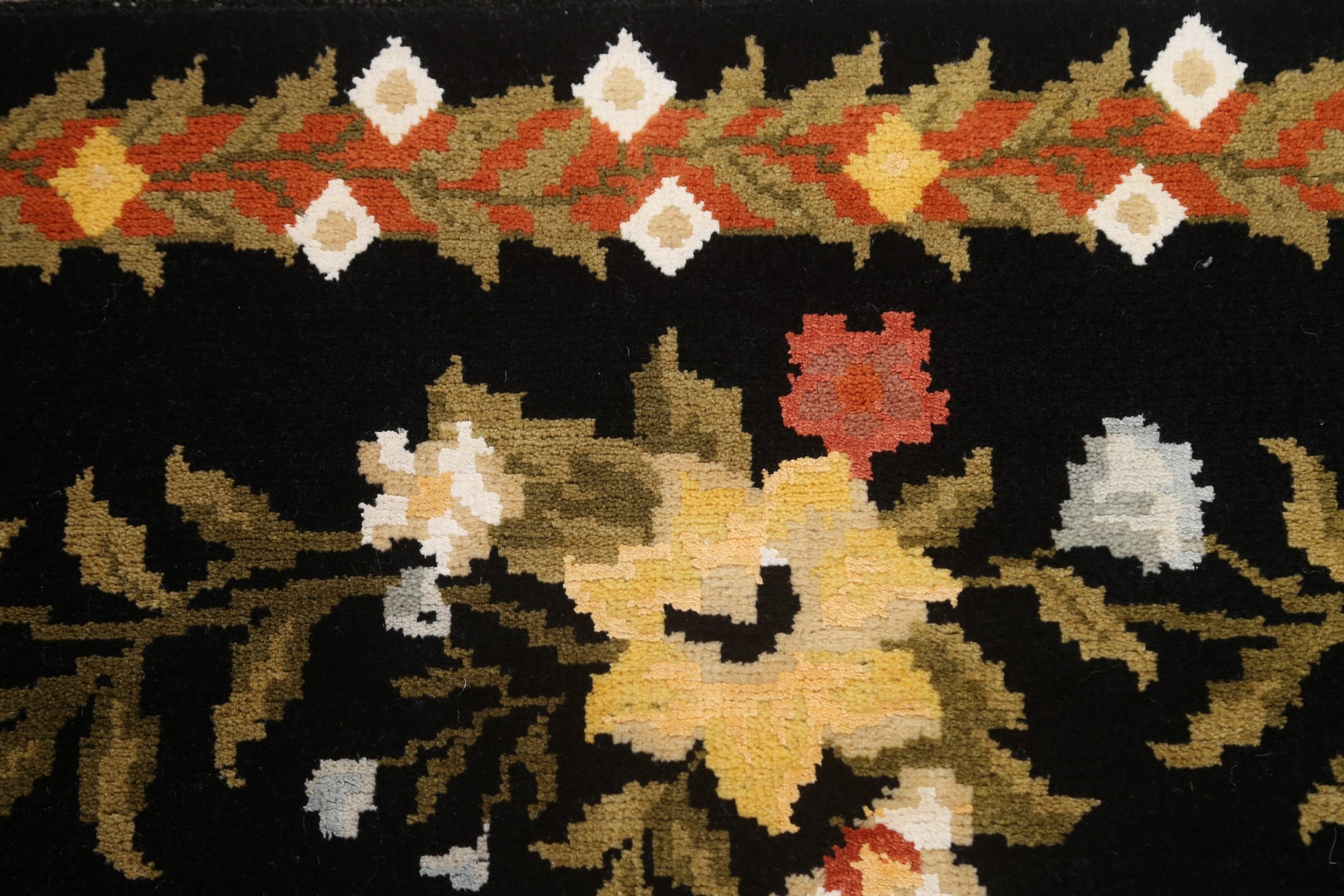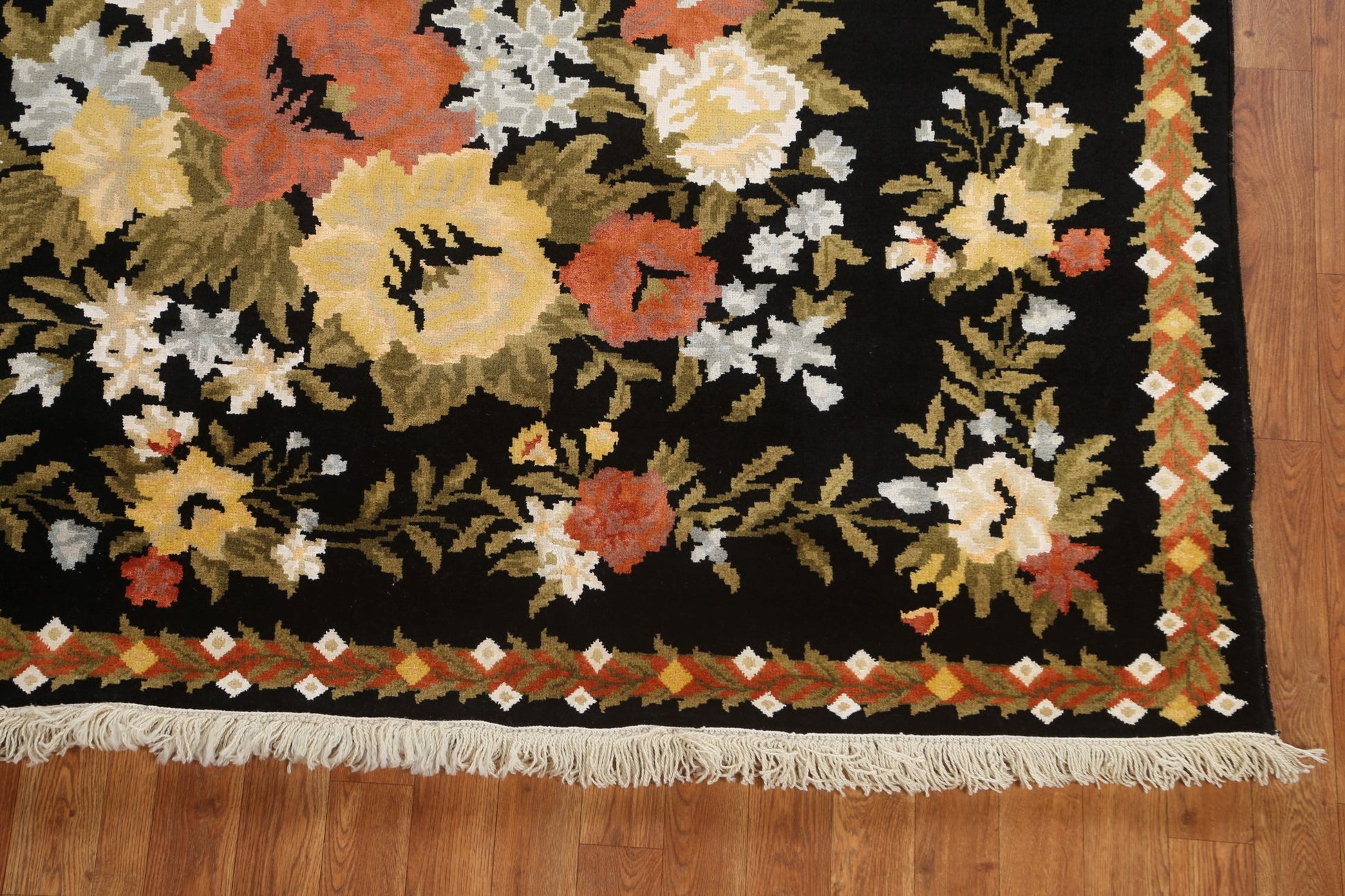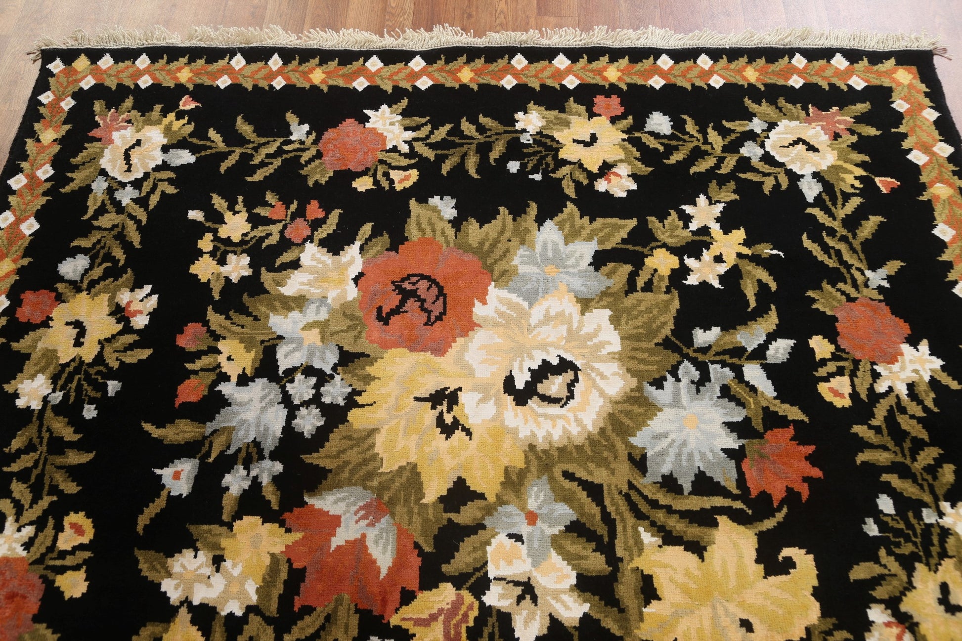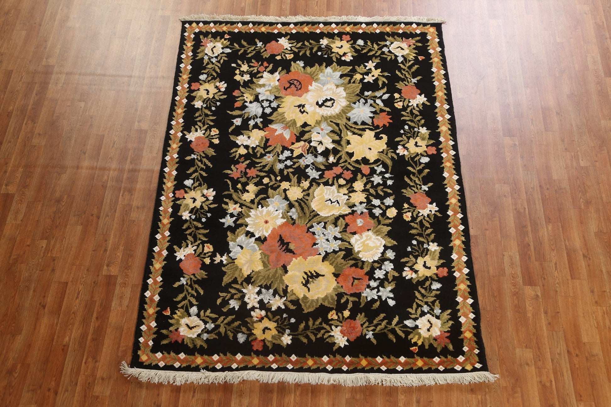 A Beautiful Genuine India Aubusson rug is Hand Knotted by skillful weavers in India with Wool & Silk Material. This rug is in New, First Quality condition. dimensions are 8' 2'' X 5' 9'' in foot and 249 X 175 in centimeter. the primary color is Black.