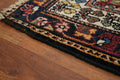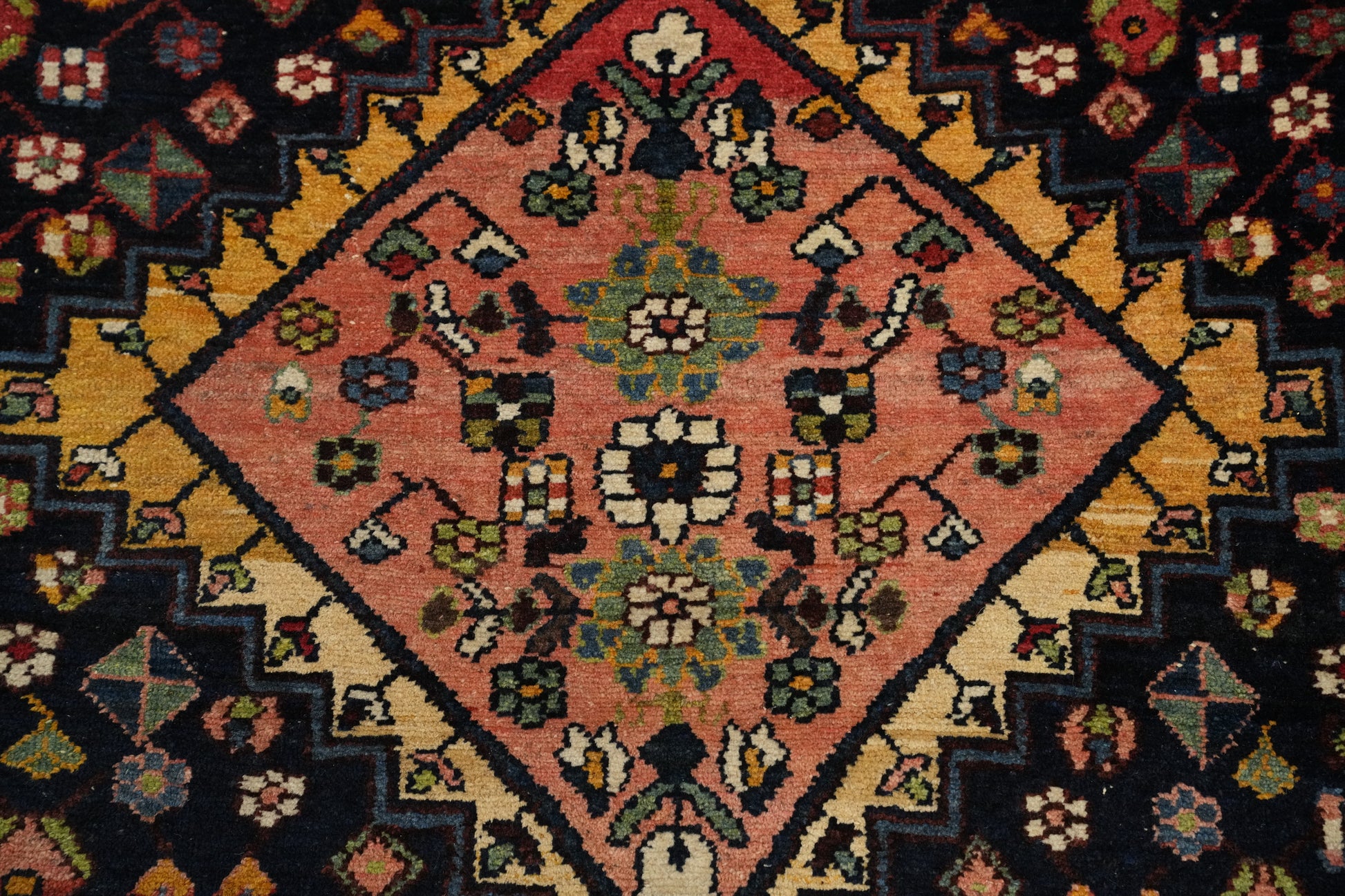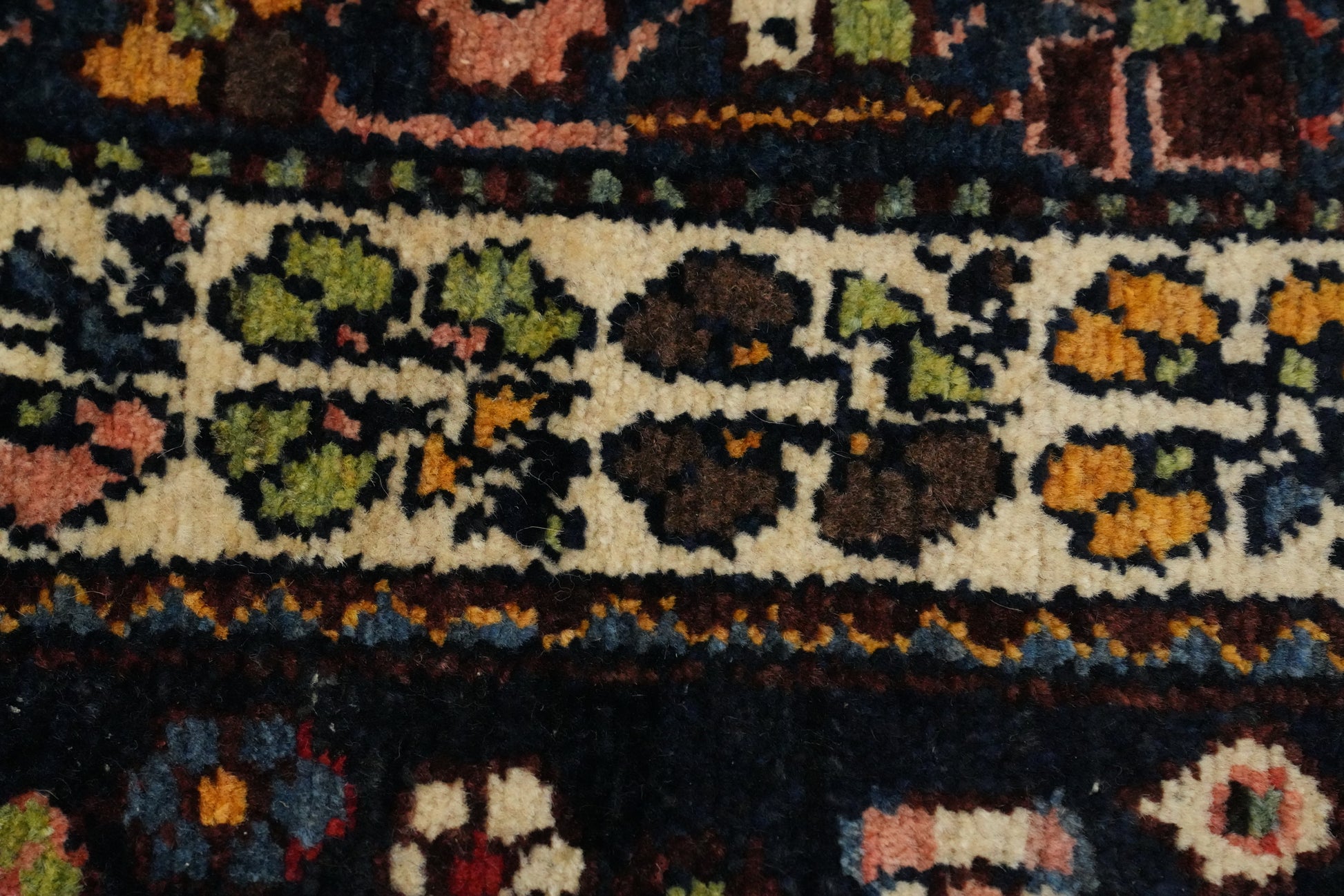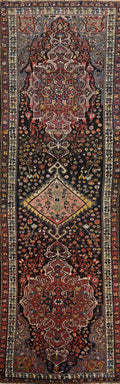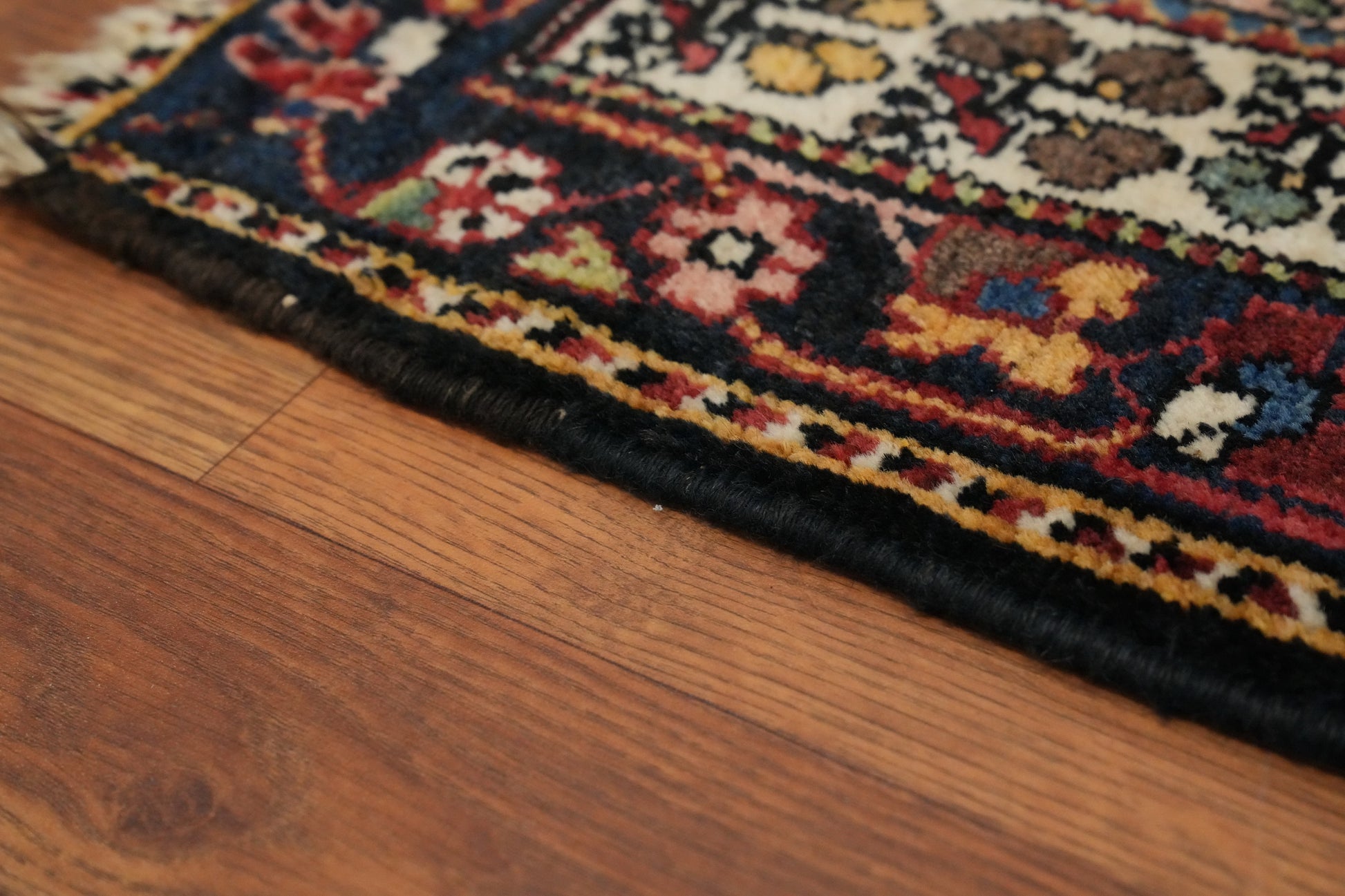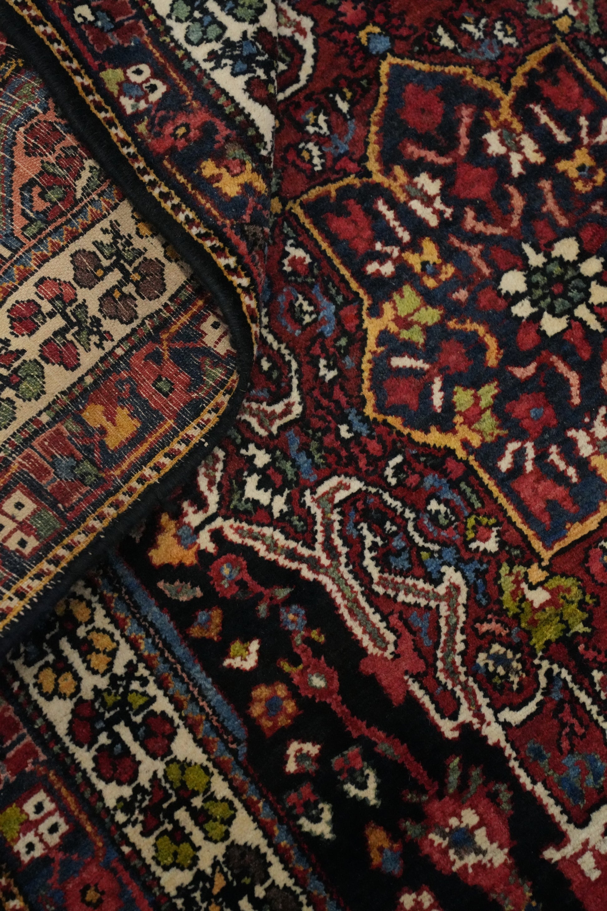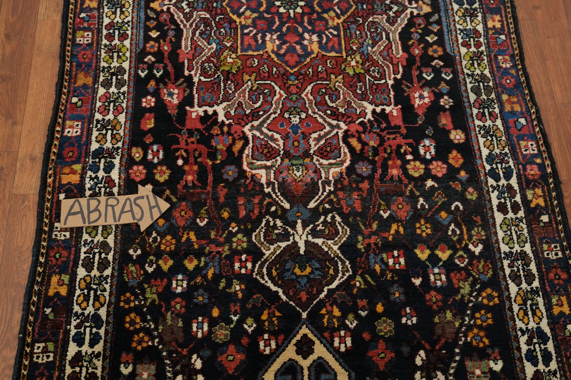 A Beautiful Genuine Persia ( Persia ) Bakhtiari rug is Hand Knotted by skillful weavers in Persia ( Persia ) with 100% Wool Material. This rug is in Very Good (Abrash) condition. dimensions are 14' 7'' X 3' 9'' in foot and 445 X 114 in centimeter. the primary color is Black.