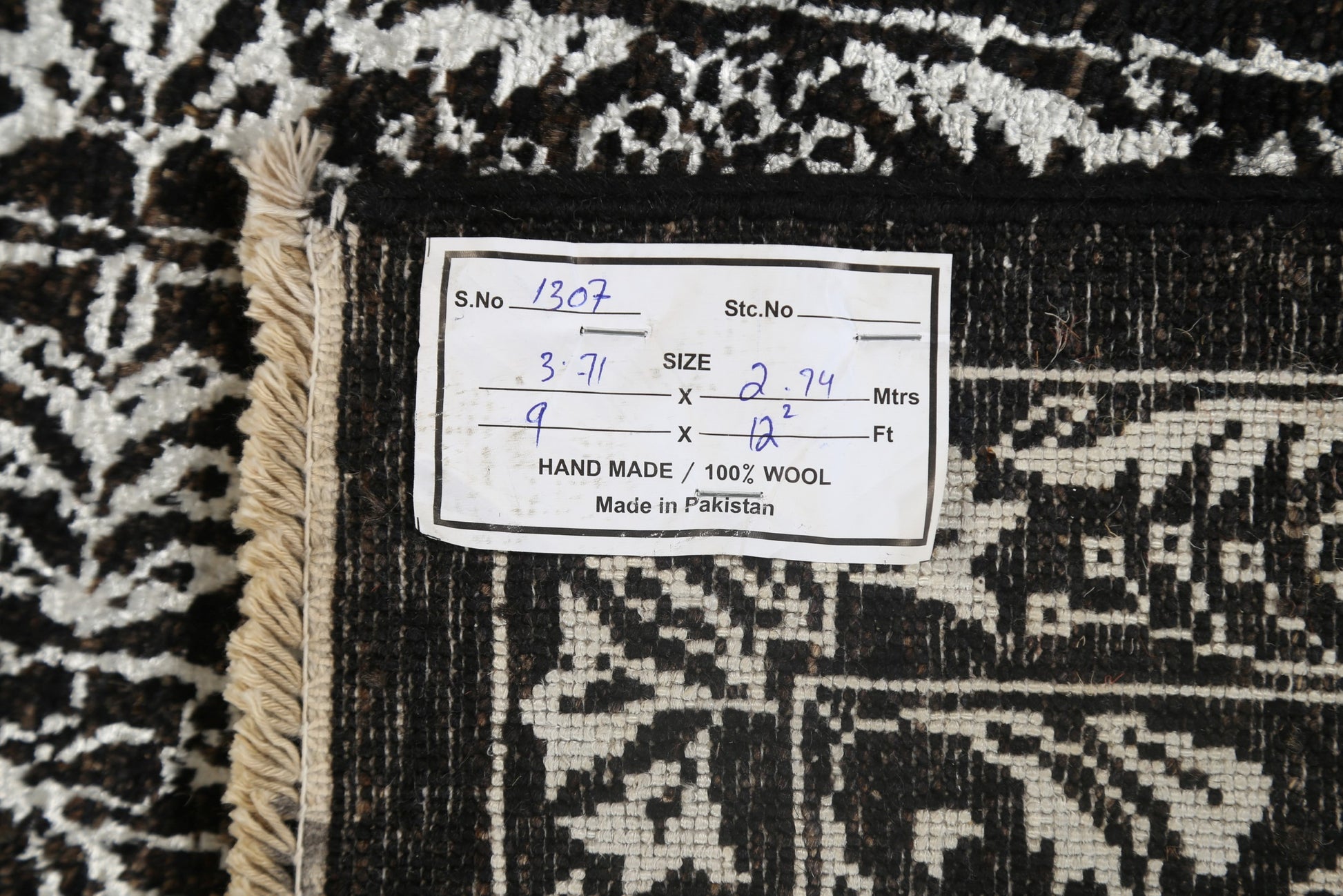 A Beautiful Genuine Pakistan Versace rug is Hand Knotted by skillful weavers in Pakistan with Wool & Silk Material. This rug is in New, First Quality condition. dimensions are 12' 2'' X 9' 0'' in foot and 371 X 274 in centimeter. the primary color is Black.