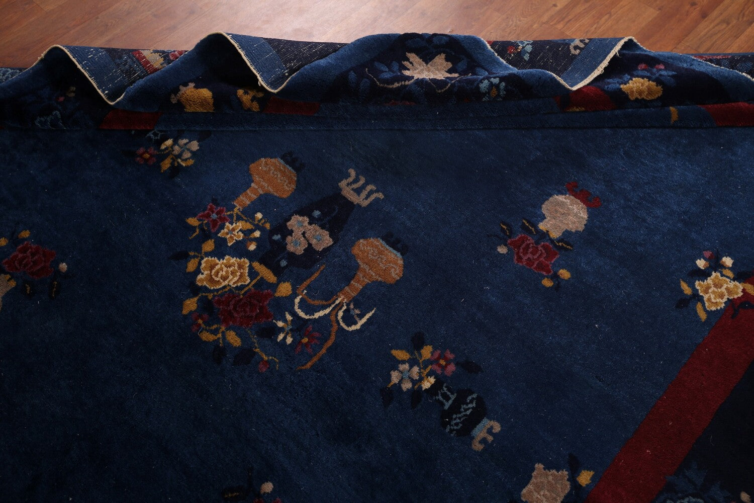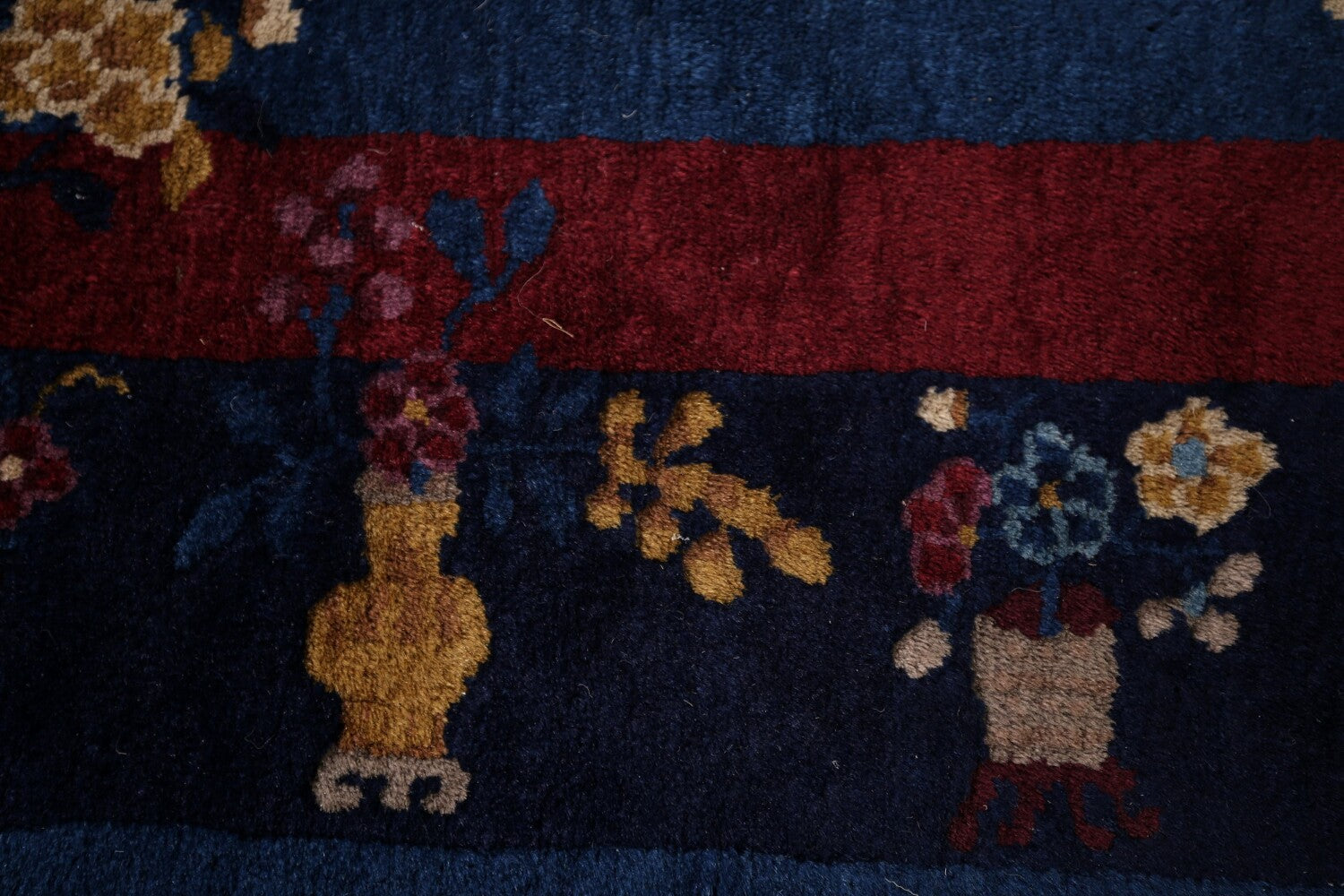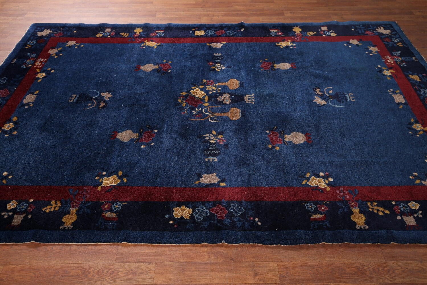 A Beautiful Genuine China Art Deco rug is Hand Knotted by skillful weavers in China with 100% Wool Material. This rug is in Very Good condition. dimensions are 8' 10'' X 6' 1'' in foot and 269 X 185 in centimeter. the primary color is Navy Blue & Blues.