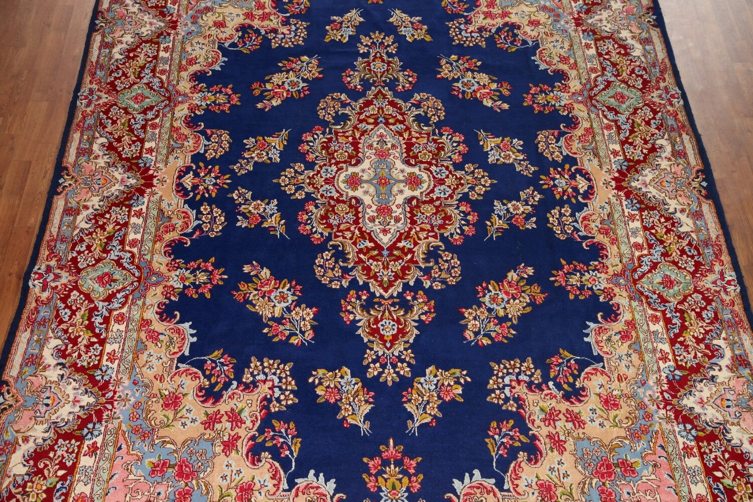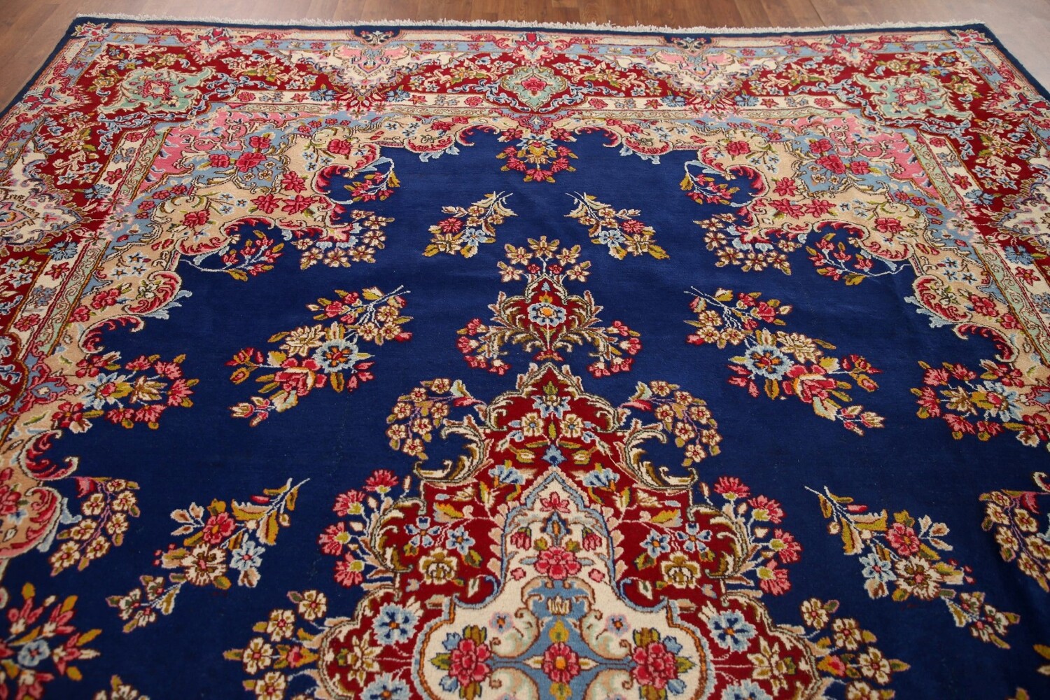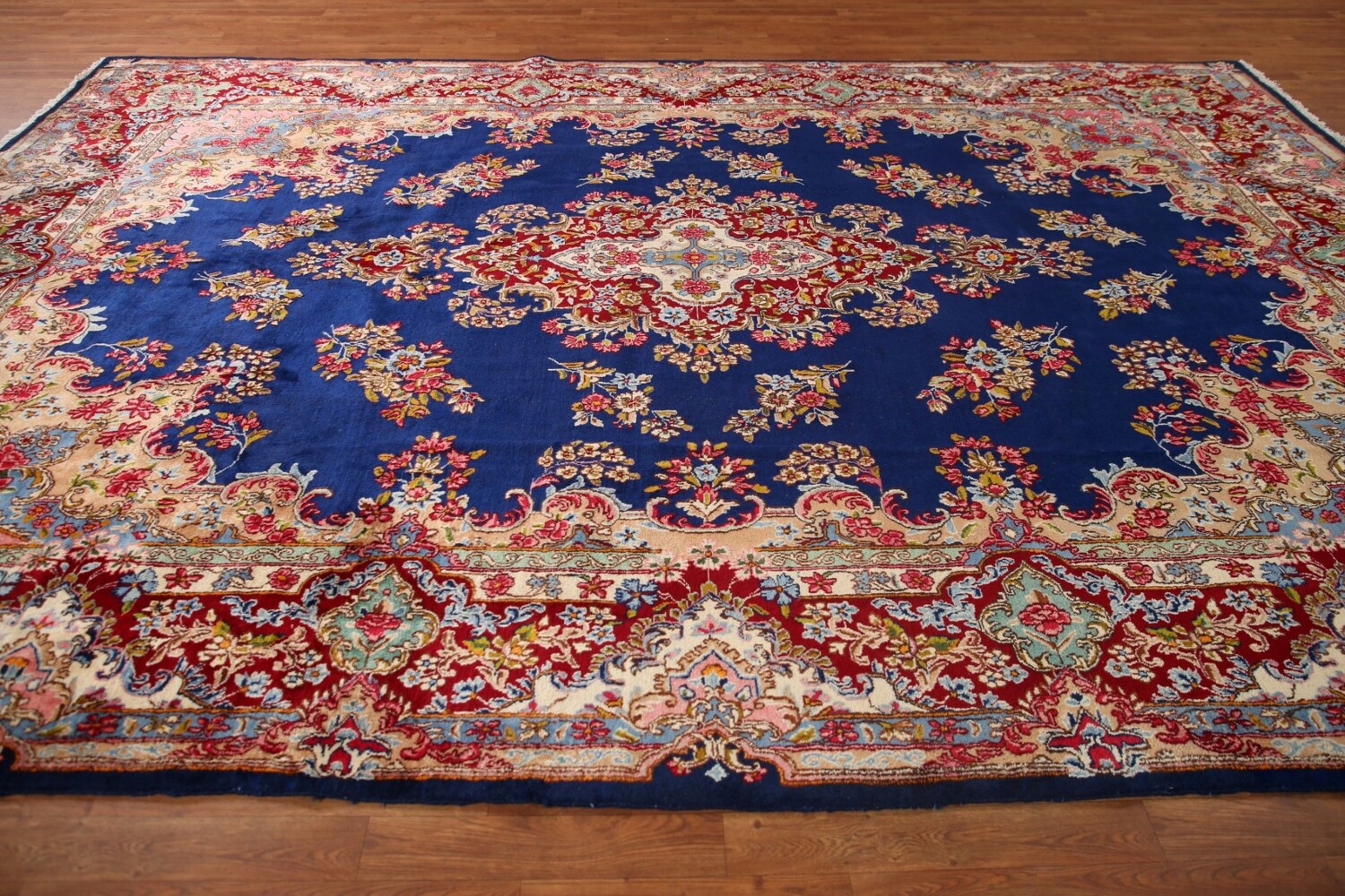 A Beautiful Genuine Persia ( Persia ) Kerman rug is Hand Knotted by skillful weavers in Persia ( Persia ) with 100% Wool Material. This rug is in Very Good condition. dimensions are 13' 0'' X 9' 0'' in foot and 396 X 274 in centimeter. the primary color is Navy Blue & Blues.