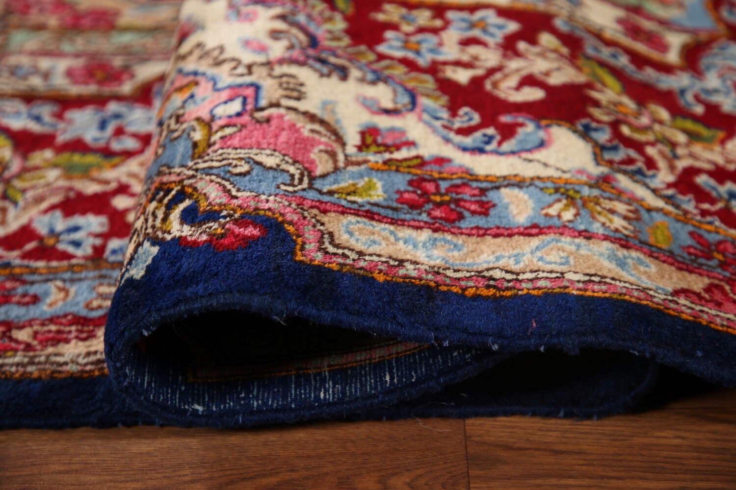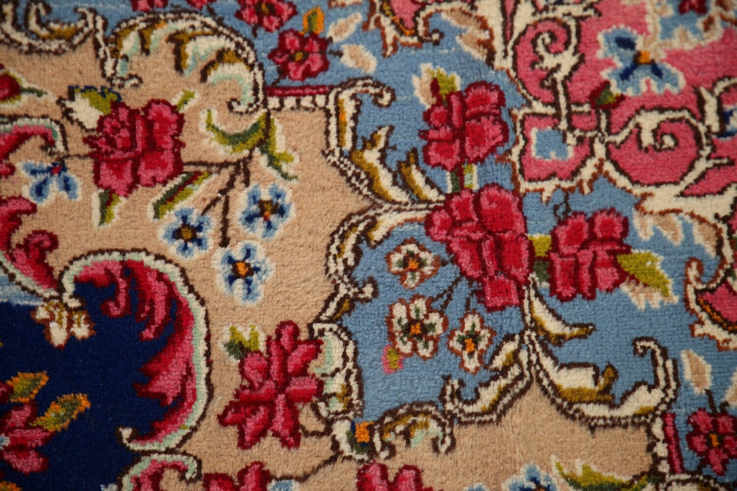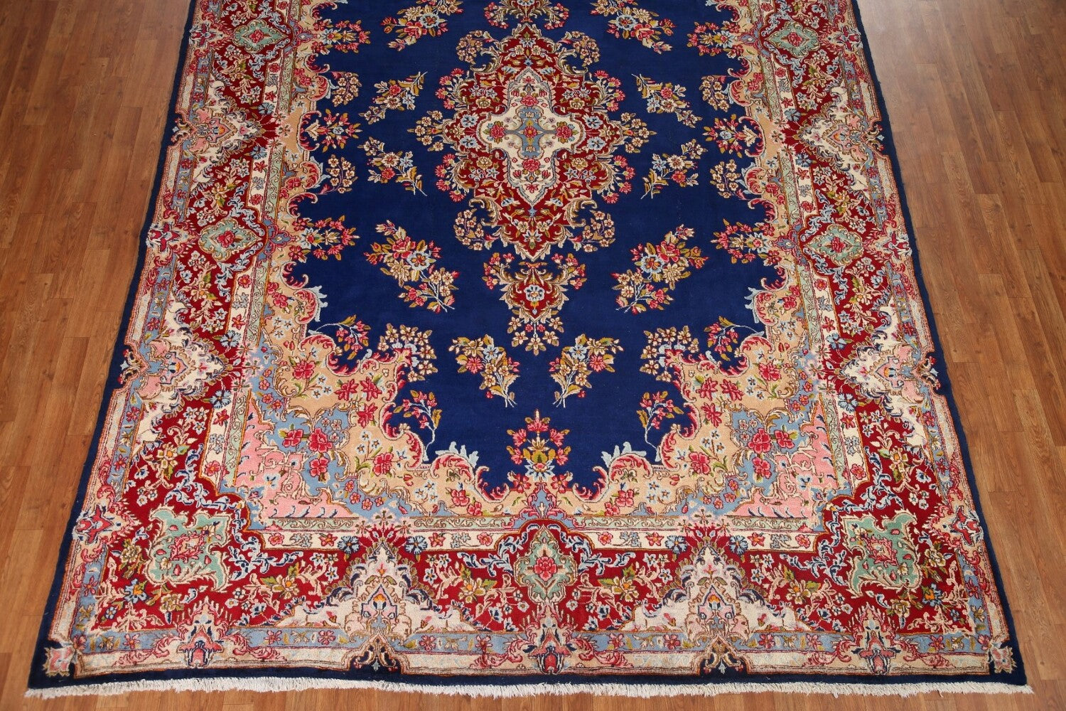 A Beautiful Genuine Persia ( Persia ) Kerman rug is Hand Knotted by skillful weavers in Persia ( Persia ) with 100% Wool Material. This rug is in Very Good condition. dimensions are 13' 0'' X 9' 0'' in foot and 396 X 274 in centimeter. the primary color is Navy Blue & Blues.
