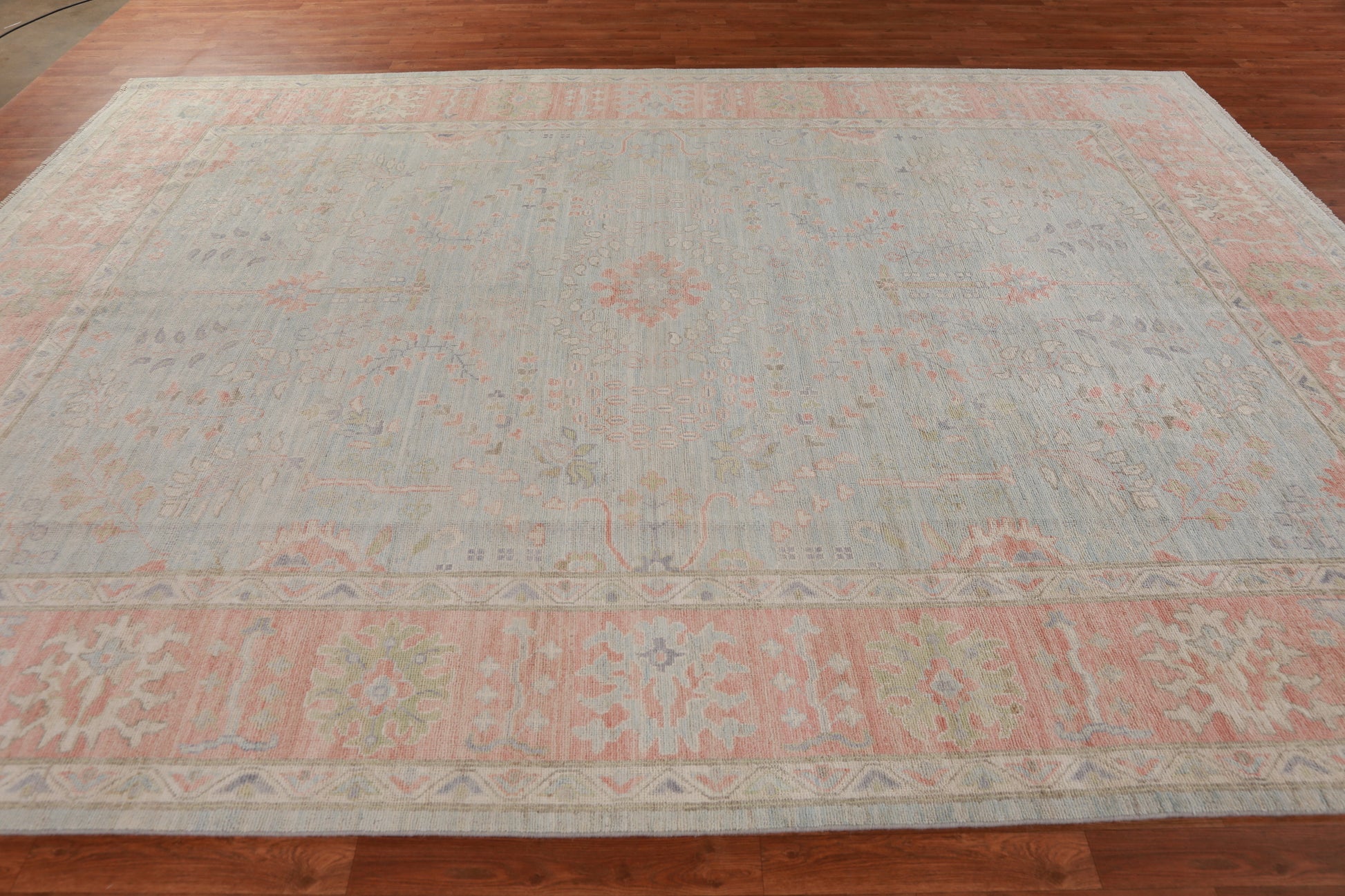 A Beautiful Genuine Turkey Oushak rug is Hand Knotted by skillful weavers in Turkey with 100% Wool Material. This rug is in New, First Quality condition. dimensions are 12' 0'' X 9' 0'' in foot and 366 X 274 in centimeter. the primary color is Navy Blue & Blues.