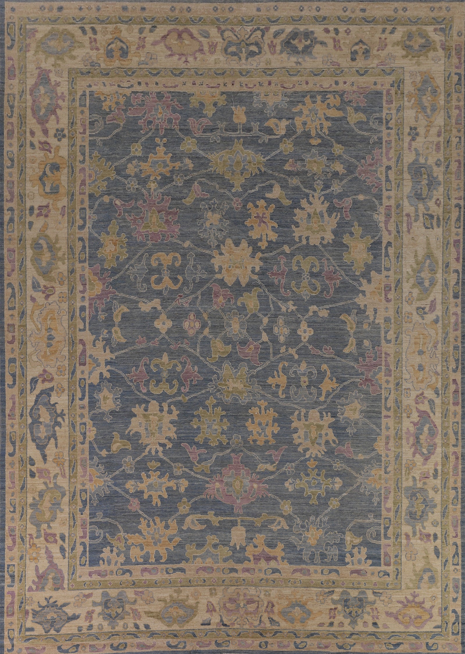 A Beautiful Genuine Turkey Oushak rug is Hand Knotted by skillful weavers in Turkey with 100% Wool Material. This rug is in New, First Quality condition. dimensions are 13' 8'' X 10' 5'' in foot and 417 X 318 in centimeter. the primary color is Navy Blue & Blues.